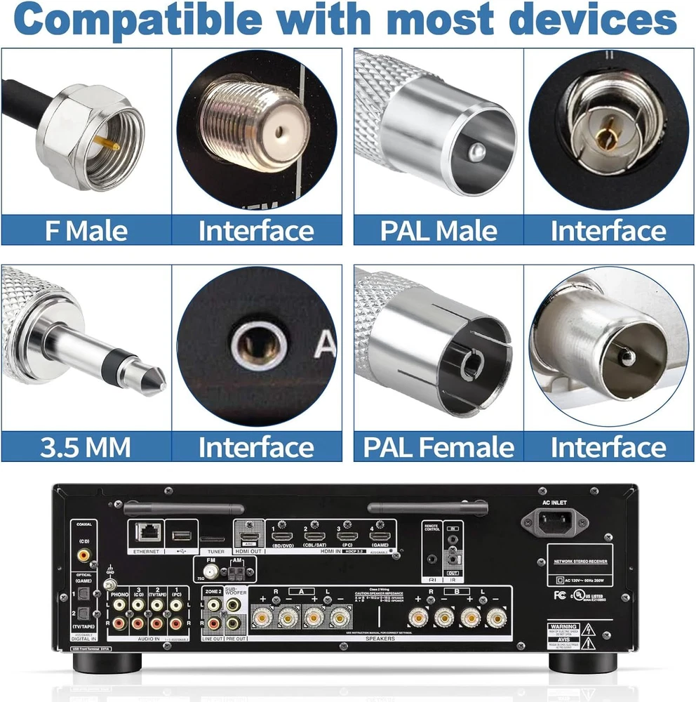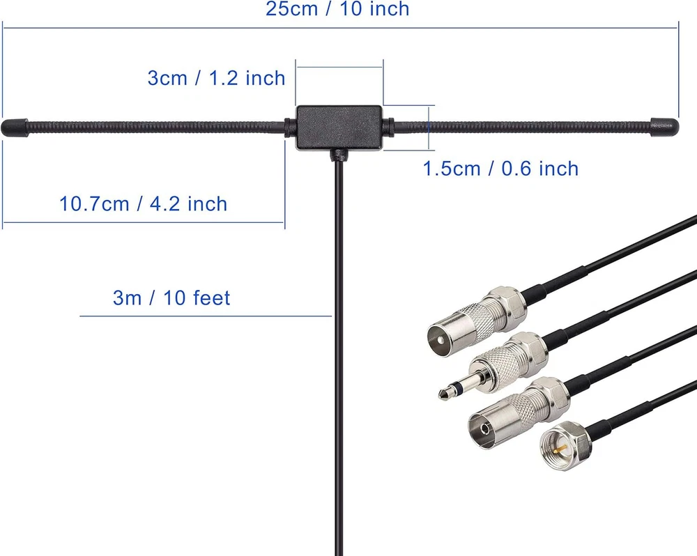 Bingfu FM Radio Dipole Antenna for Stereo Receiver Indoor Pioneer Onkyo Black Product Details Product Dimensions: 6.69 x 4.72 x 0.51 inches Item Weight: 2.89 ounces Manufacturer: Bingfu Country of Origin: China Item model number: BFN00533 Antenna: FM Radio Antenna Brand: BINGFU Color: Black Number of Channels: 1 Impedance: 75 Ohm Maximum Range: 10 Feet UPC: 790404672988 Adhesive Mounting FM Radio Antenna 75 Ohm UNBAL FM Dipole Antenna with Universal Connector and Adapter,for Music System Indoor Radio Bluetooth Stereo Receiver AV Audio video Home Theater Receiver Tuner. Compatible with Yamaha, JVC, Sherwood, Pioneer, Panasonic, Onkyo, Sony, Bose Indoor Sound Radio Home Stereo Audio video Receiver, 75 ohm UNBAL. 10 feet / 3m Coaxial Extension Cable, Antenna Connector Interface: F Type Plug Connector; Included Connector Adapter: TV Female Socket Connector Adapter, 3.5mm Audio Plug Connector Adapter, TV Male Plug Connector Adapter; Easy to install; Adhesive Wall Mounting, Improves FM Radio Stereo Reception; Package List: 1 x Antenna, 3 x Connector Adapters;(As the Picture Shown)