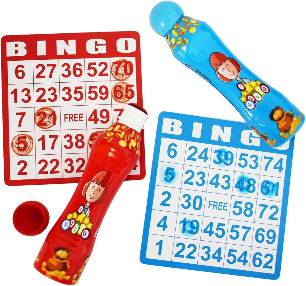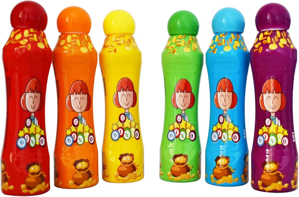 MULTI COLORS:Set of 6 mixed color bingo daubers,filled with premium quality ink that dries in seconds! No mess, no splatter. PREMIUM QUALITY:The leakage-proof dot markers for kids keeps the color fresh for a long time and the large sponge tip will not dry out. SAFE AND EASY TO USE: 3oz/88ml large capacity. Made of non-toxic ink,which are completely safe for children. And kids can easily unscrew the caps. BEST GIFT: Perfect for bingo games! The ink dries quickly so you don't have to worry about smearing your card, you can enjoy the bingo game with your family. FUN AND LEANING: Teachers and Parents can have fun with kids for dot paint projects, Dabbing, Bingo daubing. Product Description Durable Large Sponge Tip The leakage-proof dot markers for kids keeps the color fresh for a long time and the large sponge tip will not dry out. No mess, no splatter! Description: Looking for a fun way to introduce your little kids to coloring? Worrying about the ink smears your hand in the bingo game. Our dot markers are the perfect choice! The bingo daubers are made of non-toxic ink,which are completely safe for children. And kids can easily unscrew the caps. The ink dries quickly,no mess, no splatter.you can enjoy the bingo game with your family. 12 fun colors to choose from, creating colorful designs is a breeze! Packing: color box Meterial: non-toxic ink Colors:red/orange/yellow/apple green/blue/purple Applicable age: 3 years and up Package Included : 6x Bingo daubers Math Skills People can paly the math game by the dot markers and help children to learn numbers. Perfect for the Bingo Game The ink dries quickly so you don't have to worry about smearing your card, you can enjoy the bingo game with your families. Paint the Funny Cartoon Teachers and Parents can have fun with kids for dot paint projects to nurture hand-eye coordination and improve children’s creation.