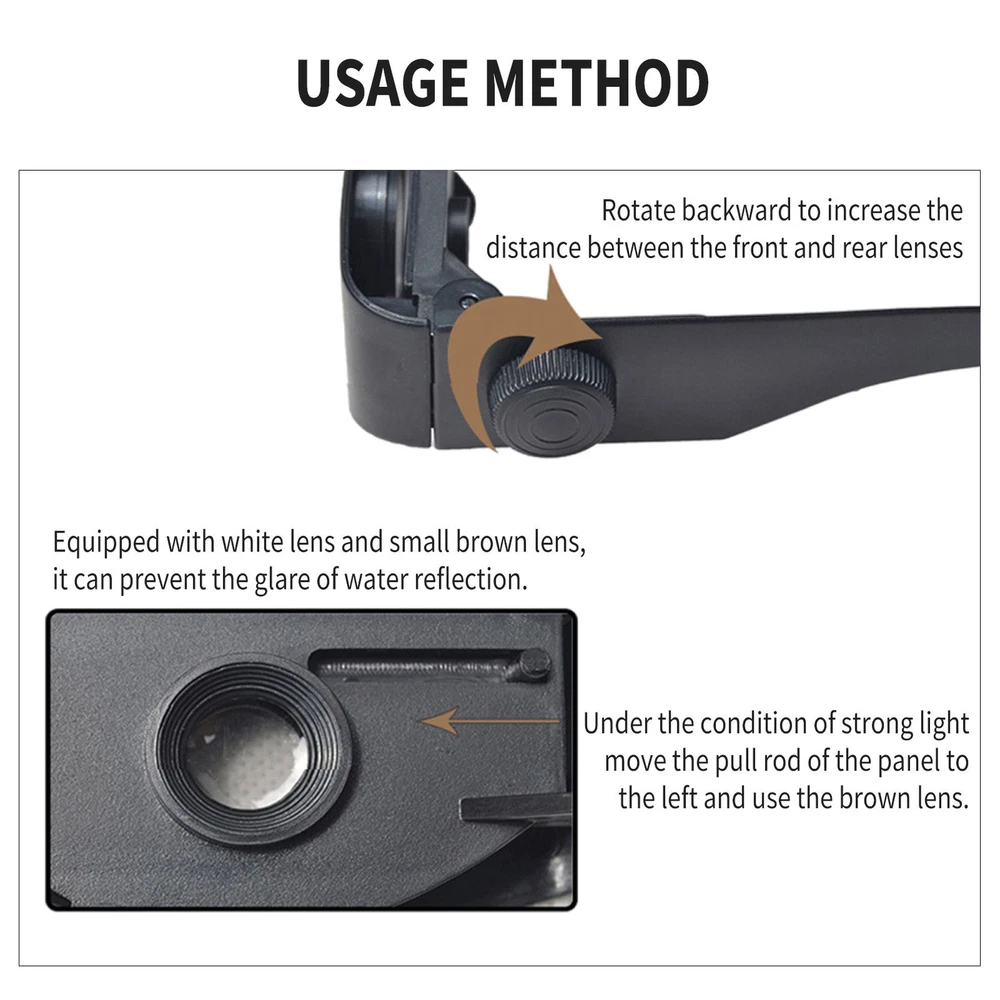 Binocular Glasses Fishing Professional Hands-Free Glasses Telescope Magnifier UK Bullet Points: Special for Viewing - The Professional Binocular Glasses use the working principle of a remote telescope to adjust the focal length on both sides of the frame to obtain clarity. Designed for fishing, bird watching, sports, concerts, theater, TV, and sightseeing. Practical Design - Has very practical designs. Equipped with white lenses and small brown lenses to prevent glare from water reflection. And they can be switched by the push-pull lever inside the frame. Material Information - High-definition optical glass lens, frame lightweight PVC material, with good elasticity, not easy to break and wear, durable and easy to carry. Can be used for a very long time. Binoculars for Fishing - Binoculars for Fishing, are portable, focus adjustment, rear lens shift, yellow filter mode, and white lens mode, making them very suitable for fishing. Wide Usage - Suitable for hiking, climbing, bird watching, watching wildlife and landscapes, golf, concerts, and travel. A great gift for family or friends. Description: The Binocular Glasses use the working principle of a remote telescope to adjust the focal length on both sides of the frame to obtain clarity. Designed for fishing, bird watching, sports, concerts, theater,TV, and sightseeing. Specifications: Name: Binocular Glasses Product size about: 14.5*14cm Weight about: 75g Features: 1. Equipped with a portable adjuster, which is convenient and easy to hold. 2. Uses the working principle of a remote telescope to adjust the focal length on both sides of the frame to obtain clarity. 3. Equipped with white lenses and small brown lenses, which can prevent glare from reflection on the water . The white and brown lenses can be switched by the push-pull lever inside the frame. 4. A special tool for the majority of fishermen, and it is more suitable for blindness and myopia (below 500 degrees). 5. Using the working principle of the remote telescope, the optical focal length system is composed of a specially processed concave-convex spherical lens and a glasses bracket and is adjusted by the focal length adjustment buttons on both sides of the frame, the distance is the largest and clearest. Package List: Binocular*1 OR Binocular*1 Case*1 Tips: 1. Due to the color temperature of the display, camera, ambient light, and photography skills, the pictures of some products may have a slight color difference, and the color is subject to the actual product! 2. Please allow a slight size difference due to different manual measurements. 1.You can make a Credit payment via Paypal.Paypal will let you use MasterCard,Visa to pay. 2.Payment should be completed within 5 days after auction closed, or unpaid dispute will be filed for an closing auction.An unpaid case will be filled after 4 days. ● We strive for 100% customer satisfaction ! ● Positive Feedback is very important to us. ● We hope that you contact us immediately BEFORE you give us neutral or negative feedback, so that we can satisfactorily address your concerns. ● We promise to offer the lowest price and high quality produce. Dear buyers : ● Welcome to my store ! ● Your satisfaction is our top goal,we appreciate your patronizing. ● If you have any questions, please contact us before leave negative or neutral feedback, we will try our best to solve the issue to your satisfaction, thanks ! ● If you are satisfied with our service, please rate the details of the transaction (Detailed Seller Ratings) on eBay. ● Please always talk to us via ebay Message. ● We appreciate your business and look forward to growing our e-Bay sales with satisfied customers.
