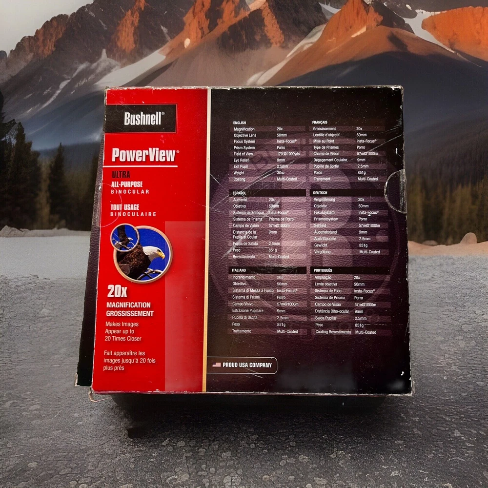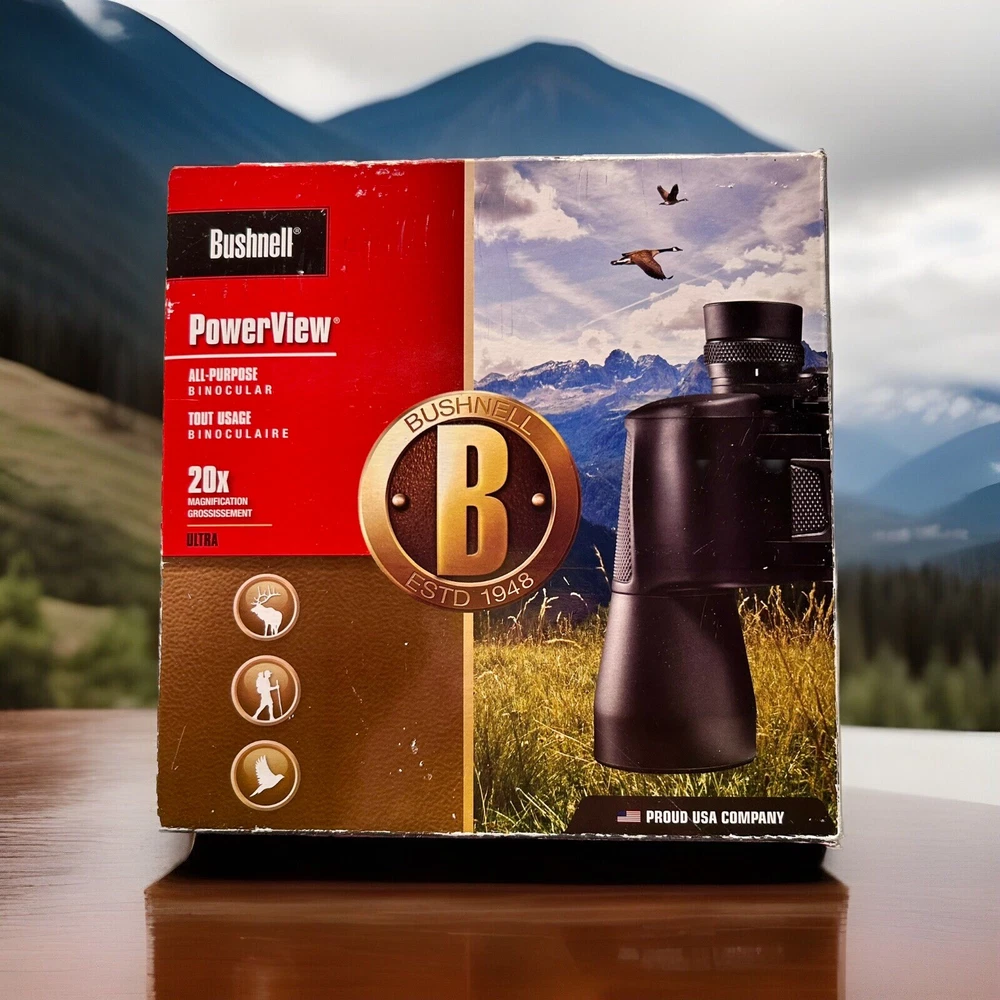 These were mine. I bought them new maybe 13 years ago and never ever used them. I never opened the box until I photographed them. They are real binoculars and not those cheap toys. The box looks rough around the edges from going back and forth in my gun safe. Thanks for looking. Find your perfect view with these Bushnell Powerview binoculars. With a 20x maximum magnification and 50mm objective lens diameter, you'll be able to see every detail you need for your hunting, birding, or general purpose activities. The anti-reflection coating ensures that you'll have a clear and unobstructed view, while the porro prism optical design provides a comfortable and stable view. These full-size binoculars are made by the trusted brand Bushnell, and are proudly made in the USA.