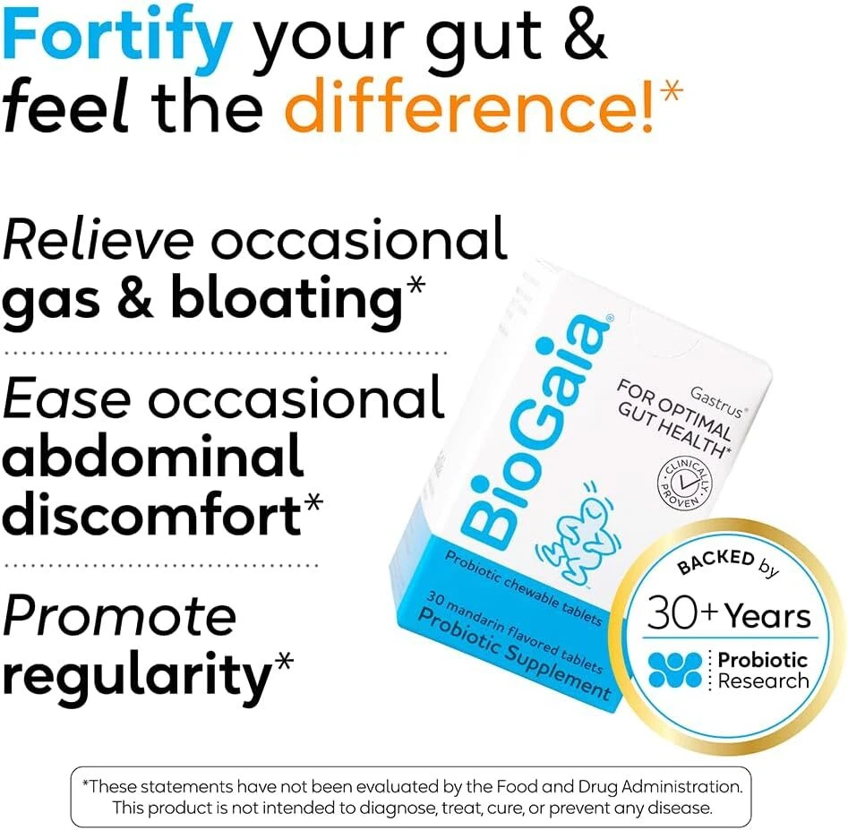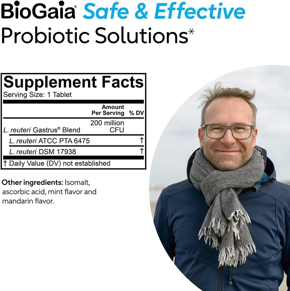 DUAL-ACTION PROBIOTIC EASES ABDOMINAL DISCOMFORT, GAS & BLOATING: If you struggle with occasional GI issues, our gut-health supporting probiotic is a game changer.* BioGaia promotes a balanced GI microbiome, easing abdominal discomfort, gas & bloating.* PROMOTES REGULARITY: By integrating our probiotic into your daily routine, you’ll promote a healthy gut environment, making it easier to maintain consistent & comfortable bowel movements.* CONTRIBUTES TO A HEALTHY GI SYSTEM & SUPPORTS A BALANCED MICROBIOME: Our powerful probiotic strains reinforce your GI microbiome to promote better GI balance & optimal GI motility.* ENHANCES QUALITY OF LIFE & FOSTERS A HEALTHY GUT-BRAIN CONNECTION: Eases GI symptom-related anxiety & helps to reduce GI sensitivity for a better quality of life.* All thanks to a strengthened gut-brain connection. BACKED BY 30+ YEARS OF PROBIOTIC RESEARCH: Clinically tested & scientifically validated. Our dual-action probiotic contains two patented strains that work together to promote optimal gut health.* Important information Safety Information This product is labelled to United States standards and may differ from similar products sold elsewhere in its ingredients, labeling and allergen warnings Ingredients Isomalt, L. reuteri Gastrus Blend (L. reuteri ATCC PTA 6475 and L. reuteri DSM 17938), ascorbic acid, mint flavor and mandarin flavor. Directions Chew one tablet a day, or as directed by your health care professional. Use regularly for good stomach health or when temporary stomach discomfort occurs.* Legal Disclaimer * These statements have not been evaluated by the Food and Drug Administration. This product is not intended to diagnose, treat, cure, or prevent any disease. Statements regarding dietary supplements have not been evaluated by the FDA and are not intended to diagnose, treat, cure, or prevent any disease or health condition.
