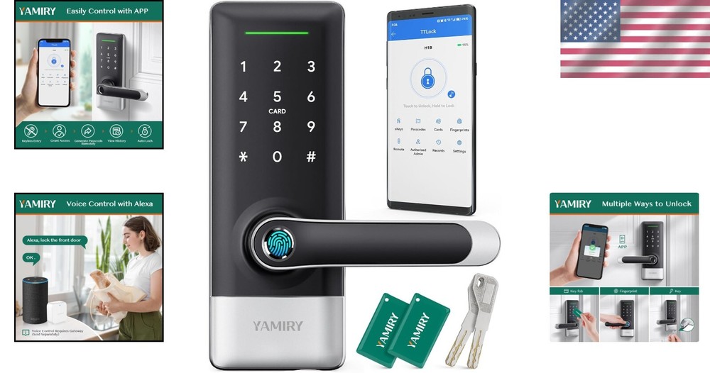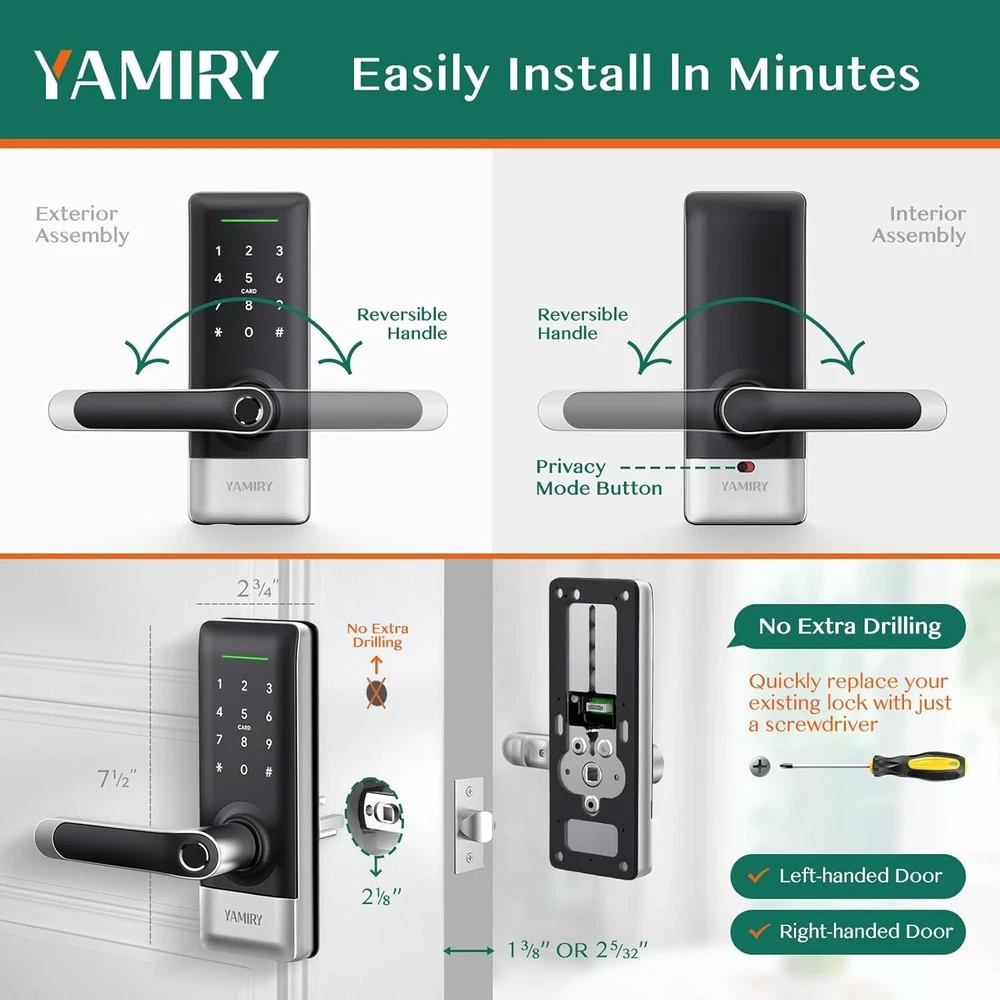 Control Method: App Material: Stainless Steel, Aluminum Brand: Unbranded Suitable For: Rental Apartment, Office, Home, Airbnb Color: Silver Number Of Pieces: 24 Item Weight: 1 lb Shape: Rectangular Finish: Painted Item Dimensions L X W X H: 7.48 X 2.75 X 0.75 Inches UPC: Does Not Apply Controller Type: Google Assistant, Amazon Alexa, Ios, Android Batteries Included?: No Finish Type: Painted Product Dimensions: 7.48 X 2.75 X 0.75 Inches Door Handing: Universal/Reversible Item Depth: 0.75 in Items Included: Exterior Handle, Interior Handle, Latch, User Manual, Backup Key, IC Card, Screw Set gtin13: Does Not Apply Batteries: 4 Aa Batteries Required. Mounting: Universal Cross Bore Diameter: 7.48 in Fixings Supplied: Yes Type: Smart Door Lock Connectivity Protocol: Bluetooth Lock Type: Keyless Entry, Keyed Access Number in Pack: 1 Recommended Uses For Product: Home, Airbnb, Rental Apartment, Office Features: Biometric Fingerprint, Keyless, Easy Installation, Smartphone Control, Remote Access, Alexa Compatible Batteries Required?: Yes