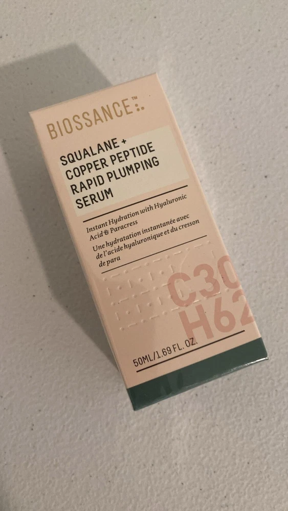 Biossance Squalane + Copper Peptide Rapid Plumping Serum. 1.69 oz - New in box And Sealed. Biossance Squalane + Copper Peptide Rapid Plumping Serum. Powerfully Hydrating Face Serum that Instantly Plumps and Firms with Collagen Boosting Copper Peptides, 1.69 fl oz About this item Biossance Squalane + Copper Peptide Rapid Plumping Serum. Get immediate and lasting hydration powered by our proprietary Rapid Plumping Complex that floods skin with 3 super-hydrators for supreme moisture. Bounce in a Bottle. The non-sticky, silky blue elixir glides onto skin and is absorbed. The serum supplies more hydration than traditional hyaluronic acid serums that can’t maintain moisture. Made with Natural and Effective Ingredients. Copper Peptides support collagen and elastin production for firmer, smoother-looking skin while a blend of hyaluronic acid, polyglutamic acid, and sugarcane squalane plump skin. Part of Your Daily Skincare Routine. Massage one dropper full of the serum onto cleansed face, neck and chest for unstoppable, unparalleled hydration. It can be used morning and night. Committed to Clean Beauty. As part of Biossance’s commitment to high standards for your skin and the environment, all products are vegan, cruelty free and made without paraben or synthetic fragrances or PEG.