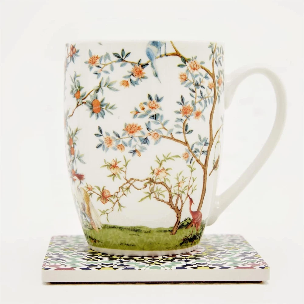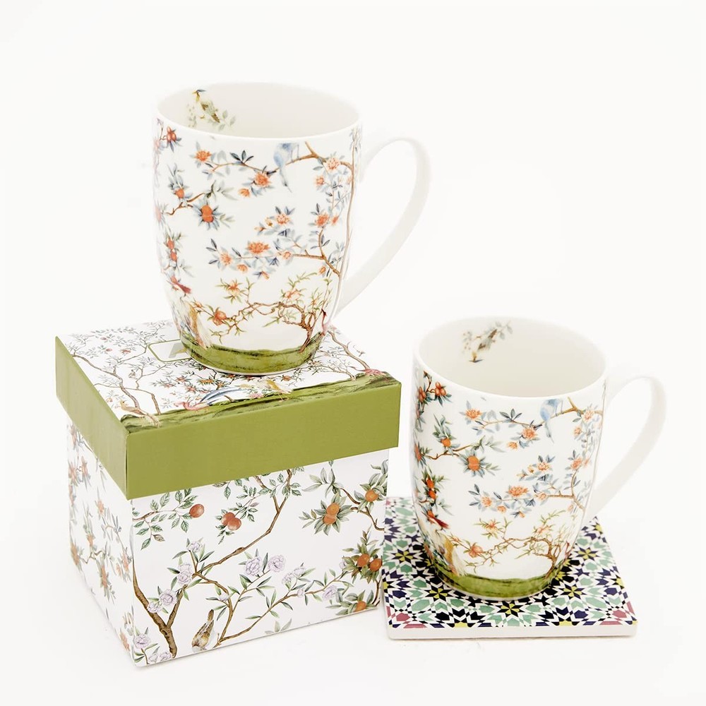 ★ Fine China Coffee Mug Set – Bird and Branch Flower Teacup Design – 2Pack Porcelain Tea Cups with Gift Box ★ Specifications: Material: Fine china, New Bone china Food safe: pass 84/500/EEC. Features 1.100% brand new, high quality mug, unique pattern, beautiful ! 2. Abrasion Resistance, skid resistance, antisepsis and moisture proof. 3. Motifs : Birds, garden, purple flower, orange fruit, green grass, pink flowers etc. Make a great decoration for your home, kitchen and so on. Match any decor and suitable for all table, and enhances any occasions . 4. Elegant looking of the mug shape. 5. CONVENIENT USE: Durable high quality fine China coffee mug with easy grip handle, well balanced and comfortable in your hand just like in the restaurant. Packing Included: 2pack coffee mug made of Fine china with gift box perfect for your friends or family on Valentine's Day, Mother's Day, Birthday, Anniversary, Christmas, New Year, etc. Warm tips: EASY CARE & MAINTENANCE: Safe enough for Dishwasher Microwave Freezer. It is made of fine China and is oven safe to 160 Degree PACKAGE INCLUDES - Set of 2 delicate Coffee Mugs made of Fine Bone China and the capacity of the mug is 10 OZ & 12 OZ for optional SAFETY MATERIAL - The Fine China Mug is made of very high quality new bone china that bring a sophisticated look to any home or afternoon tea party. It’s Dishwasher, microwave and oven use safe. The fine china mug is compliance with 84/500/EEC. CONVENIENT USE - Durable high quality fine bone China coffee mug with easy grip handle, well balanced and comfortable in your hand just like in the restaurant. UNIQUE DESIGN - The Fine China Mugs designed with bird & branch Chinoiserie Perfect for tea/coffee at dinner parties, in the home or even the office PERFECT GIFT – Our exquisite mugs make a delightful gift for coffee and tea drinkers, Tankard mug holds approximately 10 fluid ounces and Bullet mug holds approximately 12 fluid ounces