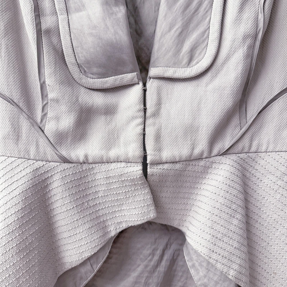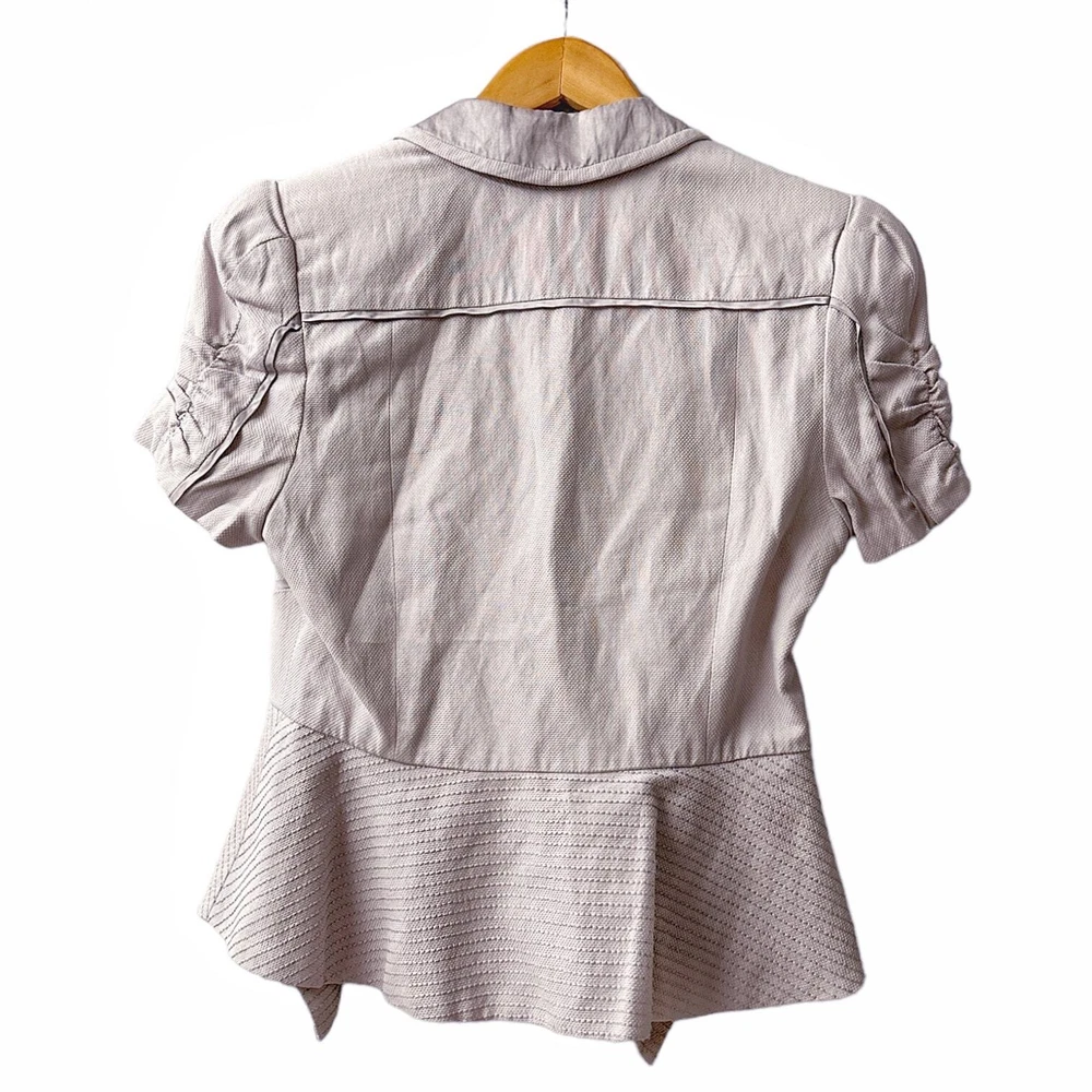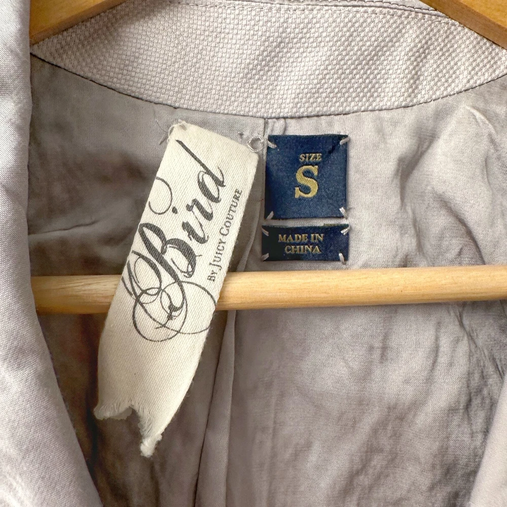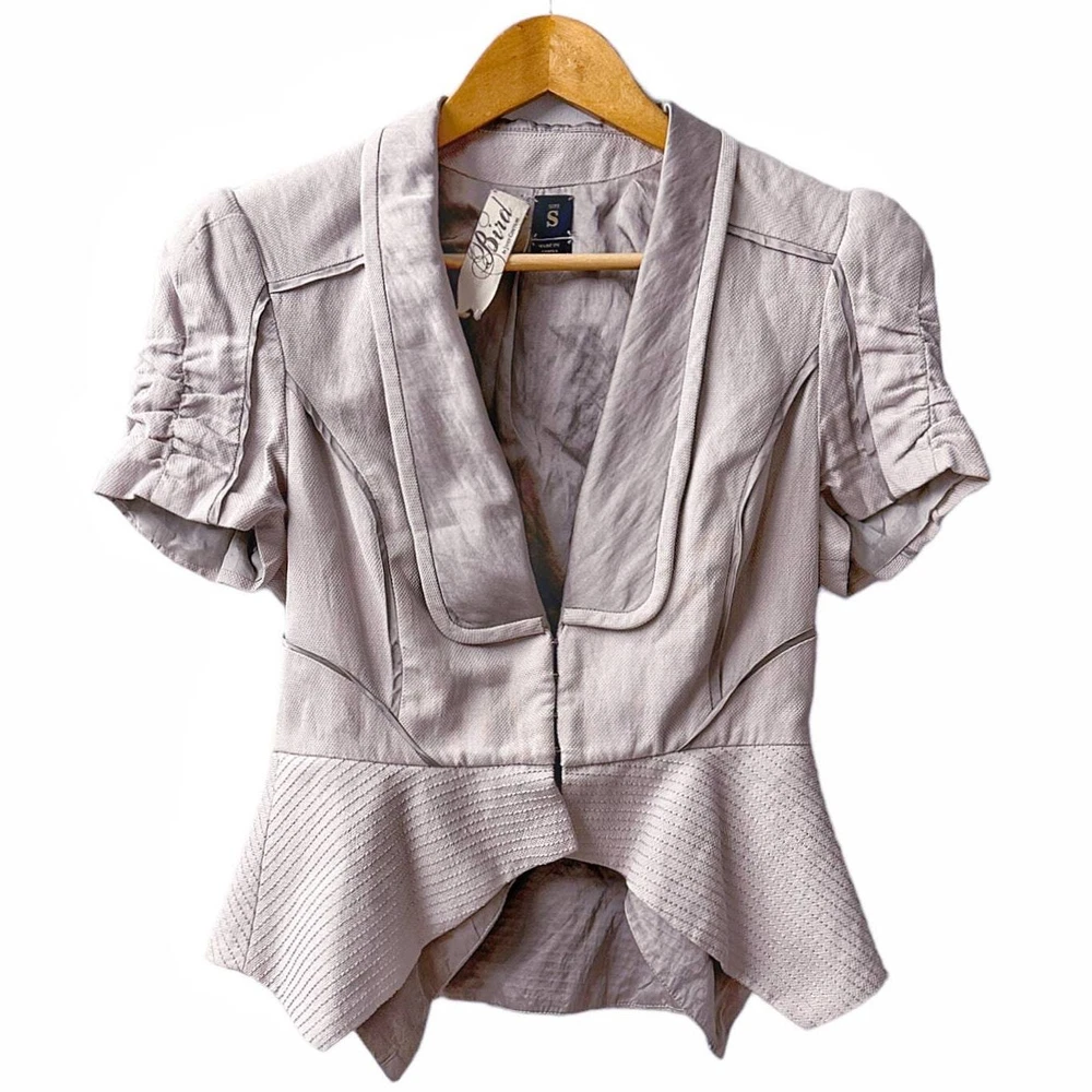 Worn by celebrities like Katie Holmes, Bird by Couture was introduced as the older, more grown-up sister of Juicy Couture, whose style is a little more sophisticated, but who still loves clothes with a little bit of edge to them. - Shawl collar - Oversized hook-and-eye closure - Flattering seaming detail - Ruched puff short sleeves - Handkerchief layered peplum - Stitching detail - Cotton / viscose / metal fiber - Size S Even though this piece is from 2011, this piece was seen on, I'm not kidding, a South African telenovela called Diepe Waters that launched last year! Excellent condition, like new!