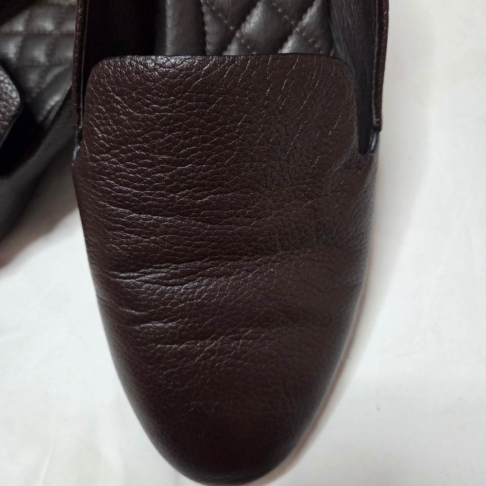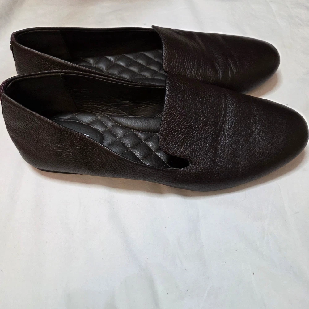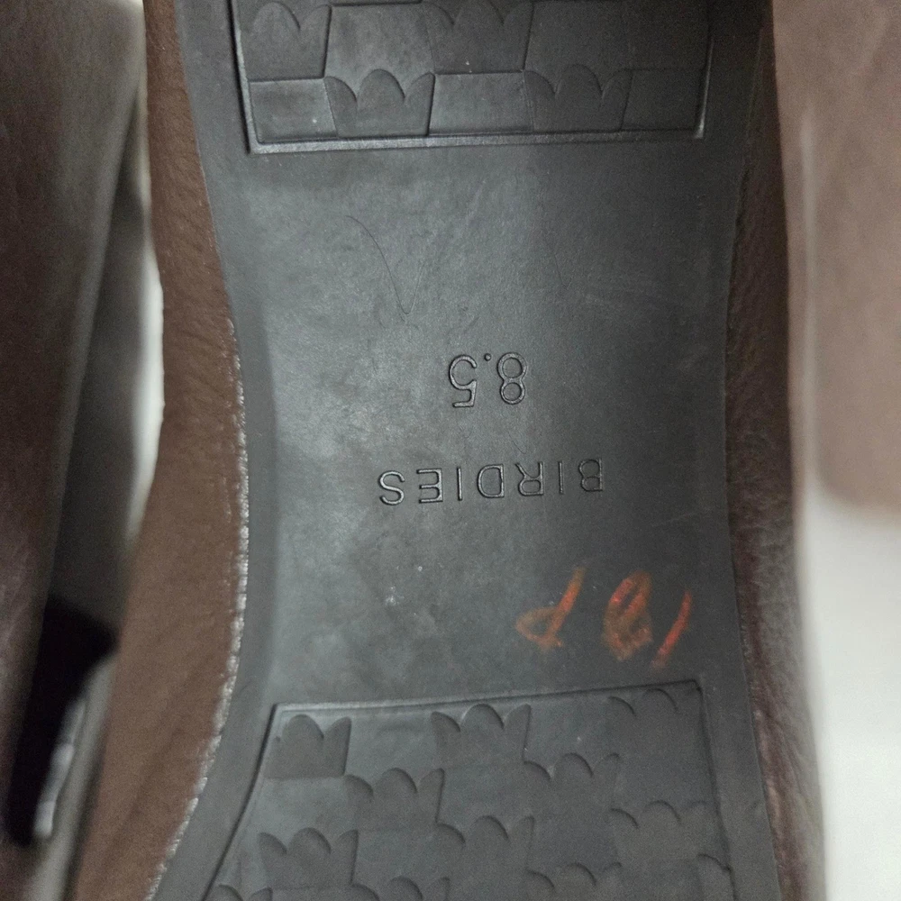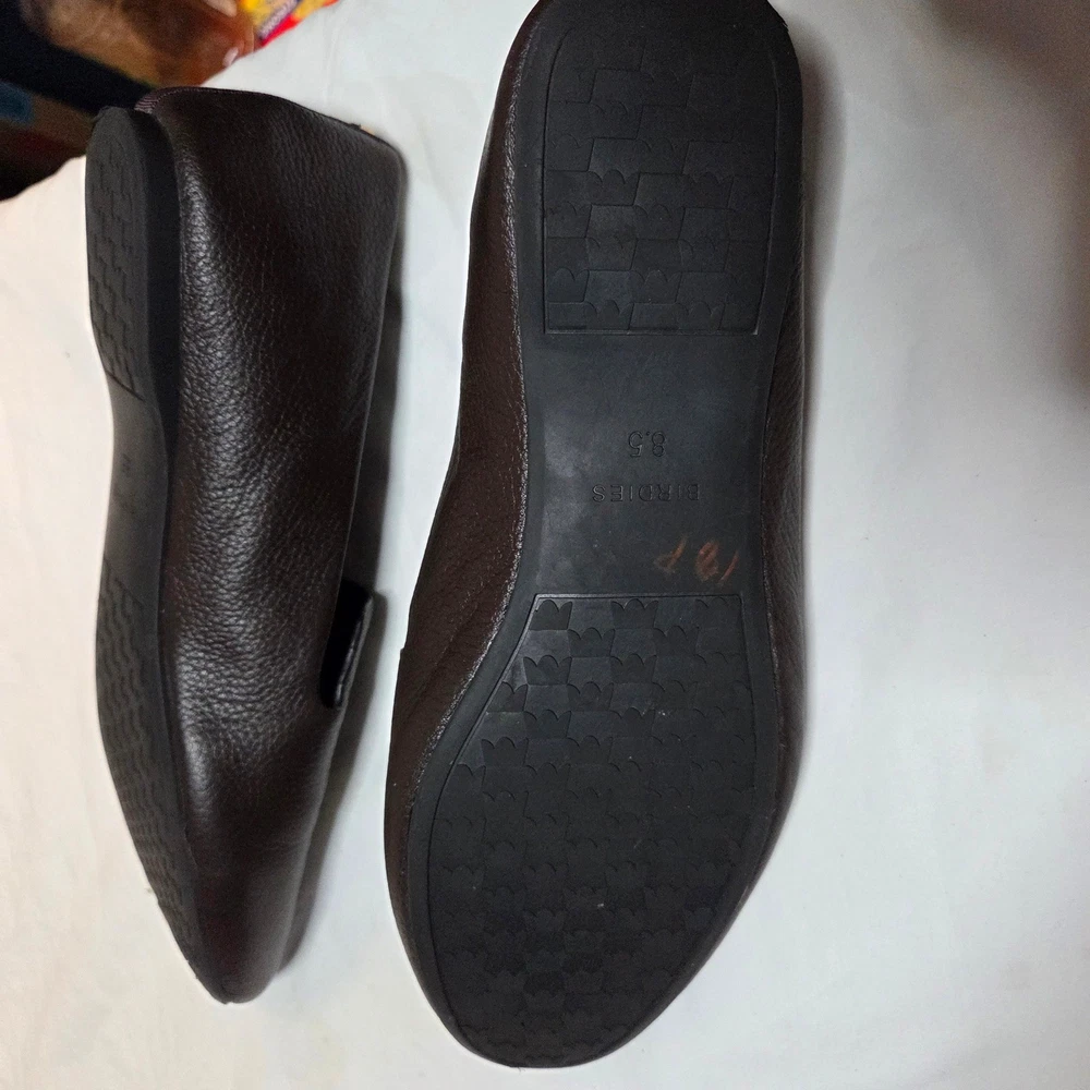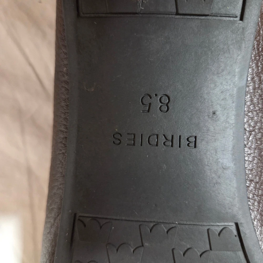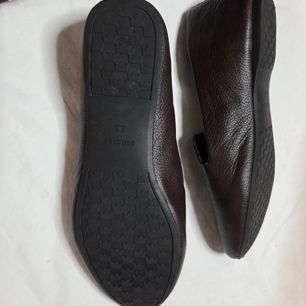 Step into sophisticated comfort with these Birdies The Starling loafers. The rich dark brown pebbled leather upper exudes timeless elegance, while the quilted footbed offers plush cushioning with every stride. Designed for effortless wear, these flats feature a classic loafer silhouette with a subtle V-cut vamp, making them perfect for transitioning from a busy workday to a relaxed evening out. Elevate your everyday style for brunch with friends or a casual stroll through the city. Measurements: • Insole Length: 9.75 in • Insole Width (widest point): 3.25 in • Heel Height: 0.5 in Style: Loafer Department: Women Upper Material: Leather UK Shoe Size: 6.5 AU Shoe Size: 6.5 Features: Padded, Cushioned, Lined Occasion: Workwear, Casual Insole Material: Fabric Lining Material: Leather Outsole Material: Rubber Type: Flat Closure: Slip On Toe Shape: Closed Toe Pattern: Solid Accents: Quilted, Logo Keywords: Birdies loafers, leather flats, quilted interior, pebbled leather, dark brown shoes, womens loafers, comfortable flats, slip on shoes, everyday flats, classic style, business casual, weekend wear