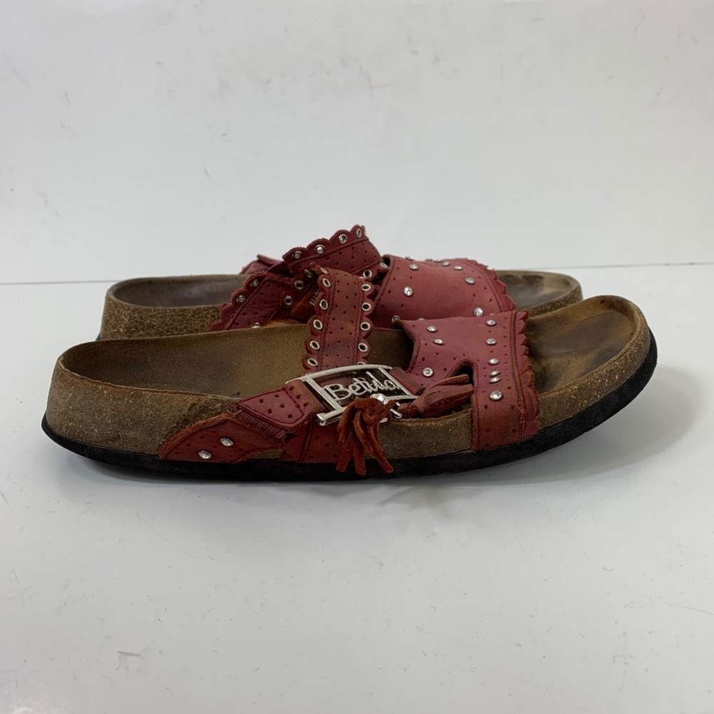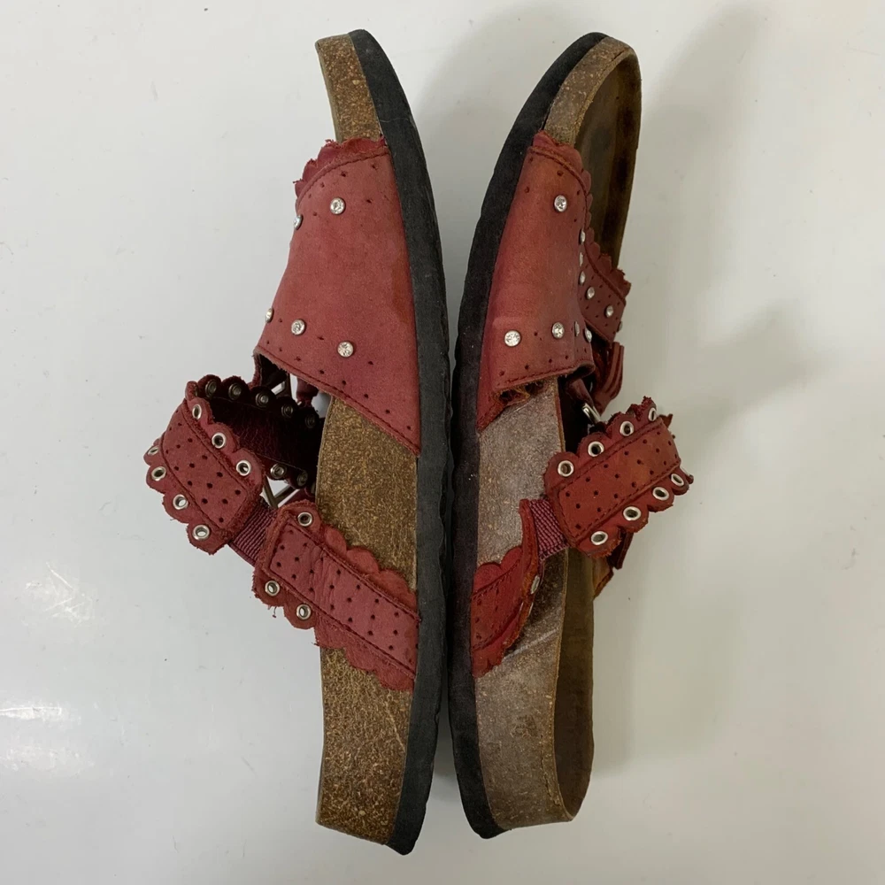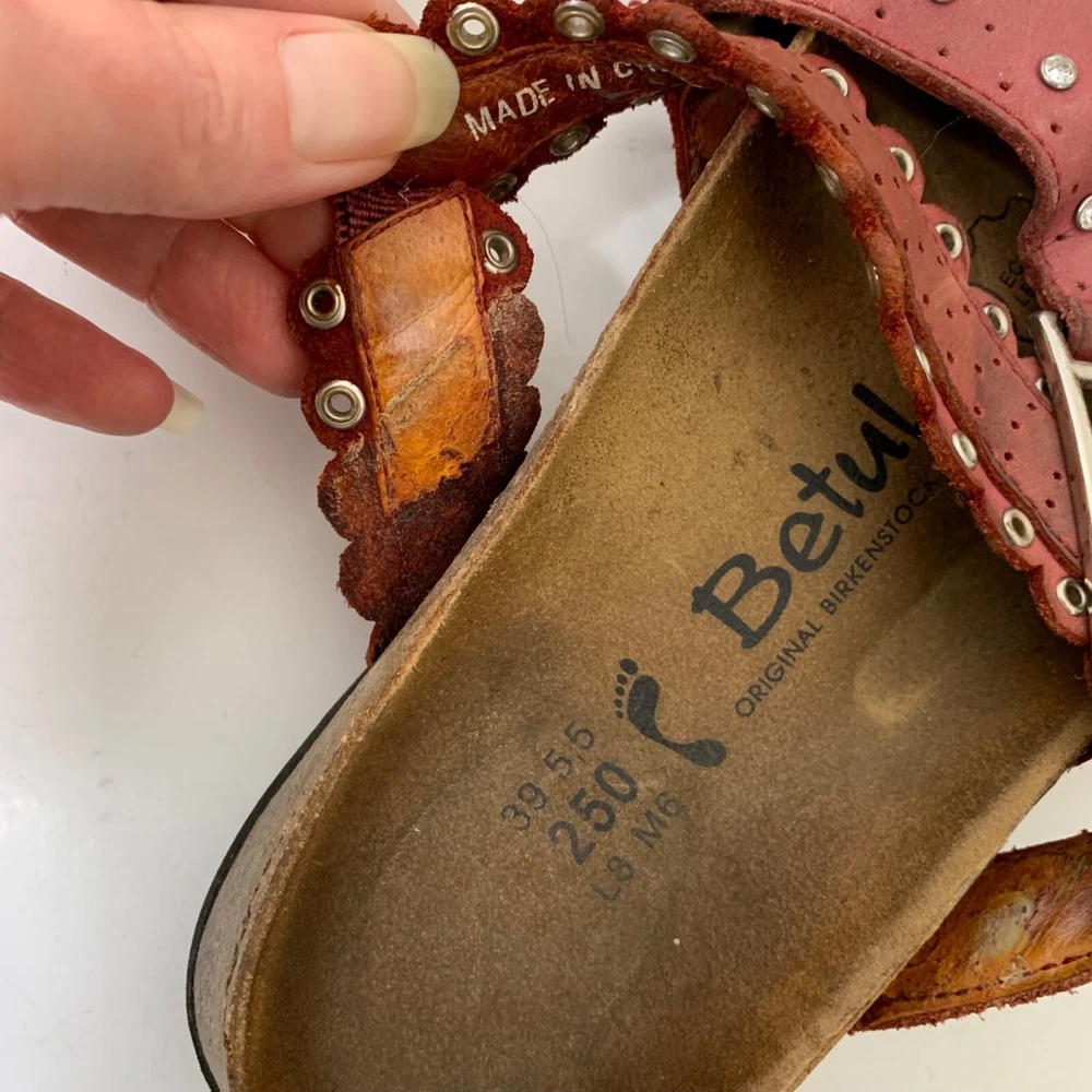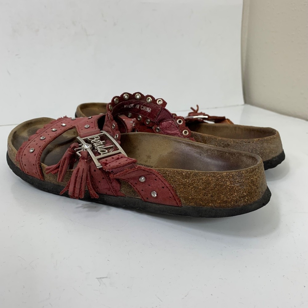 Birkinstock Betula Studded Sandals in Marroon - Size W8, M6 The straps are coming away from the sides a little bit. Besides that, they’re in great preowned condition! Women’s 8, Men’s 6 Betula metal piece with faux crystal and tassels Rhinestone studded Open toe 1P30 7-3588 1 lb 5 oz Tags: casual, summer, bling