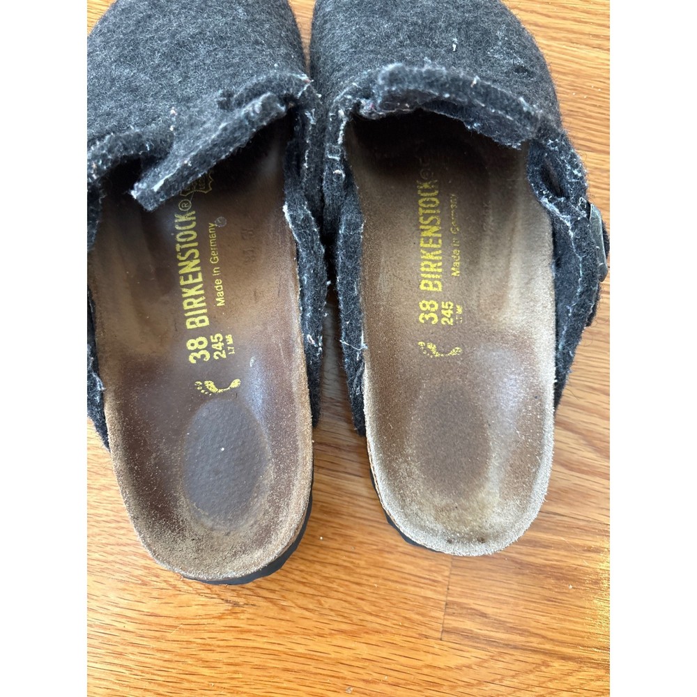 Birkenstock mules in charcoal gray felt wool. These slip-on clogs feature the iconic contoured footbed for comfort and support, with an adjustable strap across the vamp for a customizable fit. Perfect for cozy days at home or casual outings. Measurements: • Insole length: 9.75 in • Width at widest point: 3.75 in Style: Clog Department: Unisex Adults Upper Material: Wool Blend UK Shoe Size: 6 AU Shoe Size: 9.5 Lining Material: Fabric Insole Material: Cork Pattern: Flecked Fabric Type: Felt EU Shoe Size: 38 Heel Height: Flat (Under 1 in) Type: Slipper Features: Comfort, Cushioned, Lined, Adjustable Strap Outsole Material: Rubber Keywords: Birkenstock clogs, Felt mules, Wool clogs, Charcoal gray shoes, Comfort clogs, Slip on shoes, Casual footwear, House shoes, European size 38, Birkenstock Arizona felt, Cozy slippers, Winter clogs