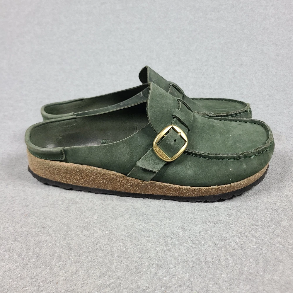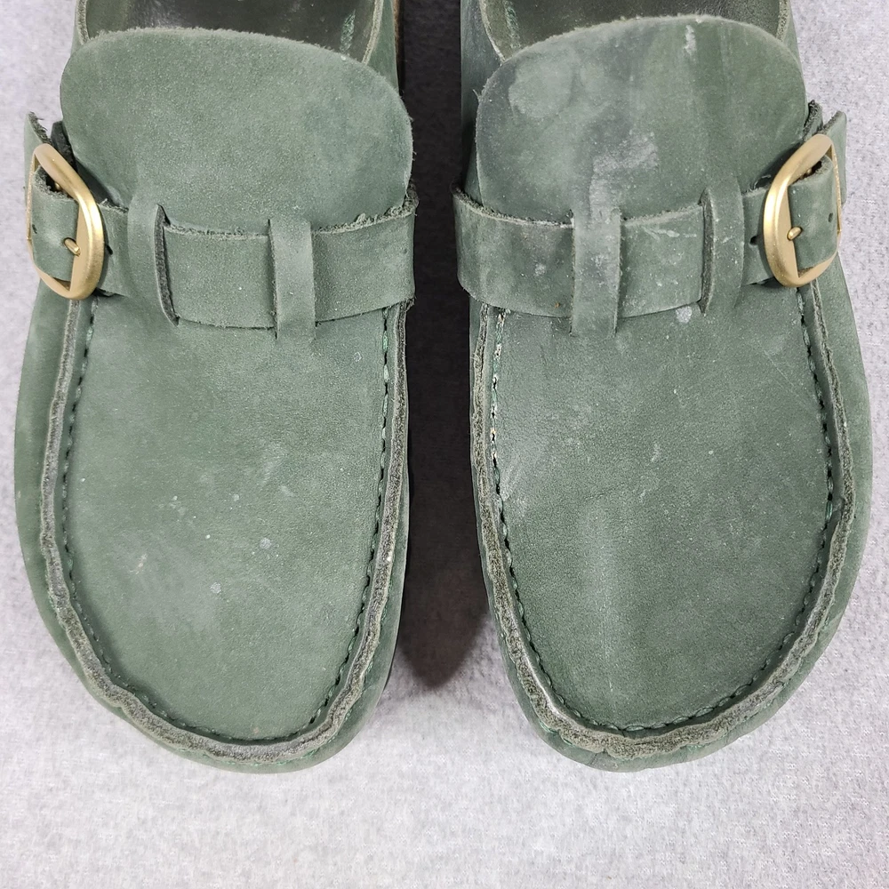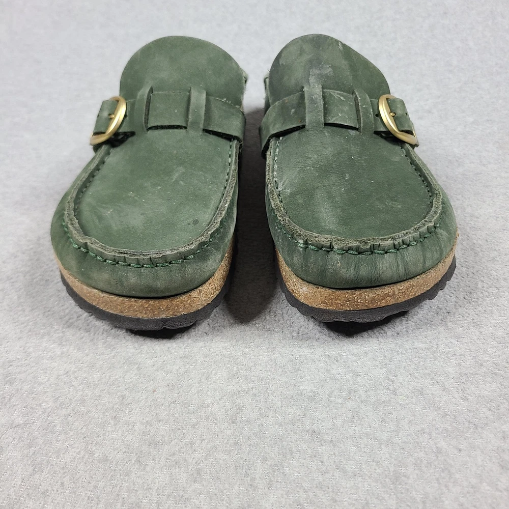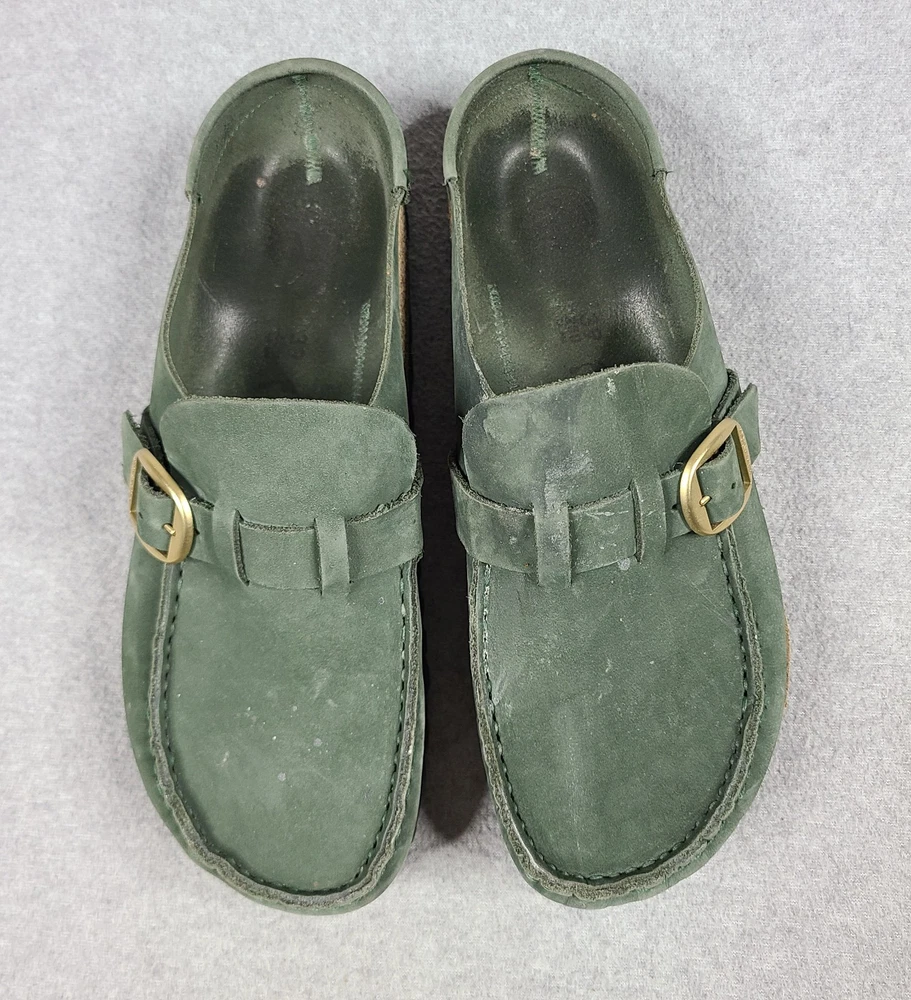 These do have some scuffs so please see ALL pictures before purchasing. Elevate your shoe game with these stylish and comfortable Birkenstock Buckley clogs in a beautiful green suede leather. These are the perfect shoes for women who love to walk and explore the outdoors, with a closed toe and slip-on style that makes them easy to wear. The adjustable strap and buckle features provide a secure fit, while the low top shoe shaft style and flat heel make them comfortable for all-day wear. These clogs are made in Germany and have a shearling fabric type, with a leather lining and insole material that adds to their luxurious feel. The buckle and logo accents provide a touch of elegance, and the solid pattern and tea, outdoor, and classic themes make them a versatile addition to any wardrobe. Whether you're traveling, activewear, or just want to look stylish for a casual event, these Birkenstock Buckley clogs in size 39 and a US shoe size of 8.5 are the perfect choice.