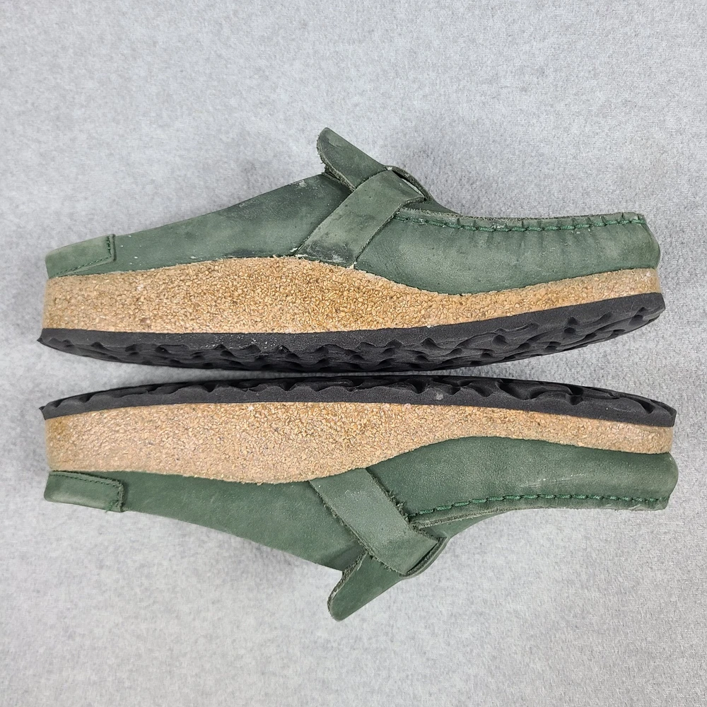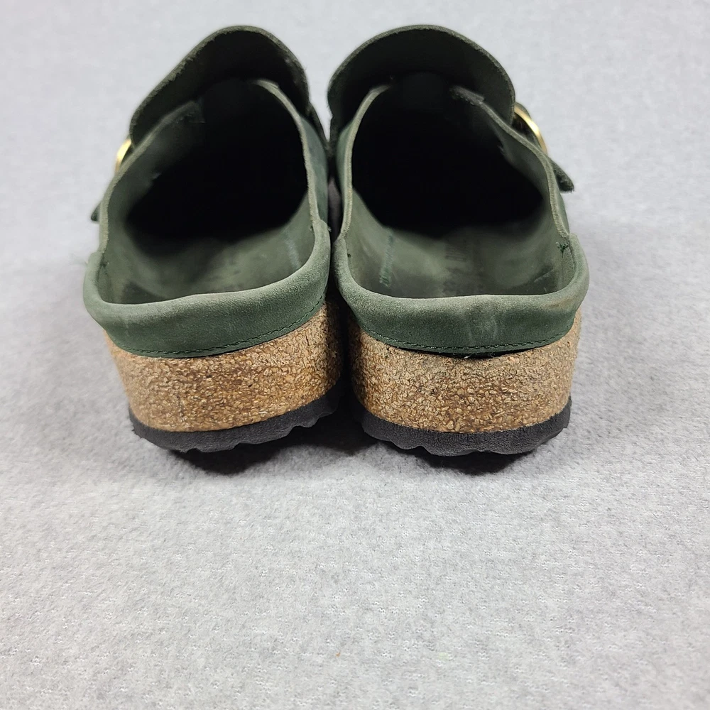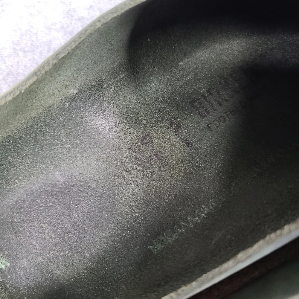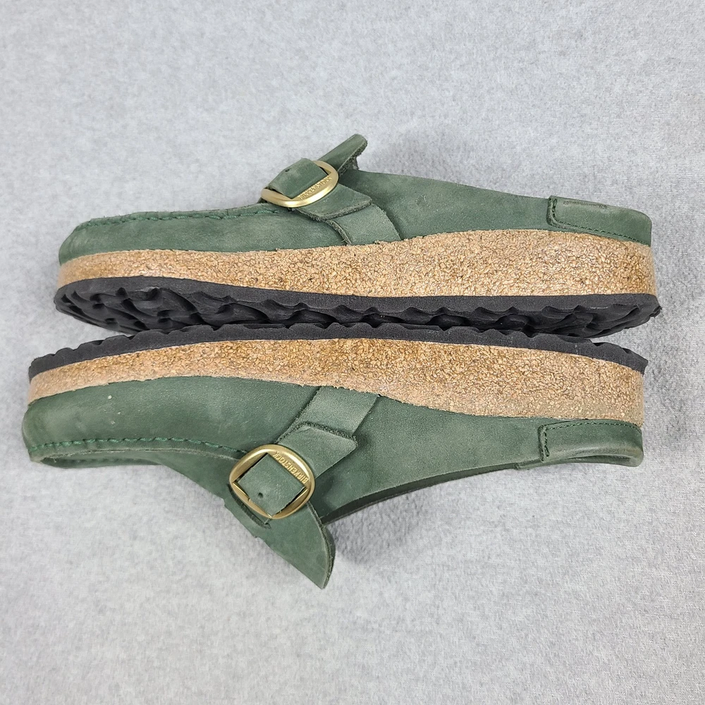 These do have some scuffs so please see ALL pictures before purchasing. Elevate your shoe game with these stylish and comfortable Birkenstock Buckley clogs in a beautiful green suede leather. These are the perfect shoes for women who love to walk and explore the outdoors, with a closed toe and slip-on style that makes them easy to wear. The adjustable strap and buckle features provide a secure fit, while the low top shoe shaft style and flat heel make them comfortable for all-day wear. These clogs are made in Germany and have a shearling fabric type, with a leather lining and insole material that adds to their luxurious feel. The buckle and logo accents provide a touch of elegance, and the solid pattern and tea, outdoor, and classic themes make them a versatile addition to any wardrobe. Whether you're traveling, activewear, or just want to look stylish for a casual event, these Birkenstock Buckley clogs in size 39 and a US shoe size of 8.5 are the perfect choice.