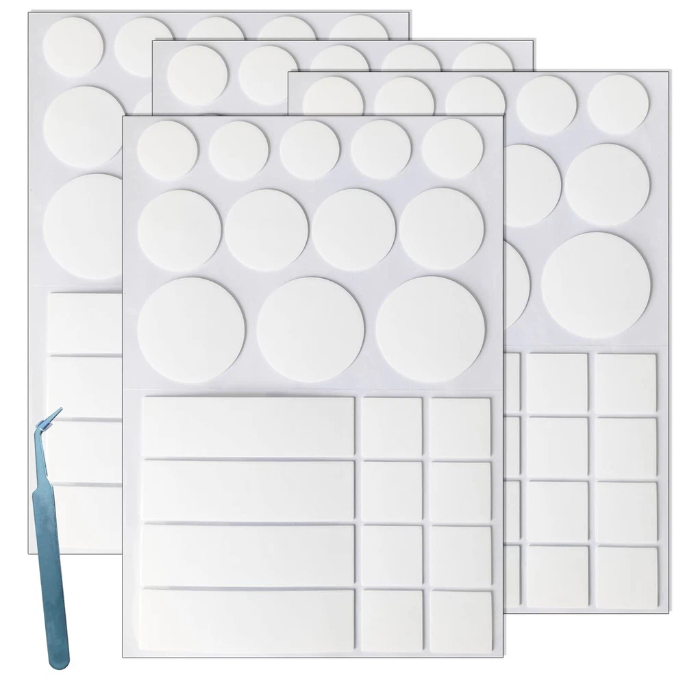 Strong adhesive acrylic double sided tape: This thin double-sided adhesive tape is very suitable for hanging and stick small and medium-sized objects because of its excess adhesive force. You can use multiple tape strips combinations to ensure that things do not fall off No residue: This adhesive mounting squares are suitable for smooth and flat surfaces such as plastic, glass, metal, fabric, wood, ceramic tiles. It should be noted that removing it may damage your painted wall, so careful consideration should be given when using it on painted walls For hanging stuffs, making crafts, party decoration: Multipurpose adhesive tape, you can use it to hang pictures, posters, balloons, socket; You can also stick art crafts, mirrors, and carpets. Tape for home, office, school, party, wedding, decoration and organization Removable, washable, reusablz: This transparent adhesive tape strip can be reused. You only need to rinse it with water, and then wait for it to dry to regain its stickiness There are 48 circles, 16 strips, and 32 squares, a total of 96 pieces. You can use multiple tape strips combinations to ensure that things do not fall off