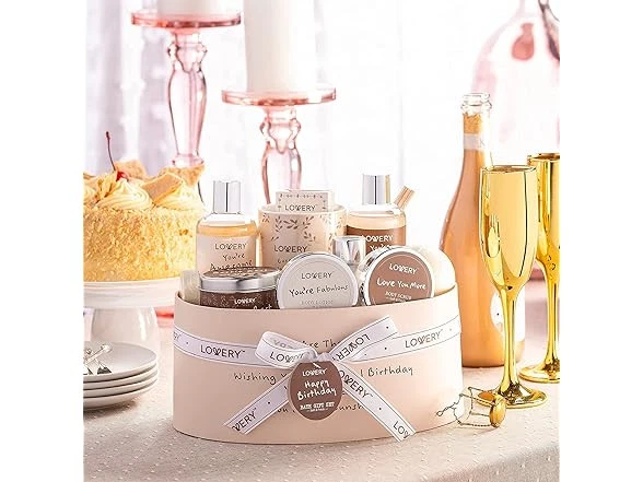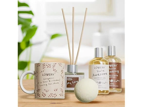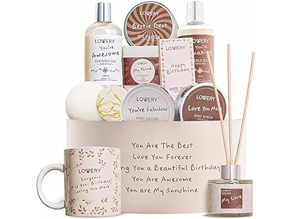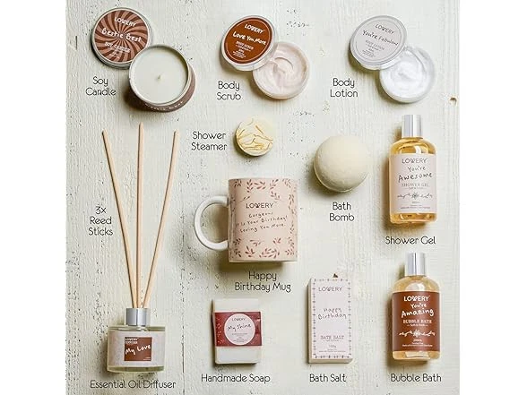 Birthday Bath and Spa Gift Basket Condition: New Features THE GIFT OF LUXURY - Make your loved ones' birthdays the best day of their lives by giving them this Deluxe Bath and Spa Box that contains everything they need from Head to Toe to enjoy a relaxing Home Spa. Each item in this set has written sayings Blessing the Celebrant. Let them indulge in an invigorating bath that will help them free their Mind, Body and Soul from tension and stress. A COMPLETE BATH SET - No more choosing from one gift over another as our Gift Boxes pack all the Bath and Beauty Essentials she will surely love. Each set comes with Shower Gel, Bubble Bath, Bath Salt, Handmade Soap, Shower Steamer Tablet, Bath Bomb, Body Lotion, Body Scrub, Happy Birthday Mug, Soy Candle, Essential Oil Diffuser and 3 Reed Sticks. ELEGANT HAPPY BIRTHDAY MUG - Aside from the Premium Spa Kit, our Birthday Gift Sets also arrive with a Happy Birthday Mug. It is exquisitely crafted from good wishes sayings. This just makes your present complete and extra special - an all-in-one gift pack! ALL-NATURAL FORMULATION - Our Bath Spa Kit is formulated with all-natural ingredients, including Vitamin E and Shea Butter, which leave skin luxuriously scented, smooth, and hydrated. It also helps prevent dryness and flakiness and keeps skin moisturized and supple – ideal for women's delicate skin. Plus, it is suitable for most skin types. GIFT-READY PACKAGING - Lovery ensures that every Bath Set is ready to go as a gift without any additional wrappers. The Customized Birthday Packaging alone is enough to gain great impressions from the celebrant. It comes with a ribbon and hangtag for you to writer her a personalized message. We want to be part of every birthday celebration. That is why we are sending our warm greetings to your loved ones: "You're Awesome!" Specs In the box: (1) Birthday Bath and Spa Gift Basket Includes: (1) 200ml Shower Gel (1) 200ml Bubble Bath (1) 50ml Body Lotion (1) 50ml Body Scrub (1) 100g Bath Salt (1) 100ml Diffuser (1) Reed Diffuser Stick (1) 50g Soy Candle (1) Happy Birthday Mug Cup (1) 30g Steamer Tablet (1) 100g Handmade Soap (1) 150g Bath Bomb (1) Gift Box