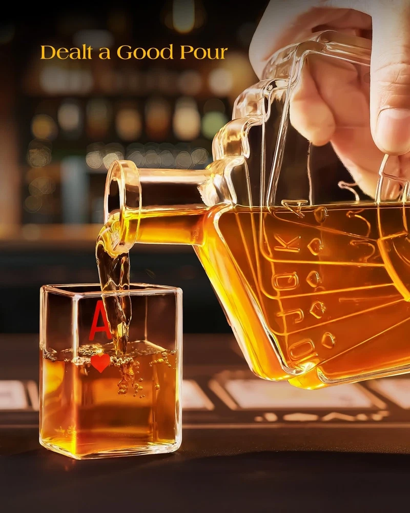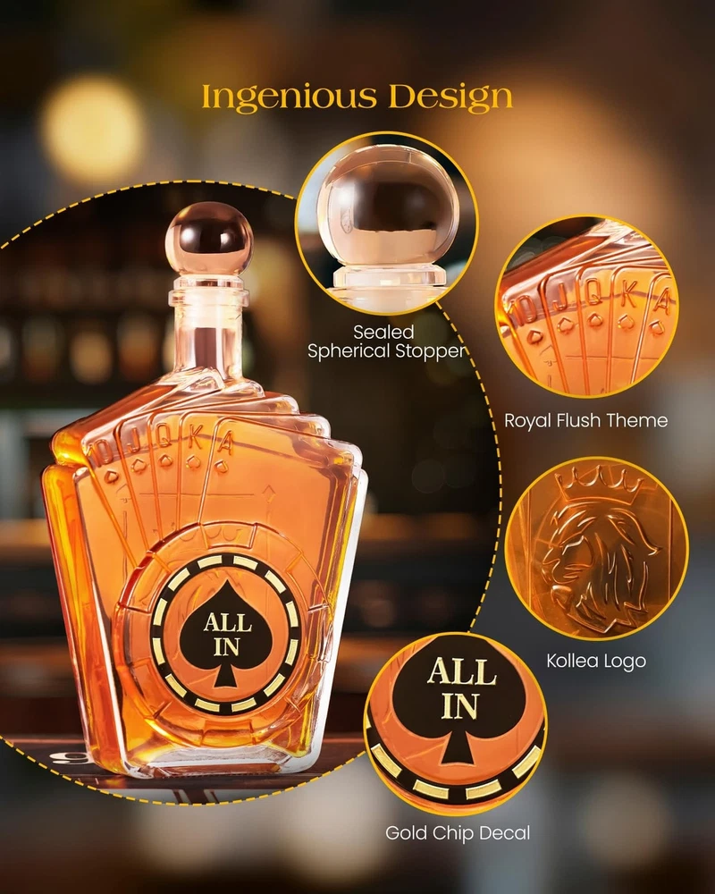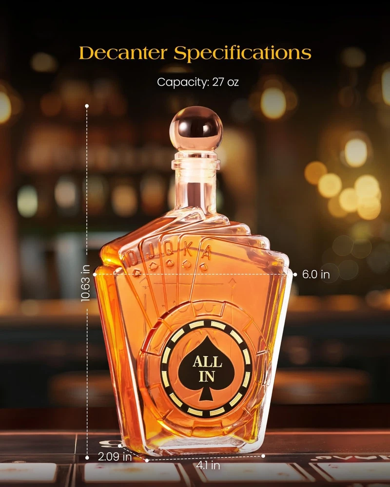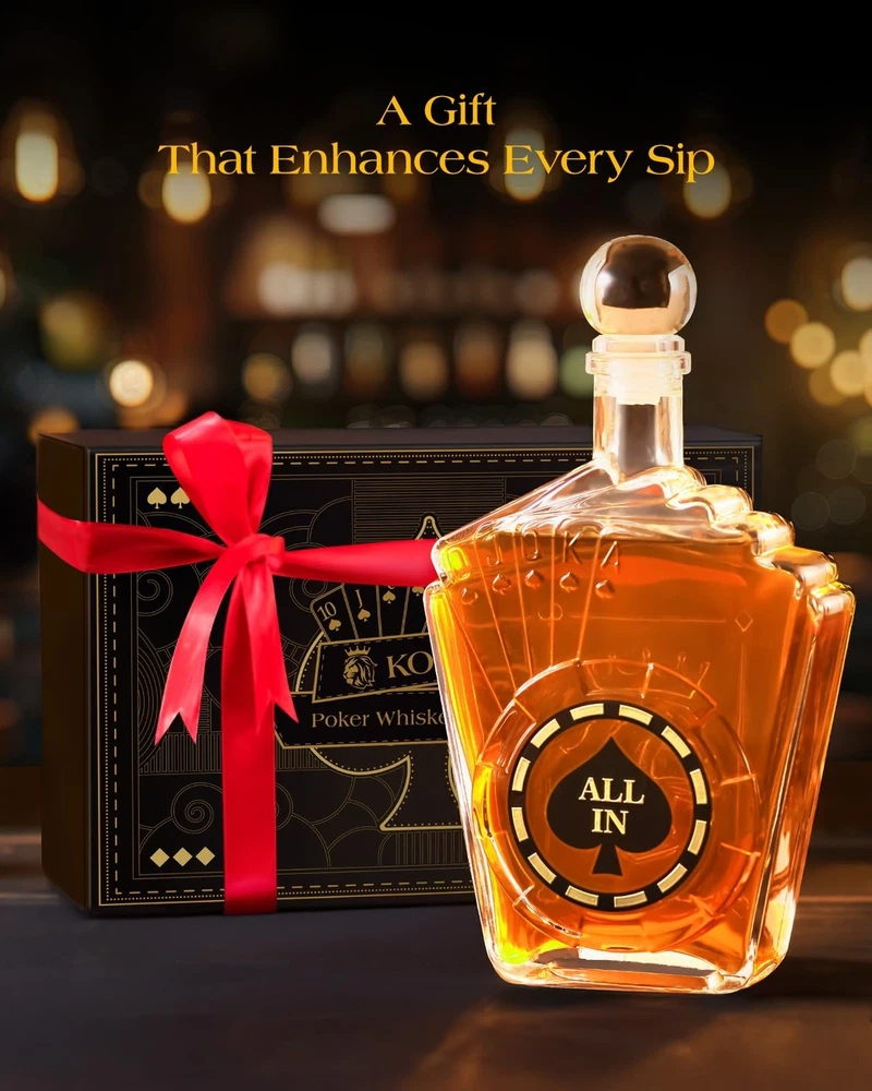 Birthday Gifts for Men Dad, Kollea Poker Whiskey Decanter Set for Men, Casino Style Liquor Decanter, Funny Christmas Gift Ideas for Him Boyfriend Brother, Liquor Dispenser for Bar, Anniversary, 27 oz Product Details Brand: Kollea Material: Glass Color: Clear Capacity: 800 Milliliters Special Feature: High Transparency, Poker-Themed Design, Airtight Brand: Kollea Material: Glass Color: Clear Capacity: 800 Milliliters Special Feature: High Transparency, Poker-Themed Design, Airtight Product Dimensions: 7.28"W x 11.2"H Included Components: 1 x 27.05 Oz Decanter, 1 x Airtight Glass Stopper, 1 x Exquisite Gift Box Model Name: WGS0311 With Lid: No Item Weight: 2.59 pounds Manufacturer: Kollea Country of Origin: China Item model number: WGS0311 Date First Available: September 3, 2024 Exquisite Design: This Texas Hold'em whiskey decanter set, inspired by a Royal Flush, is adorned with gold chip decals on the bottle. It's not just for savoring the rich and robust whiskey, but also offers a high degree of artistic appreciation Elegant and Luxurious Gift: With its poker motif and distinctive design, this decanter set is beautifully packaged, making it an ideal gift for men, him, father, brother, boyfriend, husband, and all whiskey or poker enthusiasts. It adds a touch of creativity and surprise for birthday, Wedding,Housewarmig, Anniversary, Christmas, and other special occasions Conversation Starter for Social Gatherings: At parties or dinners, this decanter set is sure to be a focal point for conversation and attention. It reflects the host's sophisticated taste and adds an element of fun and ceremony to the gathering, making game nights truly memorable Enhanced Drinking Experience: With a generous 27 Oz/800 ml capacity, this liquor decanter set is perfect for gatherings with friends, enhancing the pleasure of sharing fine whiskey and engaging in deep conversations. It also serves as an exquisite decoration for your home bar Superior Quality: Crafted from thick, transparent, lead-free glass, this decanter set ensures safety and excellent durability. Equipped with a silicone-sealed spherical stopper for optimal sealing, and padded with pearl cotton inside for secure and safe transportation
