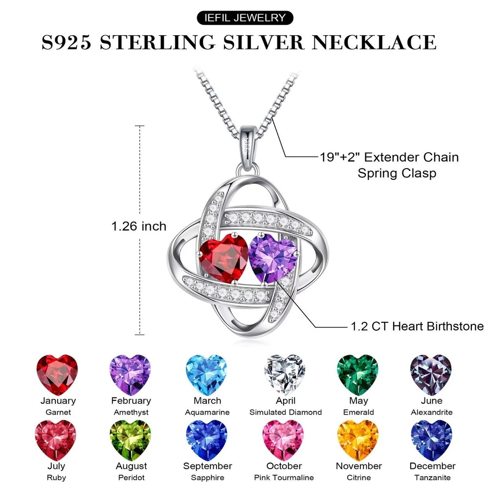 Love Knot Birthstone Gifts: Mothers Day Gifts for Women Birthday Gifts for Women Anniversary Gifts for Women Christmas Gifts for Women Valentines Day Gifts for Women Jewelry Attention Please avoid contacting with the acid and alkali, corrosive substances. Please avoid the collision, so as to avoid surface scratches. Please avoid wearing it when sweating a lot, shower or sleep, etc. Please wipe them with soft cloth when you clean your jewelries. Best Gifts: The best gifts for your wife, girlfriend, daughter or grandma, when she receive the gifts, we believe it is a surprise! GIFTS FOR WOMEN: Our double birthstone pendants are available in 78 styles. You can give your wife, girlfriend, mom, aunt, sister or grandma a big surprise on Mother's Day, Birthday, Christmas, Valentine's Day or other special occasions. Our elaborate double birthstone pendant, one representing your birth month and one representing hers. When she wear this love knot necklace, she will genuinely happy for this. MATERIALS: The chain and pendant are both made of 925 Sterling Silver. High quality platinum plating stuff that will not turn your skin to green, red or itchy. SIZE: 19 inches + 2 inches (Adjustable) Chain. This length works on practically anyone. Our love knot necklace highlight understated elegance and refined femininity. The double heart pendant is bigger than normal, it's an excellent gift choice for women daily wearing home or office. MEANING: Love knot necklace with double heart birthstone symbolizes your forever love for the special women in your life. Of course, you can also customize a necklace for your parents or grandparents, choose their respective month of the birthstones, as a record of their love between them, your family will love this special gift. Comes with a beautiful PU jewelry box. AFTER SALES SERVICE: Any question about our birthstone necklace, please contact us and we will answer your question within 24 hours and give you a satisfactory answer.