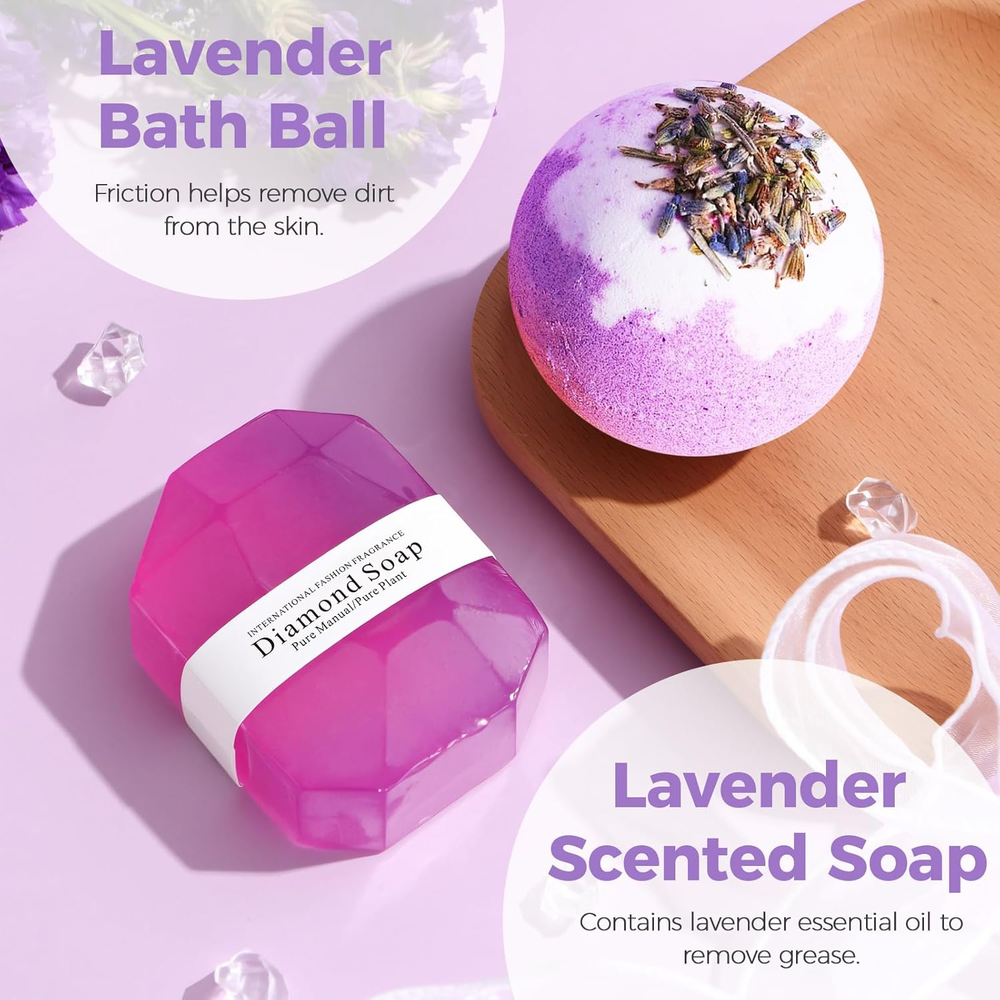 Ultimate Luxury Teacher's Day & Women's Gift Set: This premium 10-piece spa gift set is the perfect Teacher's Day gift, birthday gift for her, anniversary gift, or best friend gift. Elegantly presented in purple, it's designed for women seeking luxury. Indulgent Lavender Spa Experience at Home: Enjoy ultimate relaxation with therapeutic lavender bath salts, exfoliating Himalayan salt scrub, and moisturizing gold foil soap. Transform your bath into a calming aromatherapy retreat for body and soul. Practical Pampering & Daily Delights Included: Beyond bath essentials, find versatile treasures: a chic skincare headband, cozy flannel blanket, stylish friendship bracelet, and unique stainless steel egg cup. Perfect for everyday use or special moments. Soothing Lavender Ambiance & Romantic Touch: Set a serene or romantic mood with delicately scented lavender candles and beautiful dried flower cards. Ideal for creating a relaxing atmosphere for Teacher's Day, birthdays, or anniversaries. Exquisite Purple Gift Box Ready for Presentation: Arrives in a stunning luxury purple gift box, complete with a heartfelt holiday card. Offers a memorable unboxing experience, making it the ultimate ready-to-give present for any occasion. Product description