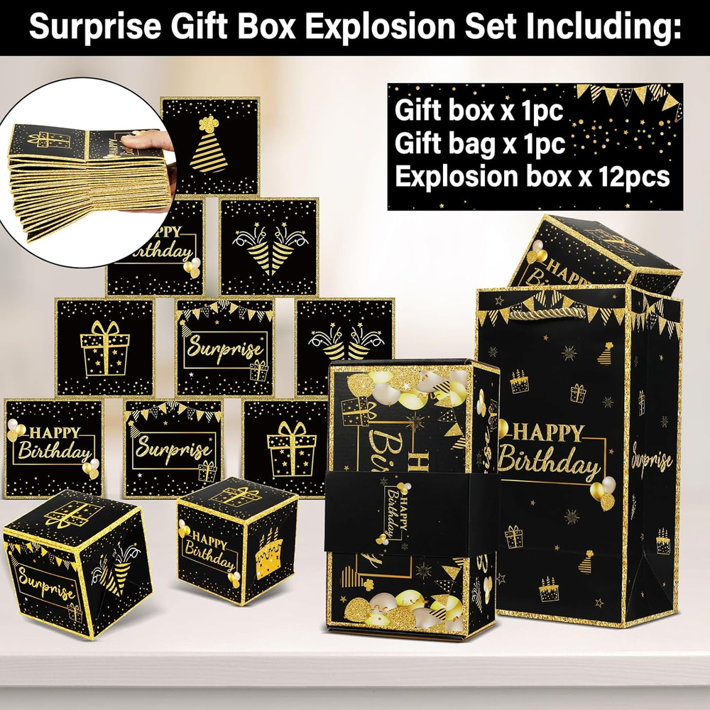 What You Will Get: Each birthday surprise gift box explosion includes 1 x gift bag, 1 x gift box, 12 x small explosion boxes, and 1 x wrapped card. Rich quantity and combination to meet your needs. Adorable Design: Our birthday exploding pop up box is designed in classic black and gold color, which will create a warm and happy atmosphere for your birthday party, making an unforgettable surprise. Creative Surprise Gift Box: Imagine how happy and surprised your loved ones will be when the bouncing boxes burn out, the surprising faces and exciting screams will make the birthday party happier. Easy to DIY: Insert cash, cards or other small gifts in the gap between the bouncing boxes. Then put them into the gift box and use the wrapped card to pack, finally put the gift box in the gift bag. High Quality: The surprise bouncing box is made of premium paperboard and is elegantly printed, sturdy, odorless, can be used multiple times. This box is a special way to create delightful moments. Product description