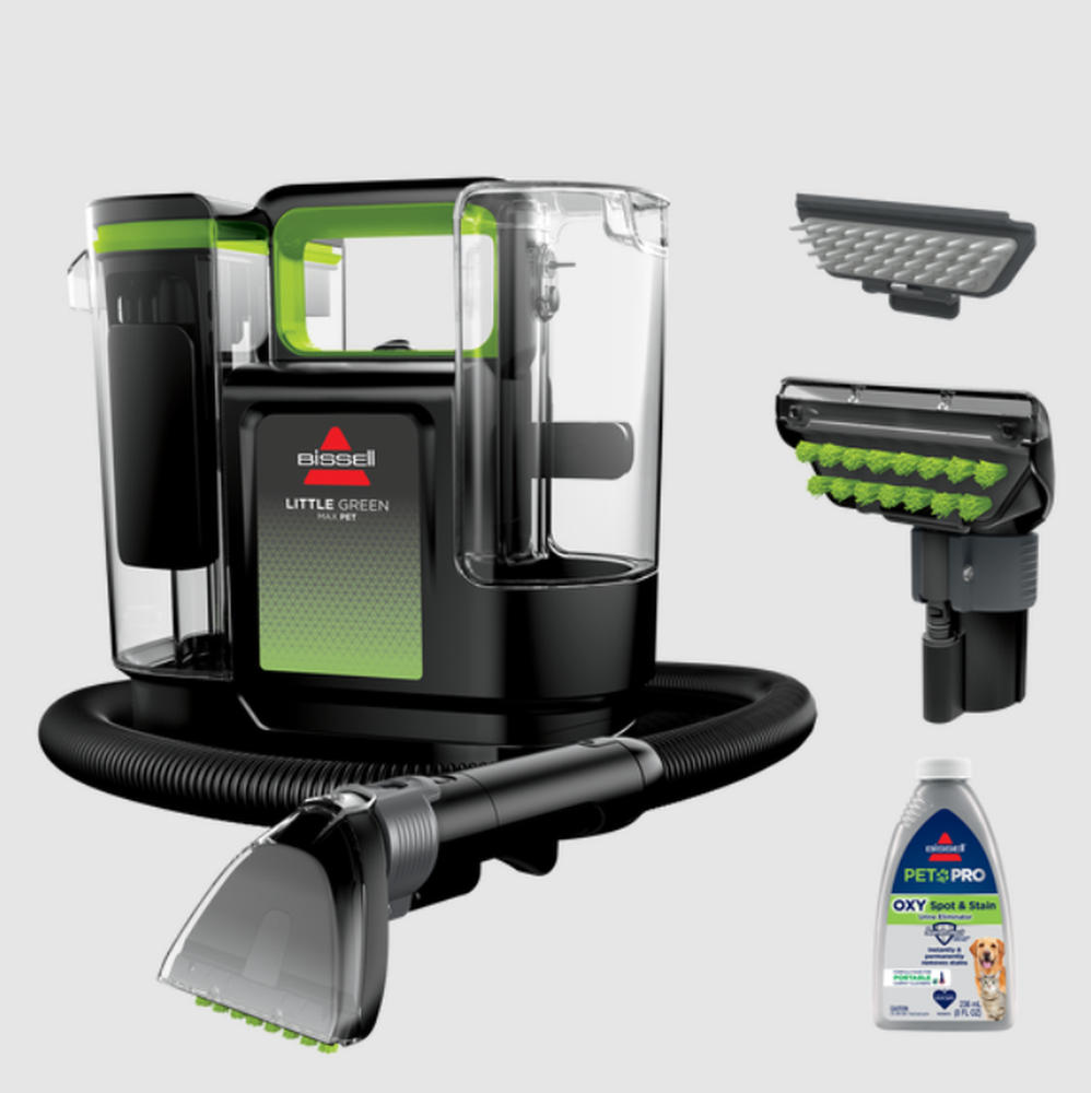 Discover superior pet mess cleanup with the Little Green Max Pet Portable Carpet Cleaner, boasting 30% more powerful suction¹ than the Shark StainStriker. EVERY PURCHASE SAVES PETS. BISSELL proudly supports BISSELL Pet Foundation and its mission to help save homeless pets. SUPERIOR SUCTION. 30% more powerful than the competitive portable deep cleaner.* INSTANT & PERMANENT PET STAIN REMOVAL. Use with Triple Action PET PRO OXY Spot & Stain formula with Urine Eliminator and StainProtect Technology to protect against future stains. SELF-CLEANING TOUGH STAIN TOOL. Rinse out left-behind residue, dirt and debris with a one-touch hose and tool cleanout. EASY TO USE. Longer hose and cord let you easily clean hard-to-reach messes, and the two tank technology simplifies filling and emptying while keeping clean and dirty water separate. SPRAY, SCRUB, AND SUCTION. TRIPLE ACTION cleaning removes tough set-in pet messes like muddy paw prints, embedded dirt, bio messes, and more. IN THE BOX: Self-cleaning Tough Stain Tool, Specialized Pet Hair Removal Tool, 8 oz. trial size BISSELL PET PRO OXY Spot & Stain with Urine Eliminator and StainProtect Technology. Introducing the BISSELL Little Green Max Pet Portable Carpet & Upholstery Deep Cleaner, a cutting-edge machine designed with convenience in mind—especially for pet parents. This innovative cleaner uses a combination of superior suction and scrubbing action to permanently remove tough pet stains on soft surfaces and eliminate odors like pet urine. With a lightweight design, the Little Green Max Pet is easy to use and store. This machine has a one-touch hose and tool cleaning function to provide a simple "clean-afterthe-clean" experience without having to change out your tool. BISSELL proudly supports BISSELL Pet Foundation and its mission to help save homeless pets. When you buy a BISSELL product, you help save pets, too. We’re proud to design products that help make pet messes, odors and pet homelessness disappear. *versus Shark StainStriker and Dirt Devil Portable Deep Cleaner based on ASTM F558 average peak air power through hose with connector covered