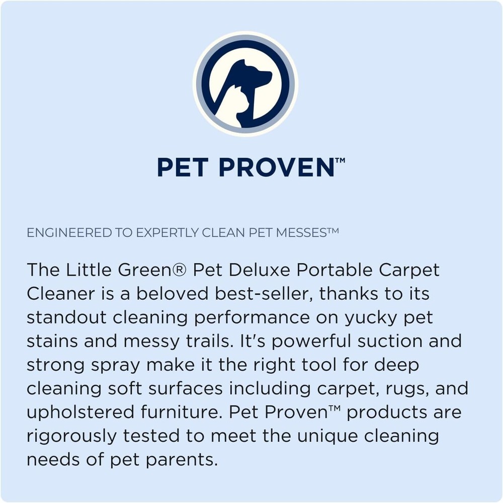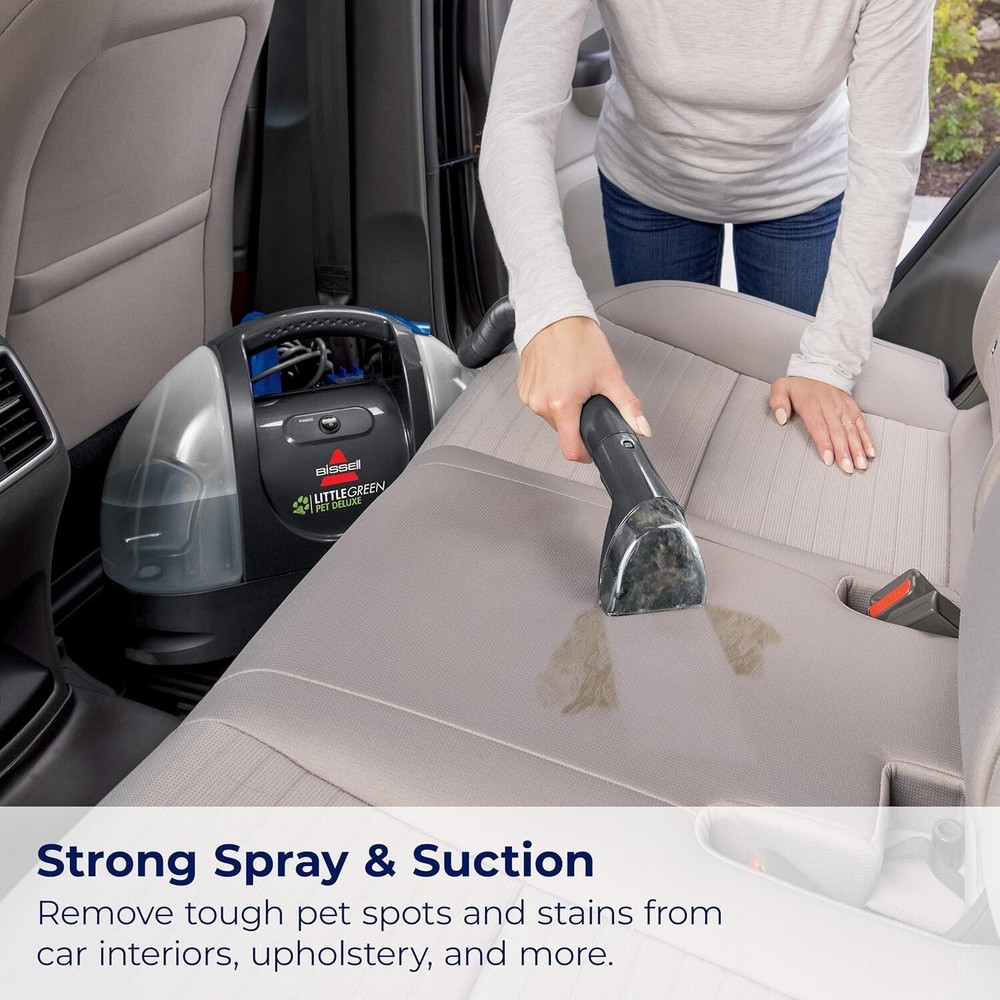 EVERY PURCHASE SAVES PETS. BISSELL proudly supports BISSELL Pet Foundation and its mission to help save homeless pets. POWERFUL SUCTION. Remove tough pet spots and stains from carpets, upholstery, car interiors, and more. PORTABLE and VERSATILE DESIGN. Easily clean multiple surfaces throughout the home. LARGE TANK CAPACITY. 48 oz. tank means you can clean more between refills. REMOVE PET ODORS. Remove difficult pet stains and odors with with the Pet Spot and Stain plus Pet Oxy Boost. TOOLS and FORMULA INCLUDED. Comes with 3" Tough Stain Tool, Stain Trapper Tool, HydroRinse Self-Cleaning Hose Tool, 8 oz trial-size PET Spot and Stain formula, and 8 oz trial-size PET OXY Boost. MULTI-PURPOSE CLEANING. For use on carpet, stairs, upholstery, area rugs, auto interiors and more.