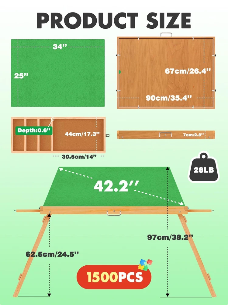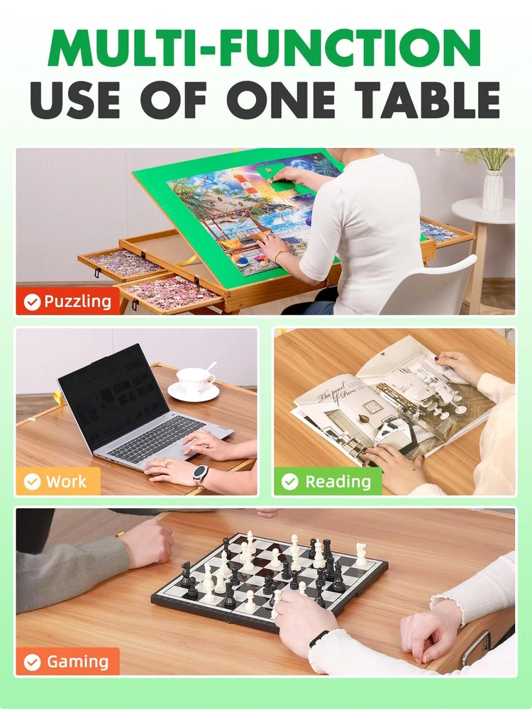 BittPicc Puzzle Table 1500 Pieces Puzzle Tables for Adults with Drawers 25"x34" Portable Jigsaw Puzzle Table Foldable Wooden Table with Legs & Cover for Mom Wife 【Large worktop that can hold 1500 pieces】-- The size of the working area of this wooden puzzle table is 34 inches × 25 inches, suitable for most 1500 pieces of puzzles. If you like to do large puzzles, this board will significantly improve the experience. The table top is covered with non-slip felt, which can ensure friction and effectively prevent the puzzle pieces from sliding or falling. 【3 Adjustable tilt table】-- In order to reduce back and neck pain during the puzzle process, our puzzle tables for adults are specially constructed according to ergonomics, so it can better provide a comfortable position for puzzle enthusiasts. Our puzzle board can be adjusted to 4 different angles from 0 ° to 40 ° (0, 15 °, 30 °, 40 °), which can be tilted or placed according to your usage. 【2 Foldable Legs without Assembly 】-- This puzzle table comes with 2 foldable legs which does not require assembly and can be opened and folded in a few seconds.The height when the leg is fully extended is 24.6",which makes the table has a certain height, you do not need to bend over for a long time to do the puzzle.When you're not using the table, the legs can be folded and placed under a bed or sofa. 【4 Removable Storage & Sorting Drawers】-- 4 Removable felt drawers allow you to sort your pieces by color, theme or border. Different colors offer you much convenience to classify your pieces.Every drawer is specially designed with a metal cilp in order to ensure all the drawers are stay closed when transportation, safely keep the pieces from missing. 【Multifunctional Smooth Wooden Cover】--We provide a removable wooden cover to keep your puzzle in place when you need to take a break ,which can protect the puzzle pieces against dust and naughty pets .The table covered the plate also can be used for many purposes such as a a coffee table,dining table or game table,So it's worth the money to have this table! Shipping We offer FREE shipping on all orders! We use a selection of shipping services such as UPS, FedEx, USPS etc. We only ship to the lower 48 states, no APO/FPO addresses or PO Boxes allowed. Local pickups and combined shipping options are not provided at this time. Return You can return a product for up to 30 days from the date you purchased it. Any product you return must be in the same condition you received it and in the original packaging. Please keep the receipt. Payment We accept payment by any of the following methods: PayPal Please pay as soon as possible after winning an auction, as that will allow us to post your item to you sooner! Feedback Customer satisfaction is very important to us. If you have any problem with your order, please contact us and we will do our best to make you satisfied. Contact Us If you have any queries, please contact us via ebay. We usually respond within 24 hours on weekdays. Please visit our eBay store to check out other items for sale! Thank you for shopping at our store.