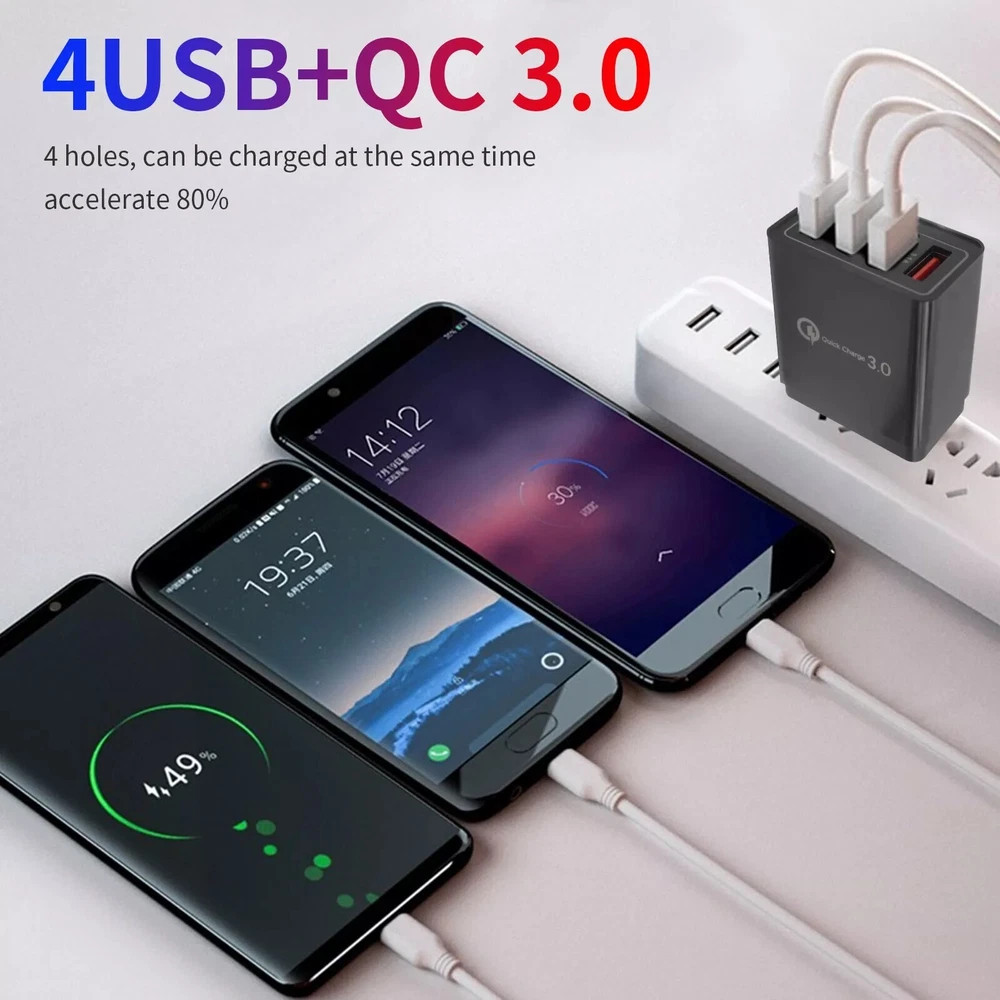 Black US 4 Port Fast Quick Charge QC 3.0 USB Hub Wall Charger Power Adapter Plug Description 1. Portable charger for home, office, travel and other indoor uses. 2. 4 USB ports (fast charge 3.0 and 4 USB ports 5 V/ 3A max.), Load 4 devices at the same time. 3. The protections keep you and your devices more secure. 4. Compatible with all smartphones for iPhone iPad Samsung Xiaomi, Huawei, OPPO, OnePlus, Sony, Google and PC Camera Tablet MP3, MP4 player, PSP with USB port. 5. Intelligent matching stream. Integrated smart chip, according to different devices, compatible with the required output, fast charging and does not damage the battery. Specifications: 1.Input voltage: 100-240 V 50-60Hz 2.Output: 5 V / 3 A (max.) 3.Standard plug: American plug 4.Color: Black Package Included: 1 x QC 3.0 Quick Charger