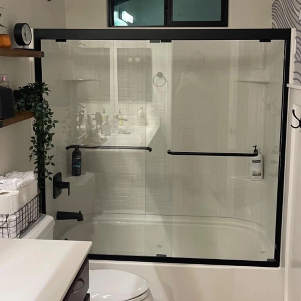 IMPORTANT TIPS Please ensure that the glass shower door for bathtub opening width is between 56~60 inch, and the shower base has a threshold depth of at least 2 3/8 inch (60mm). If the above dimensions are not met, it will can't be installed, Please go to our store to purchase other suitable sizes. SPLASH-PROOF DESIGN The 56-60 inch bathtub glass doors adopting high-quality materials and structural design to enhance waterproofness, the splash-proof structural design at the bottom can effectively prevent water leakpage, and each glass panel side is covered with a waterproof sealing strip to effectively prevent water splashing and leakage, thus keeping the rest of the bathroom dry. SILENT ROLLERS DOUBLE SLIDING This glass shower door for bathtub features a silent pulley design, which opens and closes without noise, and also has an anti-collision design to prevent the door from hitting the wall when opening and closing. The glass shower door for bathtub is equipped with an adjustment track that can be adjusted up to 4 inches (56''-60'') in width to accommodate different wall spacings in the shower area, including irregular or trapezoidal walls. MAX 4'' WIDTH ADJUSTMENT This bathtub glass doors measures 60 inches wide x 57 inches high, with 56''~ 60'' customizable width by trimming the rails.The glass shower door for bathtub made of stainless steel hardware and durable plating matte black surface treatment.The handles are convenient for hanging towels and washcloths. SGCC CERTIFIED TEMPERED GLASS The bathtub glass doors is designed with SGCC/ANSI-certified 1/4" (6mm) safety thickened clear shower door glass,which not only creates a spacious and open feeling,but also effectively resists damage. Double sliding design makes the shower glass panel maintenance and cleaning a breeze. EASY TO INSTALL The shower screen for bathtub is easy to install even if you are not professional,all the accessories and user manual are included in the package. Important tips: All measurements should be taken after the wall finishes (such as tiles, backsplash, etc.) are completed,the shower is reversible design,you can easy entry and exit from left or right. Semi Frameless Glass Shower Door Transform Your Bathroom with Double Sliding Shower Doors This frameless glass shower door made of anti-rust aluminum track, with max 4'' customizable width by trimming the rails.The sliding shower glass doors equipped with stainless steel hardware and durable plating metal surface treatment.The handles are convenient for hanging towels and washcloths. Always enjoy a clean shower time This shower door uses ANSI and SGCC dual-certified tempered glass with a thickness of 1/4 inch (6 mm) thickened transparent tempered glass design, which is smooth, scratch-free, durable and safe, not only creating a spacious and open feeling, but also effectively resisting damage. The surface will not easily retain soap bubbles and dirt, which can prevent water stains from accumulating and make the maintenance and cleaning of the shower glass panel a breeze. As a professional bathroom product manufacturer, we always provide you with better products and more efficient services, but the following service terms need to be known to you: 1: If you find some problems with the product after receiving the goods, please do not discard the product, because we need you to provide pictures or videos of the relevant faults to better serve you. 2: Please note that we do not bear the installation/assembly costs. If you find a fault during the installation of the product, we will not bear or reimburse this cost because we stipulate that all parts must be checked before booking. 3: Delivery within the United States only, excluding Alaska/Hawaii, Puerto Rico, Guam, Saipan, APO/FPO, US Protectorates and PP Box. Usually the delivery time is 1 to 7 business days. If you still have not received the goods after 7 business days, please contact us immediately and we will track the order for you. 4: If your goods are damaged when delivered, you must refuse the order and describe the damage on the receipt. Just fill in "the goods are damaged". If you accept the goods and the damage is not noted on the receipt, we reserve the right not to refund or replace your goods. If you are not satisfied with your purchase, please contact us within 7 days. Please note that there is a 20% restocking fee and all shipping and handling charges are the responsibility of the buyer.