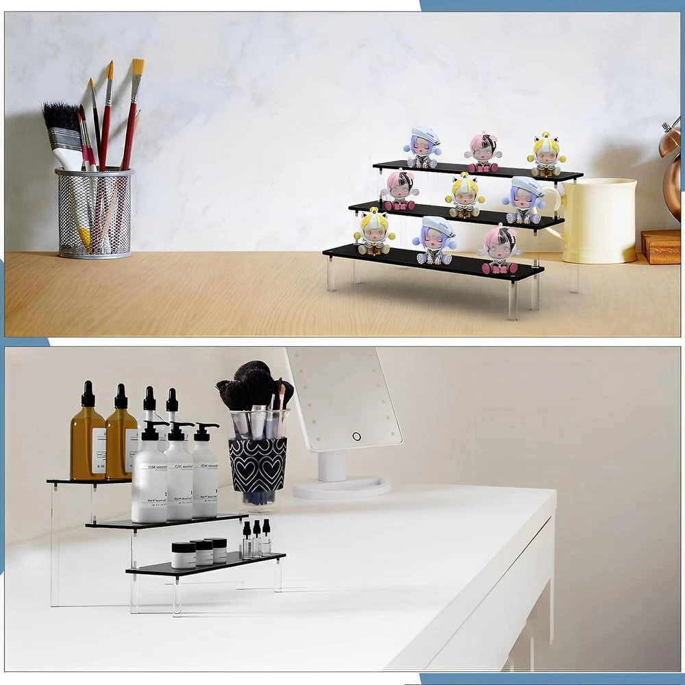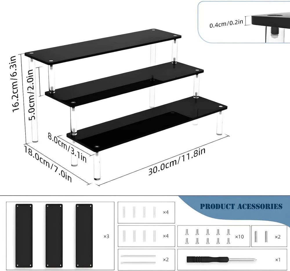NEW! Black Acrylic Shelf Riser - 3 Tier Perfume Organizer Cologne Display Stand - Large Cupcake Stand Shelf for Desserts Holder Collection Cosmetic Products Tabletop Use Keep things Orangeized: Acrylic Display Shelf can help organize and display your items on the table, You can find them quickly and easily. This Black Display Stand can be used to place figurines, cupcakes, perfume, small plants and more of your items Material: Display Shelf made of 4mm sturdy acrylic material, Display Stand is strong and perfect, Cupcake Stand that provides enough space to cologne perfume, cosmetic, collectibles and etc Size: Every acrylic panel is 11.8IN long and 3.15IN wide, The total dimensions after assembly about is 11.8L×7.87W×5.9H inch Easy to Assemble and Clean: Acrylic Display Shelf can be assembled in three minutes and it is easy to clean and store when you don't use it. In order to prevent scratches during transportation, side of the board are attached with protective films,please tear off the protective film from the plate