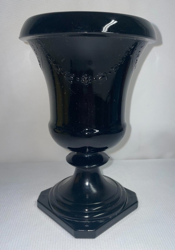 Black Amethyst Glass Pedestal Urn Vase Garland Pattern 7 Inches High. Pre-owned, no chips or cracks, A beautiful garland pattern. The urn measures 7 inches high with a 5 inch opening across top. The base measures 4 inches square. The purple shows through under flash light. Hand wash only. ATTENTION REGARDING SHIPPING !! Shipping costs are expensive. Here is an offer that is hard to refuse. If you buy 2 or more items totaling $50 or more , I will handle the shipping cost (ground) anywhere in the continental United States. The items cannot be listed as having to be shipped alone due to SPECIAL PACKING NEEDS . eBay does not adjust the shipping cost removal from the invoice automatically. I can do it on the final invoice after you have the items in your shopping basket, before you pay. If eBay forces payment before that is done, you will receive a refund of shipping cost made before your package is shipped within the first business day following the transaction. The free shipping offer does not apply to Priority or Expedited shipping, although we can discuss a fair reduction in shipping cost should you desire the shipping upgrade. LOOKING FOR LESS EXPENSIVE SHIPPING? Click on "See details" next to Expedited Shipping Fee above to see other shipping options. eBay calculates the shipping fee based on package size, weight and type of shipping you select. SOME ITEMS CANNOT BE COMBINED WITH OTHER ITEMS DUE TO UNIQUE PACKAGING CHARACTERISTICS. THERE WILL BE A NOTE (here) IN THE LISTING WHEN COMBINED SHIPPING CANNOT BE USED. SAVE SHIPPING COSTS! – USE COMBINED SHIPPING Shipping costs are high. The best way to save money on shipping costs is through combined shipping,… purchasing more than 1 item and having them shipped together. The cost per item drops substantially. To do this you MUST NOT pay for items until after the combined shipping cost has been calculated on the invoice. If you pay before this has been done you will end up paying the individual shipping cost for each item, and I am unable to issue refunds for shipping overpayments when this occurs because eBay does not refund the fees they charge me on the refunded amount.