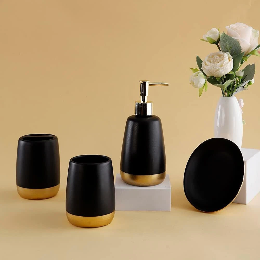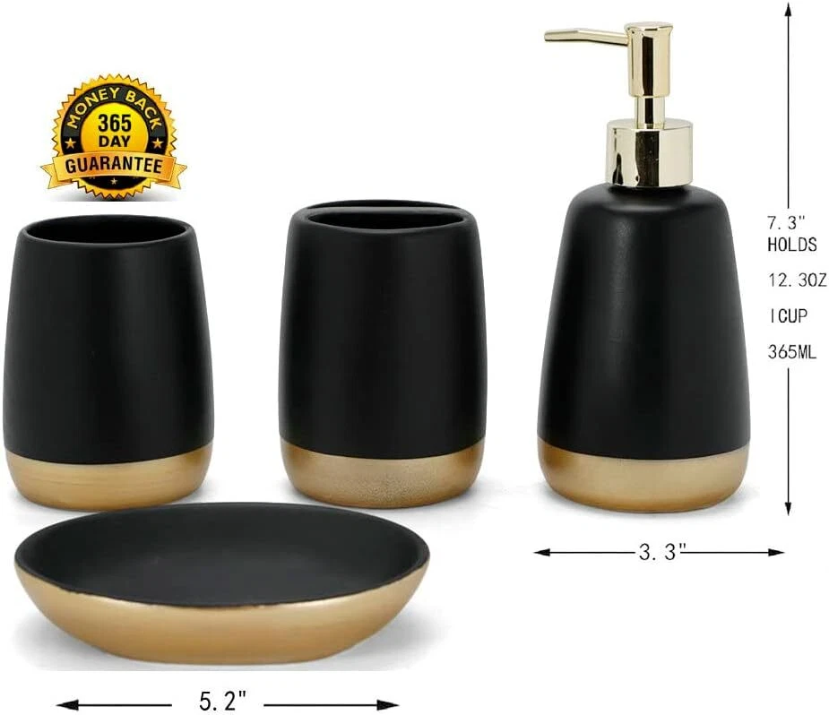 Black Bathroom Accessories Set Gold Bathroom Accessory Set,Toothbrush Holder soap Dispenser soap Dish Tumble Cup for Bathroom Decor Wedding Gift(Gold) Item Description Ceramic Set Includes :1 Soap Dispenser, 1 Toothbrush Holder, 1 Toothbrush Cup, 1 soap dish Elegant Design :The black with gold color take your bathroom decor to stylish new heights with this bathroom accessories set, very stunning and a great touch of extra elegance to the bathrooms, perfect for giving as a gift for housewarming or a wedding Durable And Amazing Quality : This 4-Piece Bathroom Accessory Set is made of durable high quality ceramic that can outlast competing products . Our high quality ceramic bath accessories will resist to constant use, keeping their look just as elegant and new over time Premium Quality Liquid Soap Dispenser Pump : We know how frustrating it can be to use a flimsy pump that leaks or just does not work. No matter how your bathroom set looks like, a bad pump can ruin the experience. That’s why we included a hard plastic pump for the liquid soap dispenser in this set 365-day money back guarantee, worry-free 24-month warranty, and friendly customer service by Ava's Homedecor › See more product details 4 pc Bathroom Complete Set Classic & Functional Include soap dispenser, toothbrush holder, bathroom tumbler and soap dish,allow you to organize a lot of bathroom stuff with easy. The bathroom accessories tie the colors and design together perfectly, complement your bathroom. Payment We accept payment only through PAYPAL Shipping We ship products worldwide through standard express courier service, it will reach within 7 to 10 days to abroad buyers, we ship the product after recieved clear payment and give full information about shipment to the buyer Return We accept product return within 7 to 21 days from delivery date but product should be in original position and not in damaged condition,the return shipping charges will be buyer responsibility