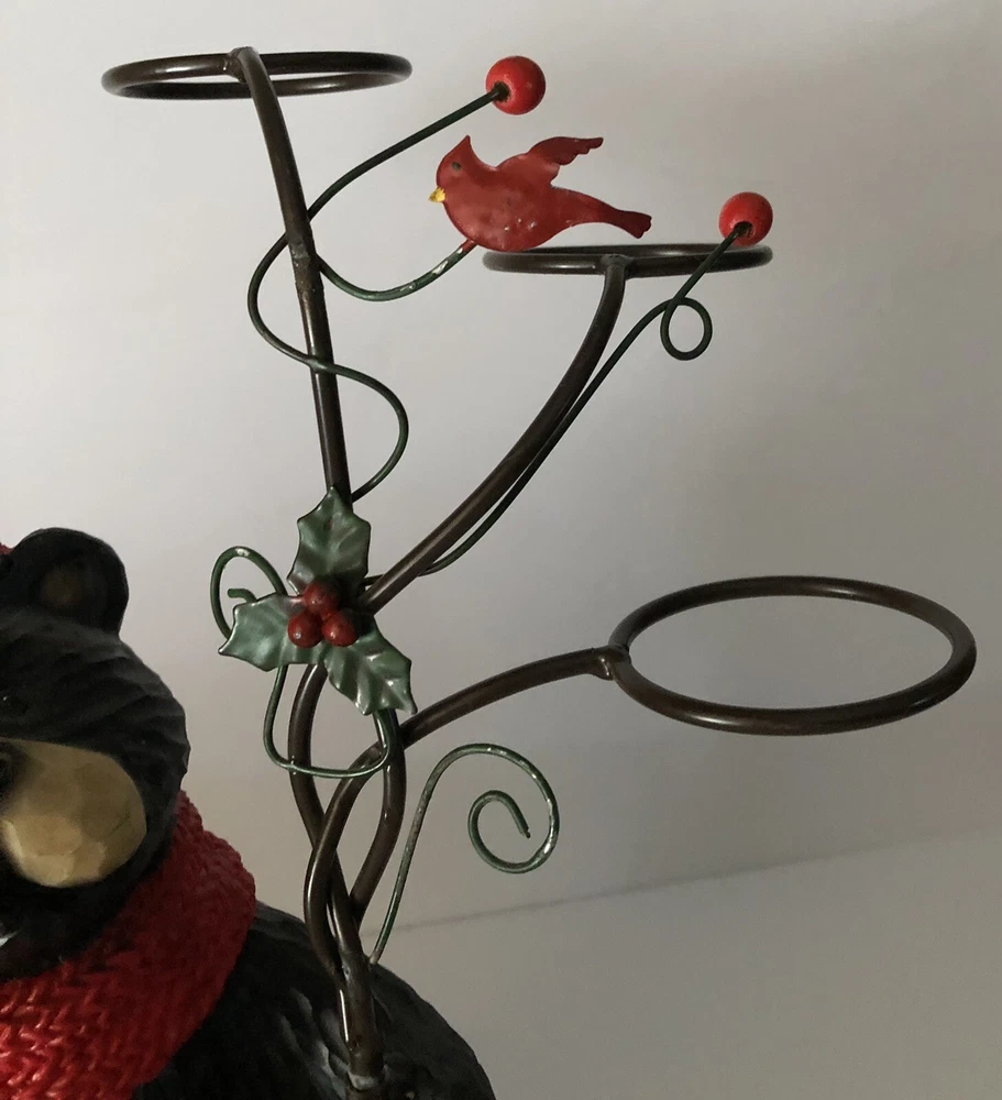 Black Bear Looking At red Cardinal Christmas candle Holder 2 pc Holiday figure. This is a 2 pc set. Tree can be removed. Bear holding tree is 12" tall. Bear without tree is 9" tall. Opening of candle holder is 2". Simply adorable holiday piece. Very nice condition. Little details like red cardinal on tree and present bear is holding make this even cuter. votives holders not included.