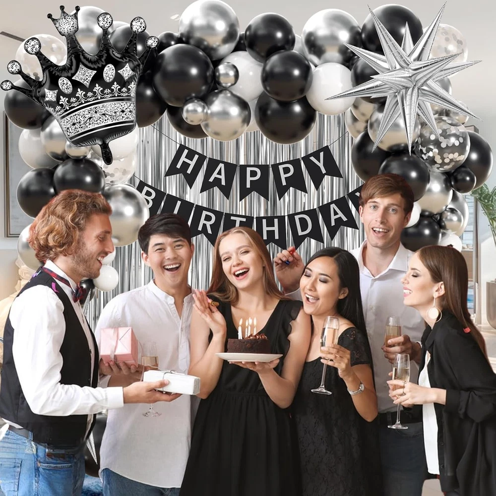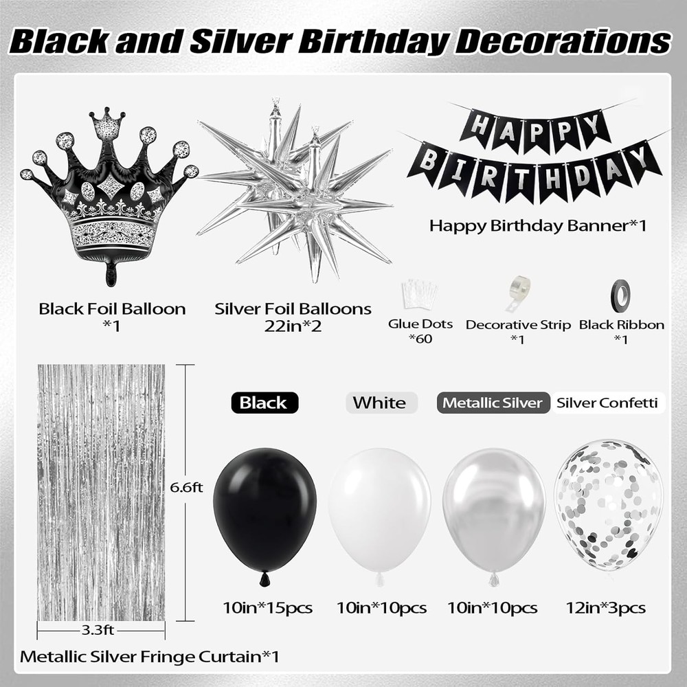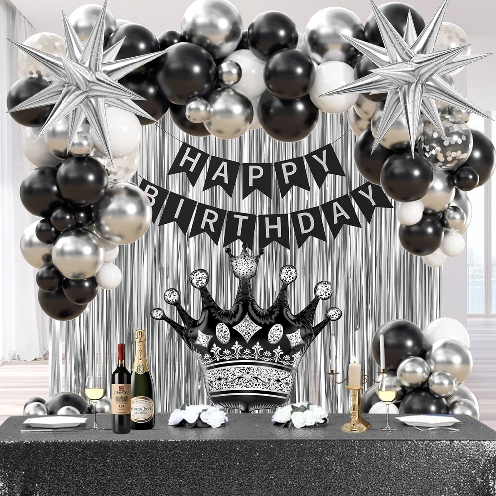 Black Birthday Decorations for Men with White Black and silver Balloons Banner Metallic Silver Fringe Curtain for 21st 25th 27th 30th 35th 40th 50th 60th Men Birthday Decorations Black Birthday Decorations for Men with White Black and silver Balloons Banner Metallic Silver Fringe Curtain for 21st 25th 27th 30th 35th 40th 50th 60th Men Birthday Decorations FREE AND FAST SHIPPING! About this item Package Included: The black and silver birthday decorations kit includes 10inch white balloonsx10, 10inch black balloonsx15, 10inch metallic silver balloonsx10, 12inch silver confetti balloonsx3, happy birthday bannerx1, black foil balloonx1,silver foil balloonsx2, metallic silver fringe curtainx1, glue dotsx60, ribbonx1, decorative stripx1 Full Birthday Decoration Set: The comprehensive black and silver party decorations kit includes a Happy Birthday banner, fringe curtain, and balloons. Great for creating a backdrop or photo booth for celebrations Easy to Use: The black and white birthday decorations bring charm to your party, creating unforgettable memories. The birthday decorations for men includes glue dots and ribbons for easy balloon arch setup. Hang banners and balloons on walls, windows, or any indoor or outdoor space you like Suitable Occasion: The black happy birthday decorations kit is great for many party decorations for men, such as black birthday party decorations for men, adults, can be used as 16th, 18th, 21st, 25th, 30th, 40th, 50th, 60th, 70th birthday party decorations Warm Tips: If there are any issue with the men birthday deorations set, we will work hard to solve them until you are satisfied Product We offer a 30-Day Return Policy on items which you are not completely satisfied with. You have the option for a full-refund or an exchange of the item. No returns are available on items shipped outside of the US . Shipping We offer Free Shipping to the US and ship within 2 business days of payment, usually sooner. We use UPS express shipping. That's why your products are usually delivered within 3 days . Contact We try our very best to make sure every customer is completely satisfied. If there's a problem , message us! We're happy to help. 24/7 live chat available.