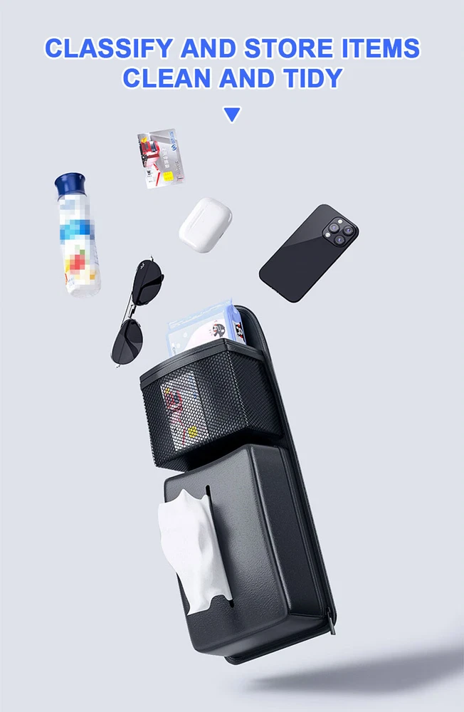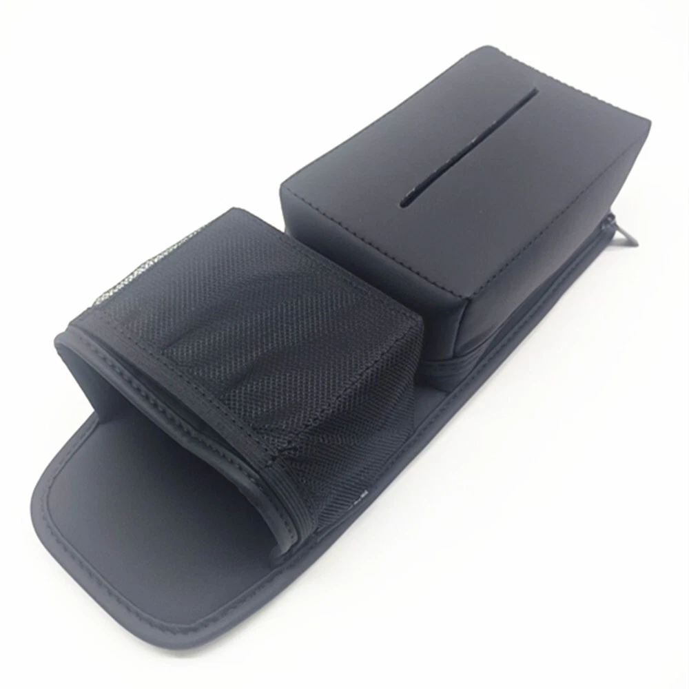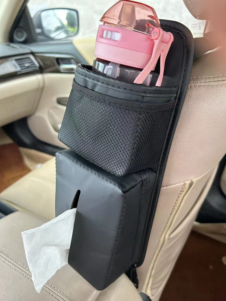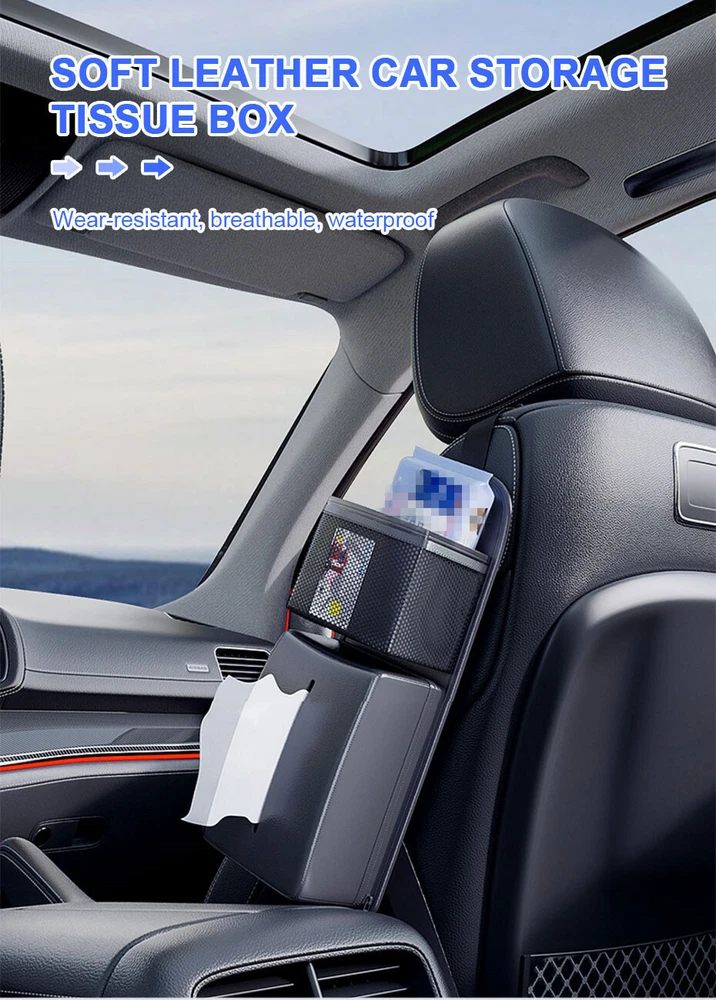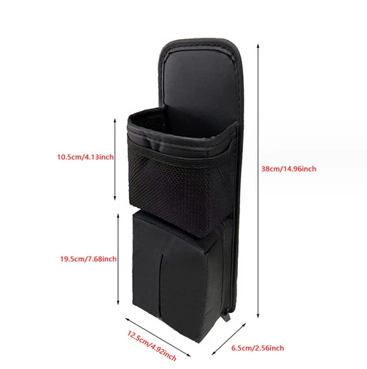 Feature: Keep your car clean, tidy and organized; Prevents things from getting lost and your vehicles interior getting damaged; Ideal for Cellphone, Keys, Cash, Cigaretes, Drinks, Tissues, Sunglasses, Bits and pieces; Compatibility: Universal for almost every cars, trucks, family or work vehicles; Specification: Product Name: Car seat side hanging bag Material: PU Leather Color: Black Quantity :1PC Packign List: 1*Storage Bag ( Excluding tissue )