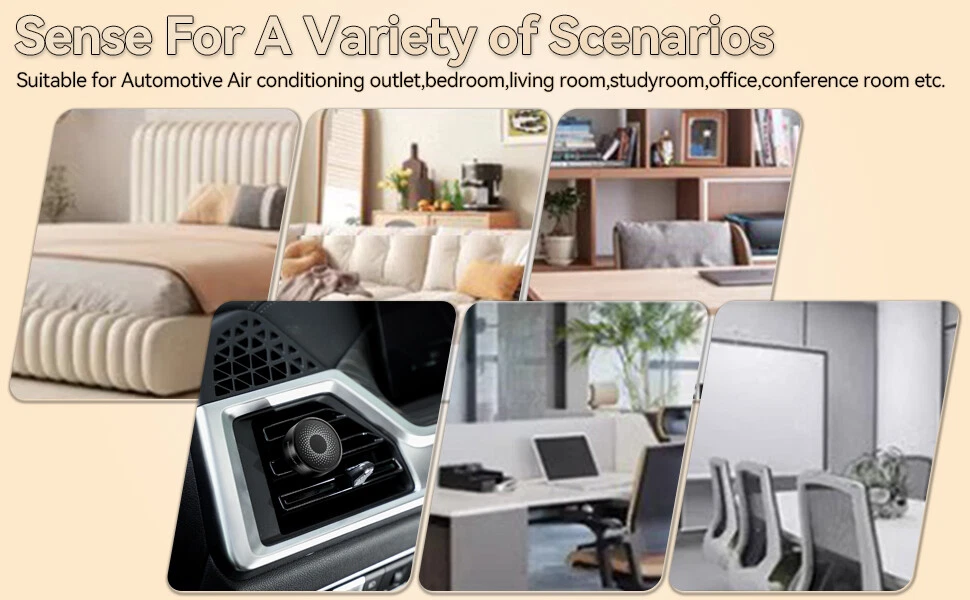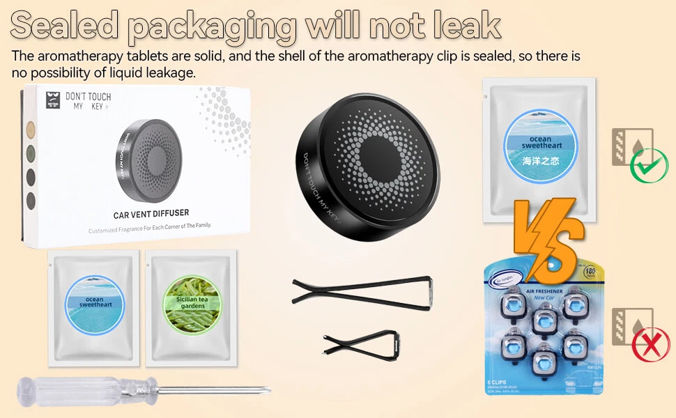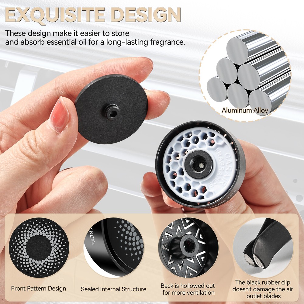 Aromatherapy Car Air Vent Diffuser Description: Natural Design: Car diffuser vent clip, with exquisite and simple appearance, is a good choice for aromatherapy lovers. High-quality material: Car diffuser vent clip is made of high-quality aluminum alloy, which is lighter than other vent clips. 70% polymer material + 30% imported essential oil stock liquid, can effectively reduce odors in the car, such as pet, smoke, etc. The aroma around you keeps you alert while driving, allowing you to enjoy a relaxing journey and bring you a good mood. Multi-purpose: Mini aromatherapy car oil diffuser vent clip, you can place it anywhere you like, such as your car, office, bathroom, and even in the closet, etc. Keep away from unpleasant odors and create a charming atmosphere. Easy to use: Simple operation, easy to carry, just assemble it and clamp it on the car air conditioning vent or any other appropriate place you like. Note: If you feel that the fragrance is a little light, you can drop your favorite essential oils, etc. Features: Easy to install. Easy to use. 100% brand new and high quality. Surface polishing. Safe to touch. Made of high-quality all-aluminum, durable. Car vent bracket, compact size. Takes up less space in the car. Purifies the air in the car, making your car more stylish and beautiful. Specifications: Material: Aluminum Alloy Felt Fragrance Sheet Color(You can choose one): Jazz Gray Jungle Green Mysterious Black Champagne Gold Package size: 150mm x 90mm x 24mm(5.91inc h x 3.54inch x 0.9 5inch) Product Size: 38 x 38mm(1.50inch x 1.50inch) Shape: Round Design: Circular spiral star surface pattern,Exquisite hollow back PE Fragrance Sheet packaging size: 79mm*57mm(3.11inch*2.24inch) PE Polymer Fragrance Sheet size: Outer diameter: 32mm(1.26inch),Inner diameter: 12mm(0.47inch), thickness: 9mm(0.35inch) Fragrance Scents:1 x Ocean Sweetheart,1 x Sicilian Tea Gardens Weight: 5g Package Included: 1 x Car Vent Diffuser Shell (Including 1 x Small Screw) 2 x Fragrance Sheets 1 x Screwdriver 1 x Long Clip 1 x Short Clip