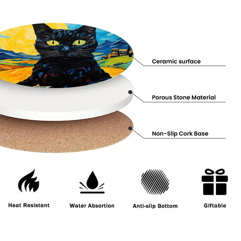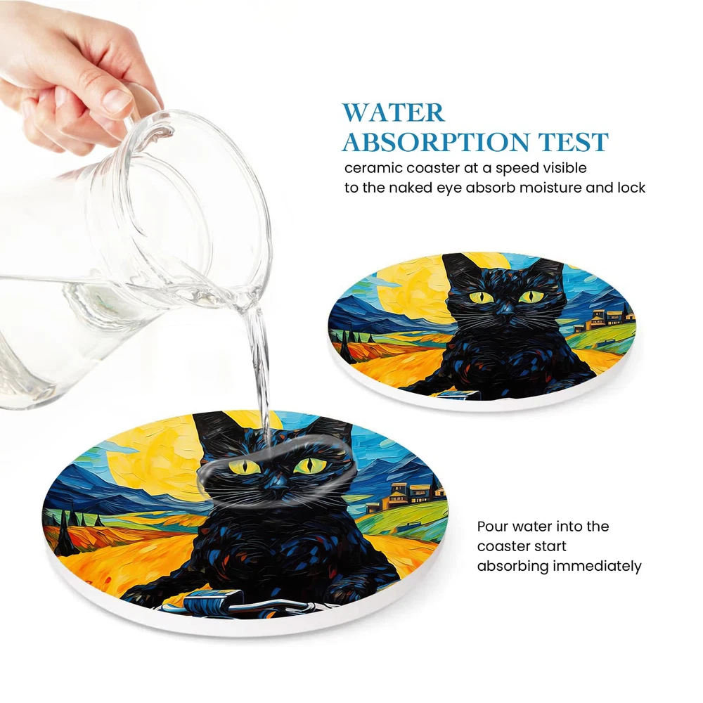【Suitable Size】6pcs round 4 inch diameter ceramic coasters match all cups, making them fit with coffee cups,mugs,tumblers,wine glasses,kids' drinks and sports bottles. 【Absorbent Ceramic Drink Coasters】Drink coaster is made of high-quality liquid-absorbing porcelain stone, which will absorb water or drink stains a few seconds and keep table dry and clean. 【Non-slip Cork Bottom】A soft cork backing attached to each coaster can effectively prevent the surfaces of your furniture from being scratched,and protect your deskstop(countertops)from heat. 【4.5 inch Metal Holder & Easy Storage】Black metal holder will storage these ingenious coasters and save the space; also save time to constantly tidy up coasters; neatly stack your coasters in this sleek coaster holder when not in use. 【Modern Exquisite Decoration】Our coasters set with Classical round shaped, perfect for all kinds occasions like coffee bar, living room,office, farmhouse,kitchen, restaurant,bars,apartment decor. Great as housewarming gifts, table decor,various holiday parties,birthday, wedding and lake house decor.