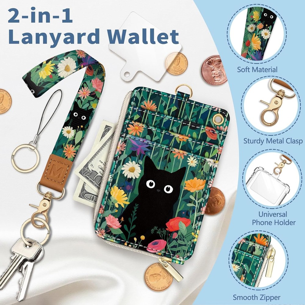 Lanyard Wallet with Id Badge Holder, Black Cat RFID Small Keychain Wallet Women Wristlet, Cute Zipper Credit Card Holder Phone Wrist Neck Strap for Key Name Tag, Teacher Student Office Gifts Lanyard Wallet with Id Badge Holder, Black Cat RFID Small Keychain Wallet Women Wristlet, Cute Zipper Credit Card Holder Phone Wrist Neck Strap for Key Name Tag, Teacher Student Office Gifts FREE AND FAST SHIPPING! About this item Unique Original Design: The 2-in-1 wallet lanyards for id badges feature a unique floral black cat design, letting you showcase your style while keeping your essentials secure, great for adding a playful yet practical touch to your everyday look. Package Included: neck lanyard x1, wrist lanyard x1, zipper id holder wallet x1, key-ring x2, phone tether tab x1 Slim Organizer Wallet: This compact card holder wallet measures just 4.72"×3.15"×0.3", fitting easily in pockets or purses for on-the-go convenience. The small credit card holder features 4 card slots, 1 clear ID window and 1 zippered coin pocket - suitable for organizing credit cards, cash, coins, IDs (including driver's licenses), and other daily essentials Multifunctional Lanyard: This versatile lanyard with id holder provides two convenient wearing styles - choose between the 21.5" neck strap or 9" wrist strap to suit different occasions. You can freely switch between these options according to your needs, whether for work, school, travel or daily activities. This id card holder with lanyard also comes with a cell phone tab and key-ring to keep your belongings safe, including cards, wallet, keys, cell phone and other everyday items RFID Blocking: This slim card holder is made with premium PU leather and tight stitching for tear resistance, featuring built-in RFID protection to safeguard your cards from both physical and digital threats. The badge lanyard is crafted from soft, skin-friendly polyester that's both lightweight and hard-wearing, ensuring comfortable all-day wear Amazing Gift: The id lanyard badge holder for women is excellent for teachers, students, drivers, office workers, nurses, doctors for daily use. Our badge wallet also make great gifts for daughters, mothers, wives, friends, on special days such as birthdays, Valentine's Day, Mother's Day, Christmas, Thanksgiving, or Teacher's Day Product We offer a 30-Day Return Policy on items which you are not completely satisfied with. You have the option for a full-refund or an exchange of the item. No returns are available on items shipped outside of the US . Shipping We offer Free Shipping to the US and ship within 2 business days of payment, usually sooner. We use UPS express shipping. That's why your products are usually delivered within 3 days . Contact We try our very best to make sure every customer is completely satisfied. If there's a problem , message us! We're happy to help. 24/7 live chat available.