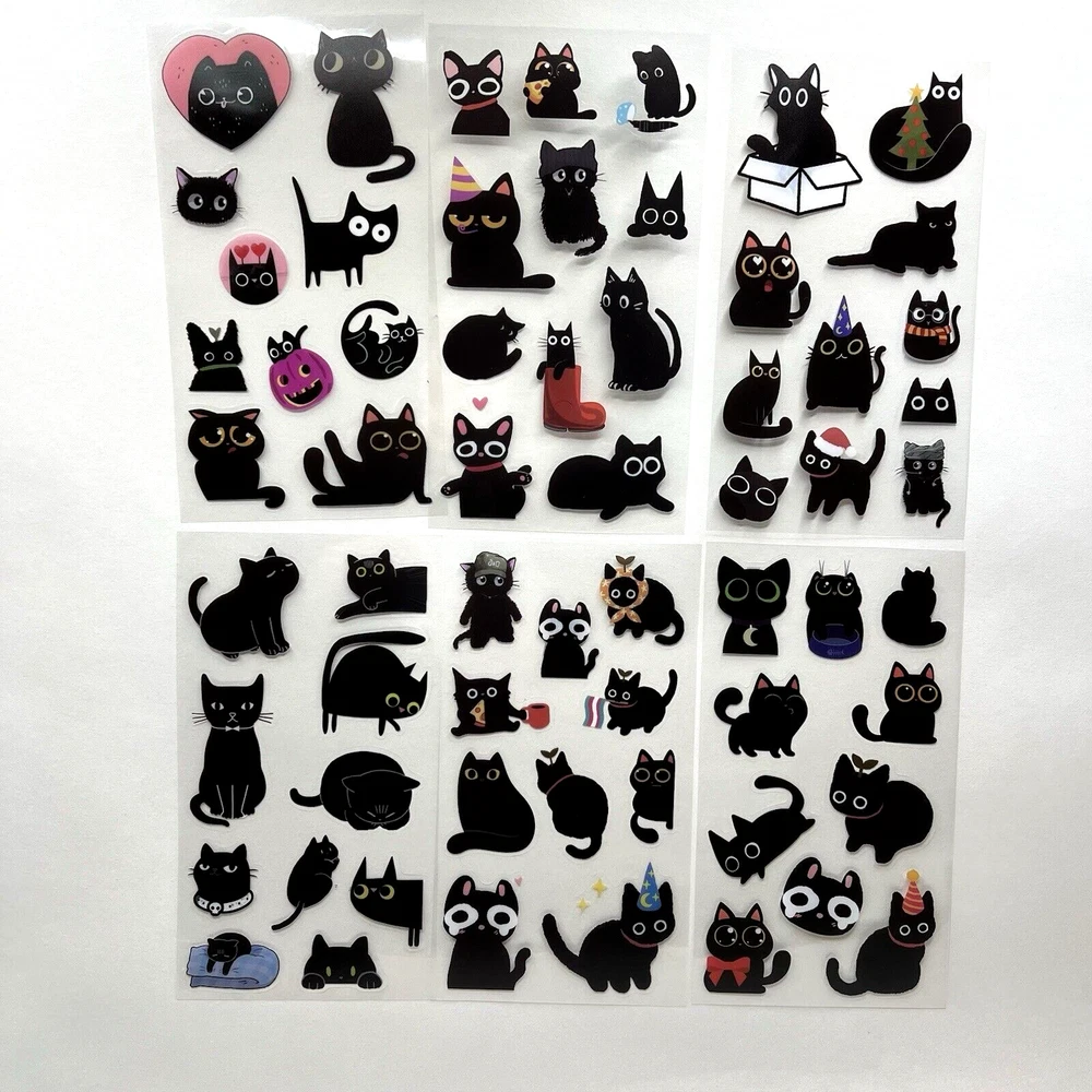 6 sheets of cute black cat stickers. All sheets are different. These are PET stickers (images are printed on clear flexible plastic with a clear peel off backing.) These stickers are kiss cut so no need for scissors. The sheets measure approx. 7 x 4 inches. I have more stickers, washi tape and paper for sale. I do combine shipping. Please put all the items you want to purchase in ONE cart and then pay. I will refund you the difference in shipping after shipping label is printed. Let me know if you have any questions through eBay messaging. Thank you for stopping by!