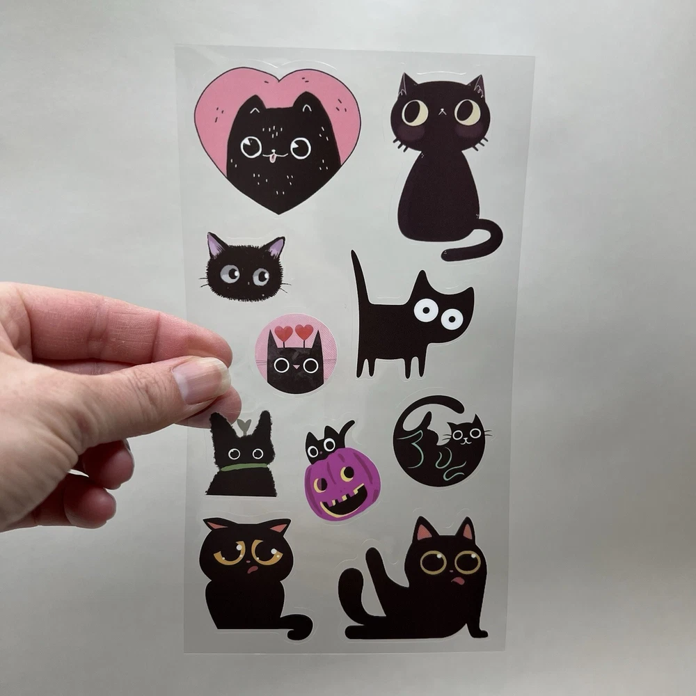 Type: PET stickers (image printed of clear flexible plastic) Theme: Cats & Kittens Color: Black