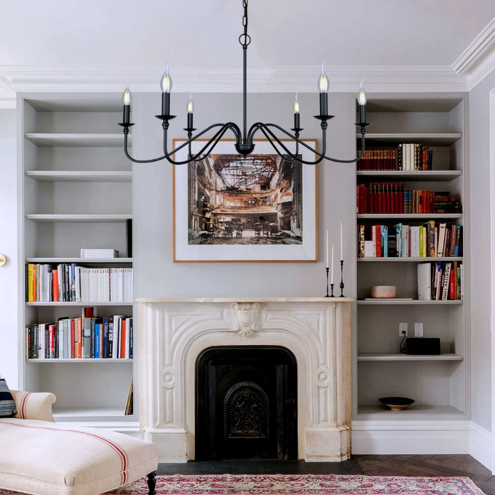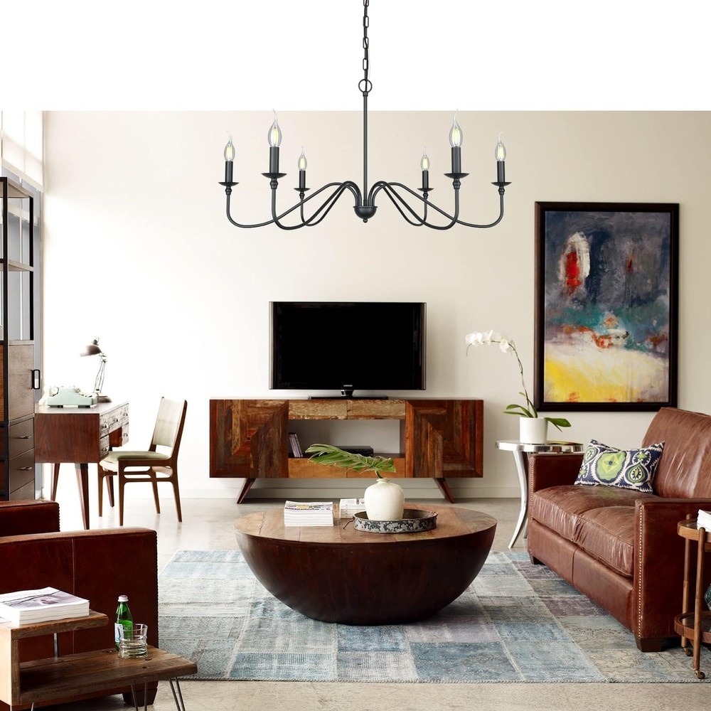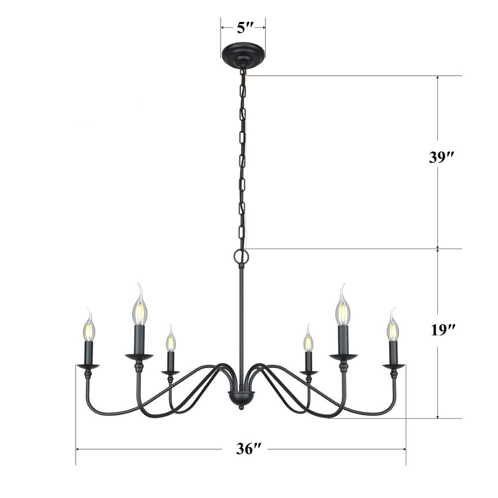 matte Black Finish 6-light can accommodate either Requires 6 E12 LED candle light (not included). This chandelier is compatible with LED bulbs. Safe packaging and easy installation.Durable/Extra Long Life/High Strength Forged Metal This chandelier is a gorgeous ceiling light. With high-quality materials and black paint finishes, the quality of vintage / country style pendant lamps is guaranteed. This country house's old industrial country chandeliers come from the Volkswagen series and are perfectly designed to illuminate your space, whether it's for a kitchen island, restaurant, step room, grower or anywhere else!