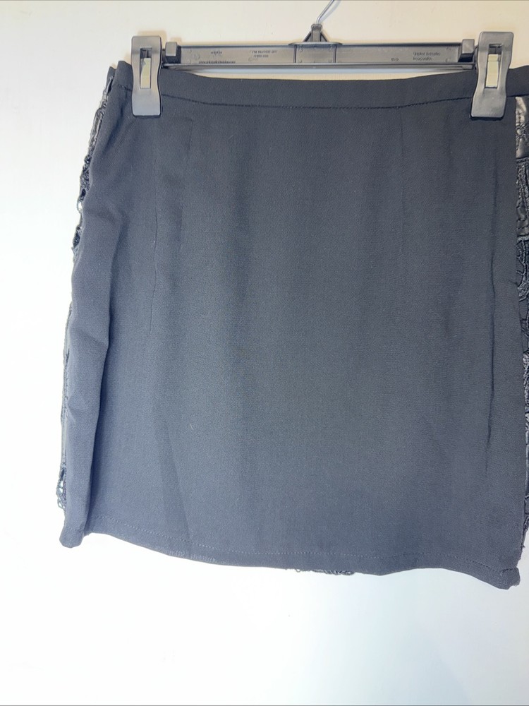 This is a Black Crochet Mini Skirt in size Small, featuring a classic, glam, formal, goth, punk, and fairy style. The skirt has a pull-on closure, is made of lace fabric with crochet and layered accents, and is lined and lightweight. It is designed with a floral pattern and is suitable for occasions like travel, parties, casual wear, workwear, or business attire during the summer or spring seasons.