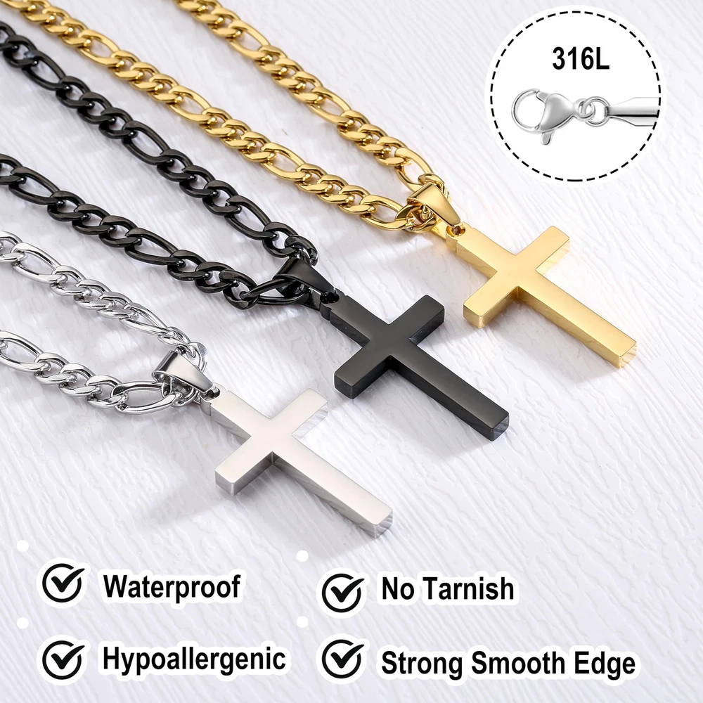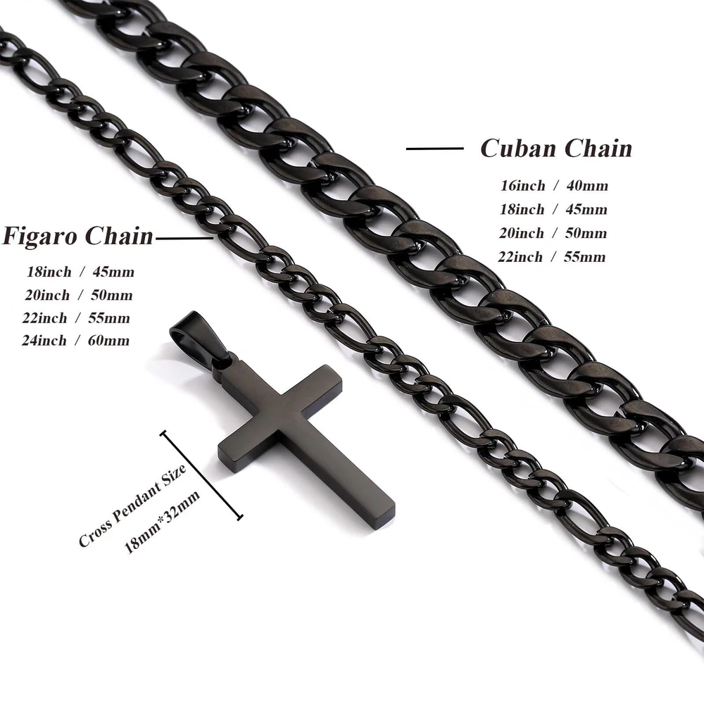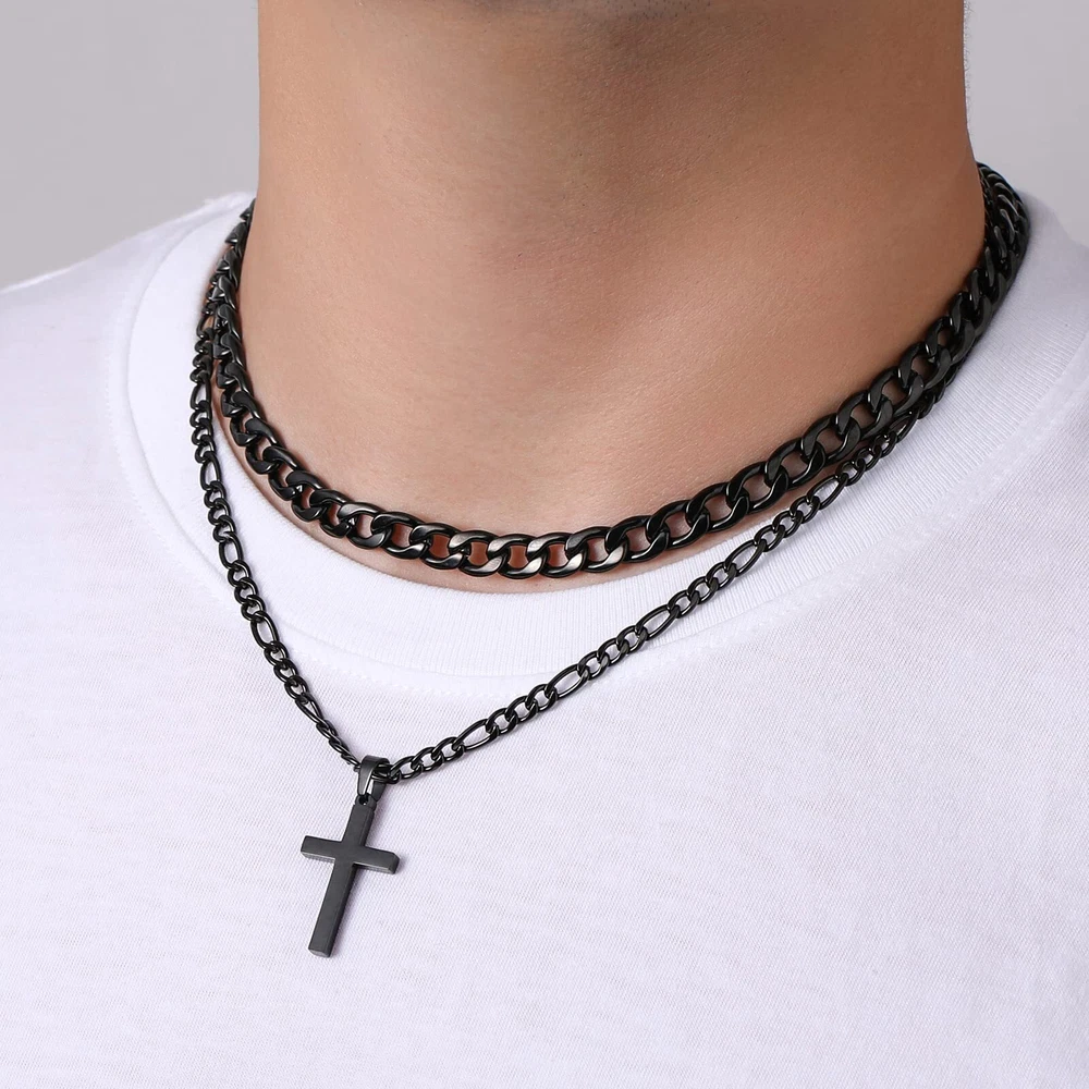 【Material】Layered cross necklace for men is made of high quality stainless steel, which is strong, durable and comfortable, resistant to corrosion, oxidation resistant, nickel and lead-free, hypoallergenic. 【Fashion Jewelry】2Pcs layered cross necklace, 20" cuban chain choker necklace, 22" figaro cross chain necklaces, you can choose to wear them alone or stacked. Both are good choices to show your personality. 【Perfect Size】Cross chain necklace suit for men and women, perfect length and size to fit many occasions. This cross necklace will make you more charming in crowded people. 【Perfect Jewelry Gifts】Cross necklace is fashionable classic Jewelry. It is an ideal choice for personal use or the best gift on thanks giving, christmas, father's day, valentine's day and other special days. 【After Sale Service】Promise 30-day products exchange and money back.If you have any question about our products,please contact us via the amazon platform.