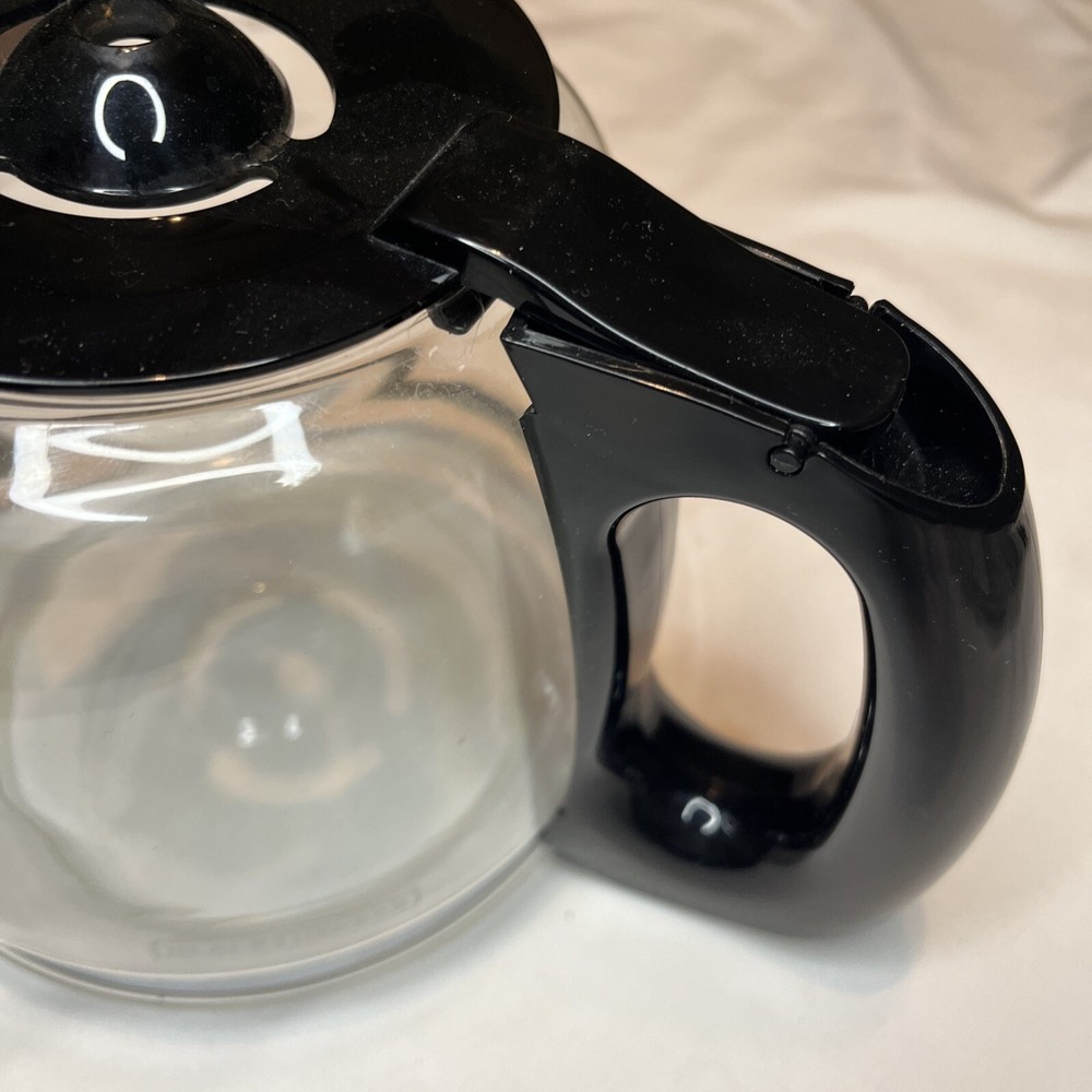 slightly used pre-owned replacement carafe or decanter fits Black and Decker automatic drip brewed coffee maker used only 6 times when the machine failed. Glass container Black plastic handle and flip lid metal retainer ring around bottom handle attachment This is a relatively clean coffee carafe as seen in pictures great replacement item for your machine