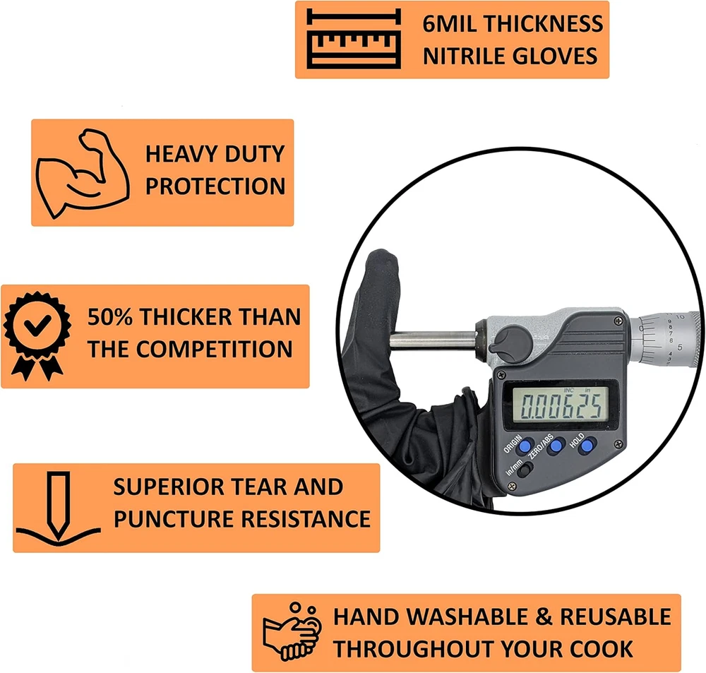Store New Arrivals Add to Favorite View Feedback Contact Black Disposable BBQ Grill Gloves Kit - 50 Heavy Duty Textured Grip and 2 Heat Resistant Reusable Liners Meat Pulling Description Department Unisex Style Fingertip Texture Package Dimensions 1 x 1 x 1 inches; 1 Pounds Size X-Large Product Description The Complete Disposable BBQ Gloves Kit Includes: 50 Heavy Duty Nitrile Black Disposable Gloves with Textured Grip 2 Washable, Reusable Cotton Glove Liners When used together, these black disposable meat gloves are heat resistant and excellent for your BBQ smoking and grill. Great for meat handling, seasoning, pulling meat, pulled pork and service. Black Disposable BBQ Gloves Kit - 50 Heavy Duty Textured Grip and 2 Heat Resistant Cooking Glove Liners for Grill BBQ Meat Gloves for Pulling Meat Additional Features for these Black Heat Resistant Cooking Gloves, Excellent Disposable Meat Gloves for Pulling Meat, BBQ, Grilling and Smoking Heavy Duty Disposable Meat Gloves Up to 100% thicker than the competition for superior tear and puncture resistance Powder free, latex free and food safe Ultra-durable comfort and protection Hand washable and reusable throughout your cook depending on your application - each box last longer than the thinner gloves! 2 Washable and Reusable Cotton Liner Gloves Included Cotton liner gloves are machine washable and reusable Wear cotton liners under the nitriles gloves for heat resistance when handling hot food Do not use with hot ashes, coals or embers Cotton glove liners are stored in the end of the box Note glove pair cuff color may be both red or both orange Food Safe, Powder Free, Latex Free Meat Gloves Food safe for prepping, handling and cutting meats and vegetables Keep your hands clean, easily change to prevent cross contamination Disposable BBQ and grill heat resistant cooking gloves with grip Superior Thickness to be Hand Washable and Reusable Hand washable and reusable throughout your cook depending on your application - each box last longer than the thinner gloves that tear easier. Wash the black cooking gloves thoroughly with soap and water then hand dry before removing to use them again in your cook. Be sure to adhere to all food safety requirements. Find The Best Fit for Your Disposable BBQ Gloves Shopping for the right size black cooking gloves should not be a challenge! To check the fit, please do the following: Using a ruler, measure the width of the palm of your hand. Check your width measurement against the table on the left. Choose the width that is larger than your measurement. The cotton inner liner glove is very stretchy. The disposable nitrile BBQ glove should be a snug fit to the inner liner and hand for the best heat resistance and grip. The length should not be an issue and is shown for reference. ABOUT US We offer the best prices around on high quality products. Our E-store includes media such as books, movies, music and games while offering electronics, toys, sporting apparel, clothing, tools, general home, garden items and more. SHIPPING We are always working hard to ensure your package arrives as soon as possible. Please understand that some factors like weather, high postal traffic, and the performance of shipping companies are outside of our control. We offer free shipping to the lower 48 states and ship within 2 business days of payment, usually sooner. We do not accept P.O. Boxes. Please provide a physical address. For shipping outside of the continental USA, we only use eBay's Global Shipping Program.The item is shipped to KY and then sent to the rest of the world. International customers are responsible for all duties and taxes. Continue to check out in order to calculate costs for shipping the item to your country. Messages regarding eBay's Global Shipping Program MUST be directed at eBay EXCLUSIVELY. RETURNS We offer a 30-Day Return Policy on items which you are not completely satisfied with. You have the option for a full-refund or an exchange of the item. No returns are available on items shipped outside of the USA. PAYMENT We accept PayPal. CONTACT US This page content is yet to come Please ad us to your favorite seller and visit again later Thank You CUSTOMER SATISFACTION We try our very best to make sure every customer is completely satisfied. If there's a problem, message us! We're happy to help. WE ACCEPT Copyright © 2021 AutoDS. | All Rights Reserved