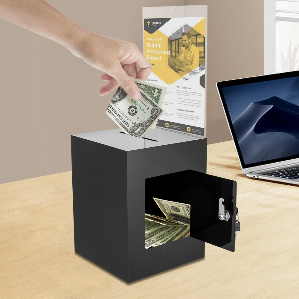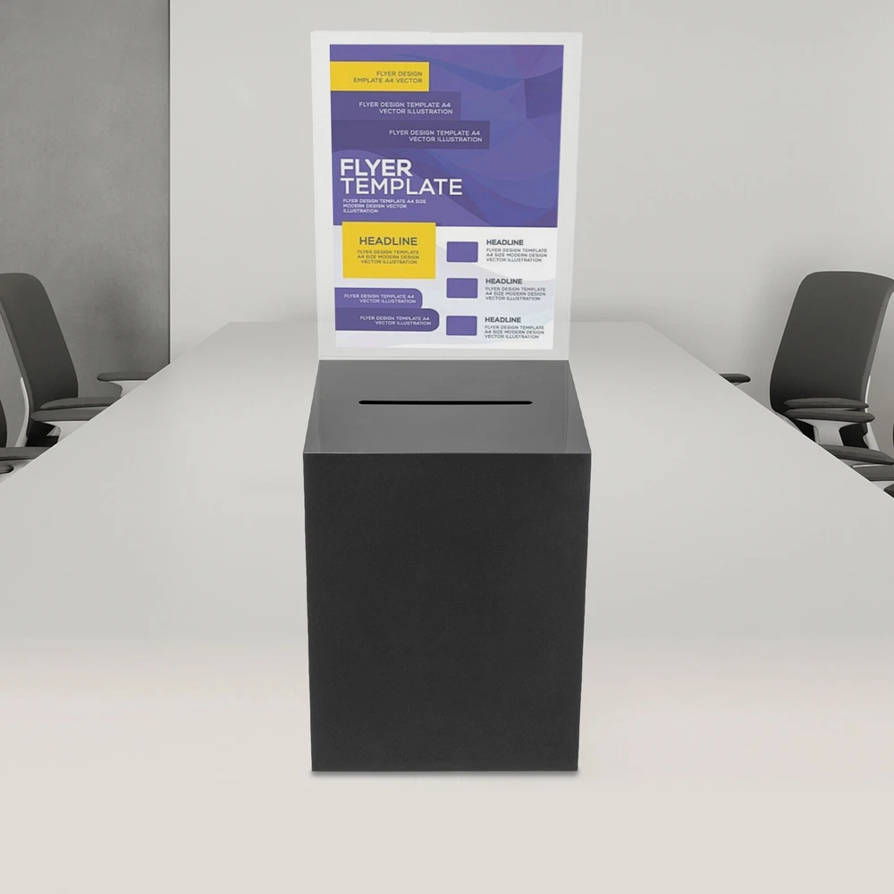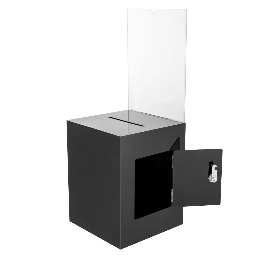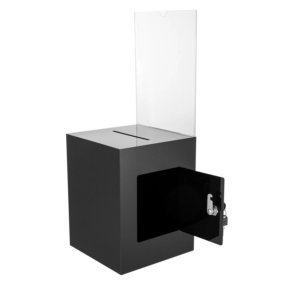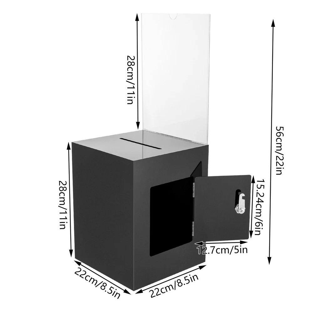 Package Included 1* Ballot Box 2* Keys Specification Color: Black Style: Modern Shape: Rectangular Material: Acrylic Process: Assembling, Bonding Assembly Required: No Mounting Type: Tabletop Lock Type: Key Number of Keys: 2 Capacity: 0.0075m³/0.26ft³ Suspended Load Capacity: 2kg/4.4 lbs Thickness: 3mm/ 0.12in Product Overall Height: 56cm/ 22in Package Size: 25*33*30cm/9.84*12.99*11.81in Box Size: 21.6*21.6*28cm/8.5*8.5*11in Box Door Size: 12.7*15.24cm/ 5*6in Sign Holder Size(L*H): 22*28cm/8.5*11in Slot Size: 100*5mm/ 3.93in*0.2in Gross Weight: 2.8kg/ 6.17lbs Net Weight: 2.3kg/ 5.07lbs Black Donation Box with Lock Ballot Box with Sign Holder Suggestion Box USA Description Voting or fundraising activities are right in front of you, but do you lack practical voting boxes? Let's take a look at our acrylic ballot box! With a lock and two keys, it can help you organize more professional voting and fundraising activities. Why wait? Choose our ballot box at the heart of your activities now! Key Features High-quality and Durable: It is made of high-quality acrylic with assembling and bonding processes, which has high tenacity and is not easy to break and deform. Suitable Size: The box size of 8.5*8.5*11 in ches provides sufficient space to accommodate items like coins and coupons while only taking a small footprint, making it a very suitable size. Professional and Modern: It can be used as a ballot box, charity box, etc., and the black, modern appearance adds a solemn and professional image to your activities. Good Protection: It has a lock with 2 keys that can prevent the loss of internal items and also provide convenience for you to take out internal items. Good Helper: With the help of this ballot box, you can easily accept the opinions of employees or customers and solve existing problems promptly, which is conducive to improving your image and providing better services for them. Easy to Clean: The smooth surface and simple structure allow you to easily remove dust from the surface with a towel. Ideal Gift: This practical product will be a wonderful surprise for your friends who need voting and fundraising activities , making their activities more professional. Buy with Confidence: We stand behind all our guests and look forward to assisting you with your purchase. It is our pleasure to answer your confusion and questions. The end of the story between us is not "we sell and you buy". Details Sign Holde r : You can insert paper with voting or donation promote information into it without the need for glue. The curved groove design makes it more convenient for you to take out the paper from the sign holder. Slot : It is convenient for you to put in letters or cards. Application It is suitable for restaurants, companies, churches, coffee shops, hotels, salons, bars, proms, parties, marketing promotions, tradeshows, exhibitions, etc., to accommodate donations, ticket comments, suggestions, coupons, ballots, notes, coins, business cards, and tips. Specification Color: Black Style: Modern Shape: Rectangular Material: Acrylic Process: Assembling, Bonding Assembly Required: No Mounting Type: Tabletop Lock Type: Key Number of Keys: 2 Capacity: 0.0075m³/0.26 ft³ Suspended Load Capacity: 2kg/4.4 lbs Thickness: 3mm/ 0.12in Product Overall Height: 56cm/ 22in Package Size: 25*33*30cm/9.84*12.99*11.81in Box Size: 21.6*21.6*28cm/8.5*8.5*11in Box Door Size: 12.7*15.24cm/ 5*6in Sign Holder Size(L*H): 22*28cm/8.5*11in Slot Size: 100*5mm/ 3.93in*0.2in Gross Weight: 2.8kg/ 6.17lbs Net Weight: 2.3kg/ 5.07lbs Package Included 1* Ballot Box 2* Keys Notes Please confirm the dimensions before purchasing. Please note this product does not include any card or money. Please allow the slight color difference caused by the shooting light and 1-3 cm error due to manual measurement, and make sure you do not mind before ordering. Payment Delivery details Terms of sales About us Contact us Payment We accept ebay payment 。 Fees such as import duties, taxes are not included in the item price or shipping costs. These charges are the buyer's responsibility. Delivery details Shipping: 2-9 working days to: USA Terms of sales We maintain high standards of excellence and strive for hundred percent customer satisfaction. Feedback is very important to us. We hope that you contact us immediately before you give neutral or negative feedback, so that we can address your concerns. It is impossible to address issues if we do not know about them! About us Your satis faction is our ultimate goal. We work hard to earn your trust and future business. Our certified technicians have tested each item before shipping. The unit comes with 1 year limited warranty on all manufacturing defects. a) If you receive a defective item, you may return it or ask for a discount. Please contact us within 14 days after you receive the package. b) What you returned must be intact and in its original packaging as re? u. Customer is responsible for shipping costs of the returned item. c) We will cover the cost of shipping back t with the shipping rate indicated in the registration page. We will send you a new unit or refund the full payment you paid. Thank you. Contact us Business Hour Business Hour: Monday To Friday: 8:30 AM to 5:00 PM (Beijing China time) Due to time zones, our reply to your questions may not be immediately. But within above working time, we will reply your email within 24 hours. If it's non-workdays, please kindly be patient and wait till Monday. Please contact us with ebay message. Please feel free to contact us if you have any questions. Monday To Friday: 8:30 AM to 5:00 PM (Beijing China time) Due to time zones, our reply to your questions may not be immediately. But within above working time, we will reply your email within 24 hours. If it's non-workdays, please kindly be patient and wait till Monday. Please contact us with ebay message. Please feel free to contact us if you have any questions. On Nov 5, 2024 at 18:28:39 PST, seller adde
