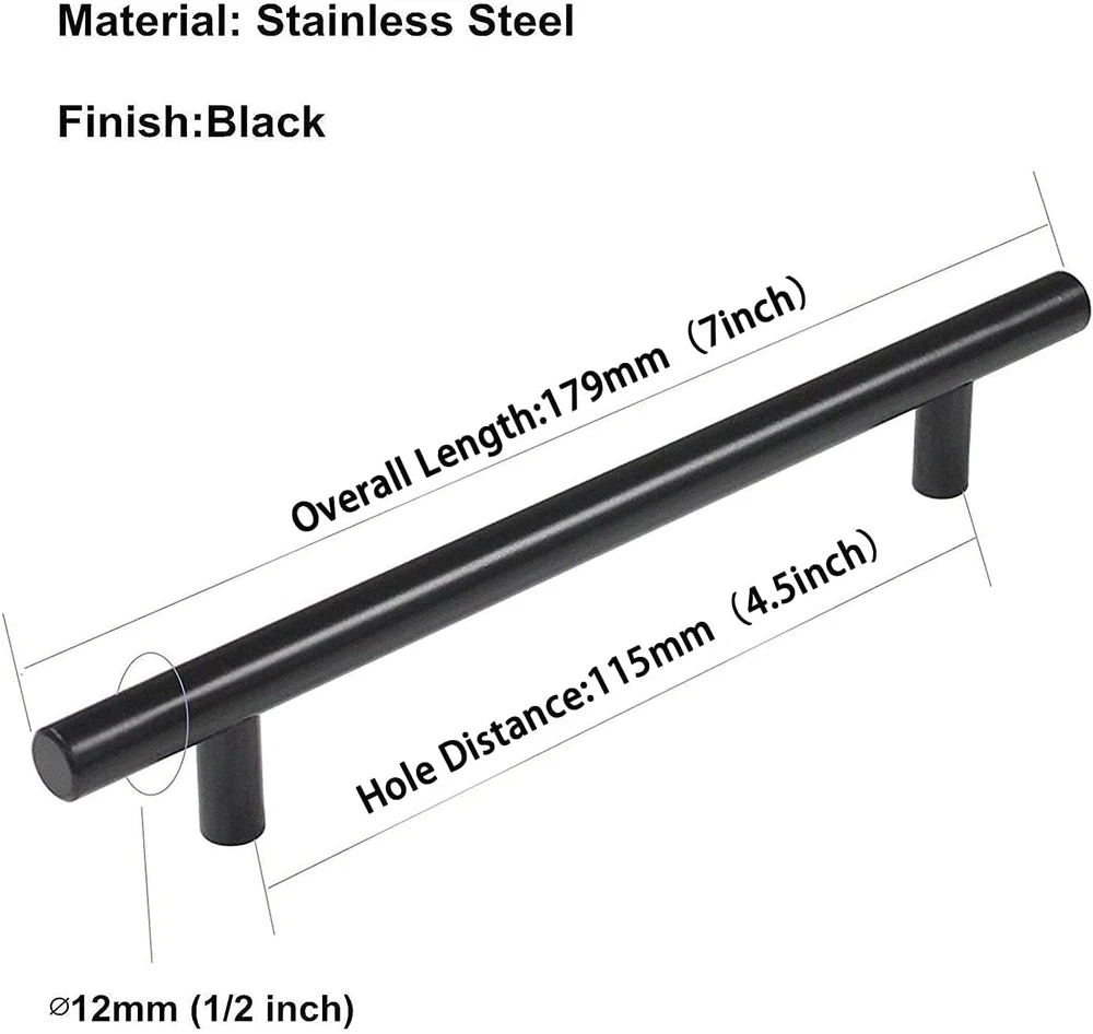 MEASUREMENTS: 4-1/2 in Center to Center with 5 in Overall Length PERFECT SERVICE: Money back guarantee, if there's any problem please feel free to contact us, we will refund every penny of your money or give you a replacement. MATERIAL & FINISHED:Black cabinet handles made of high quality Stainless Steel with Matte Black finished,they are hollow construction,lightweight but strong and durable. PACKAGE INCLUDE: Matched with standard screws(1 inch & 1.57 inch) per handlles. Every pull is individually wrapped and bagged to protect the beautiful color. WIDELY COMPATIBLE - Cabinet handles set, suitable for different styles of cabinets, wardrobe, wine cabinet, locker.