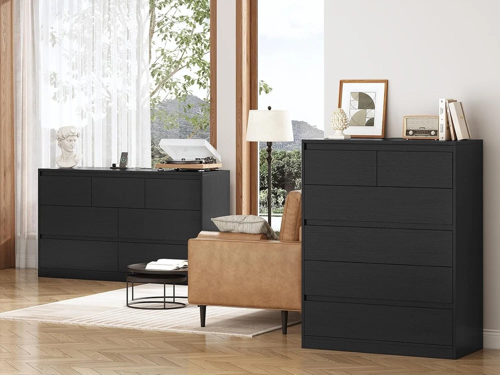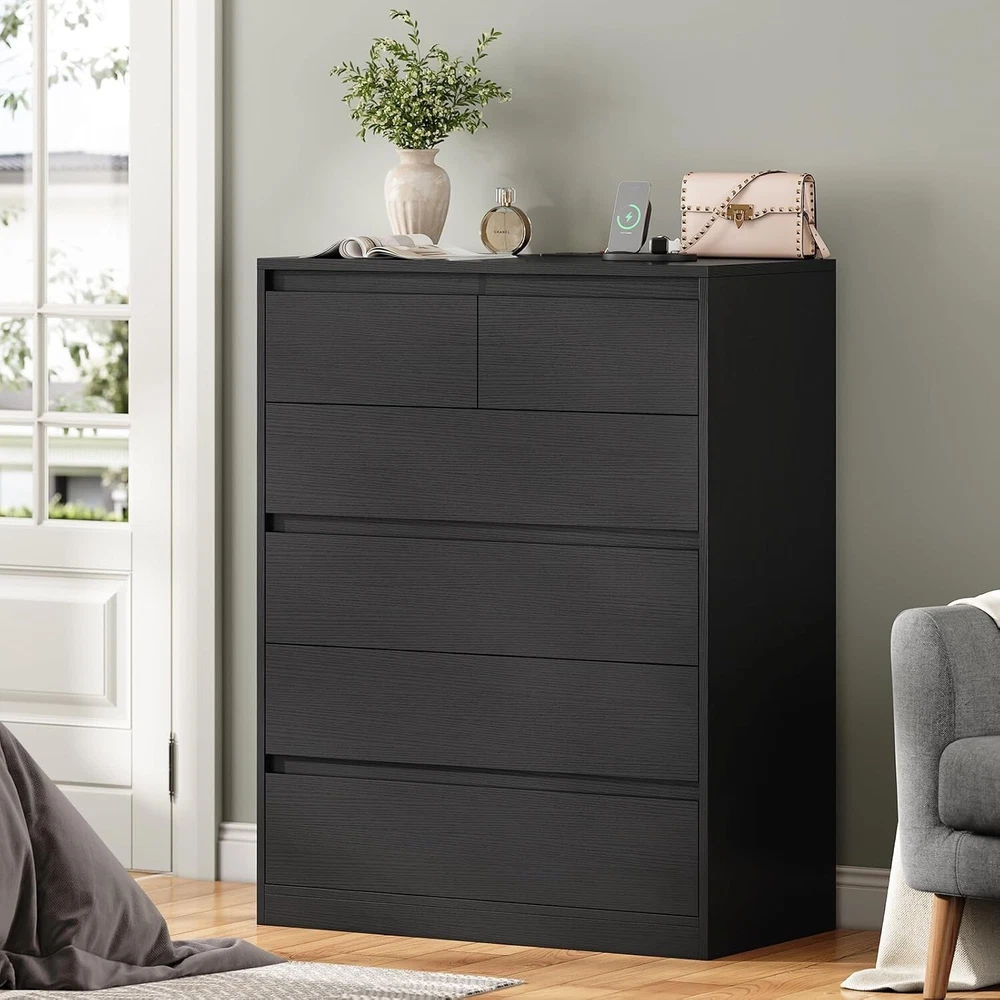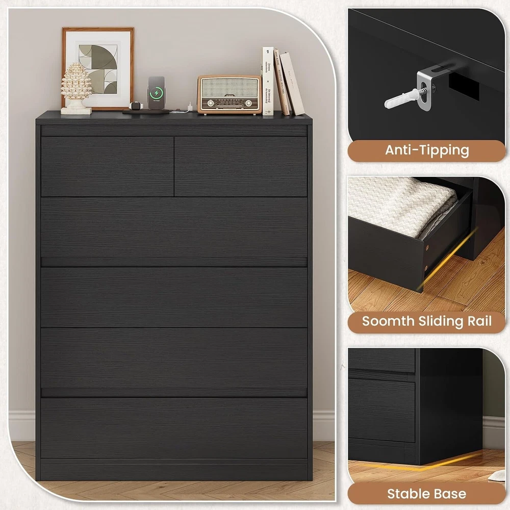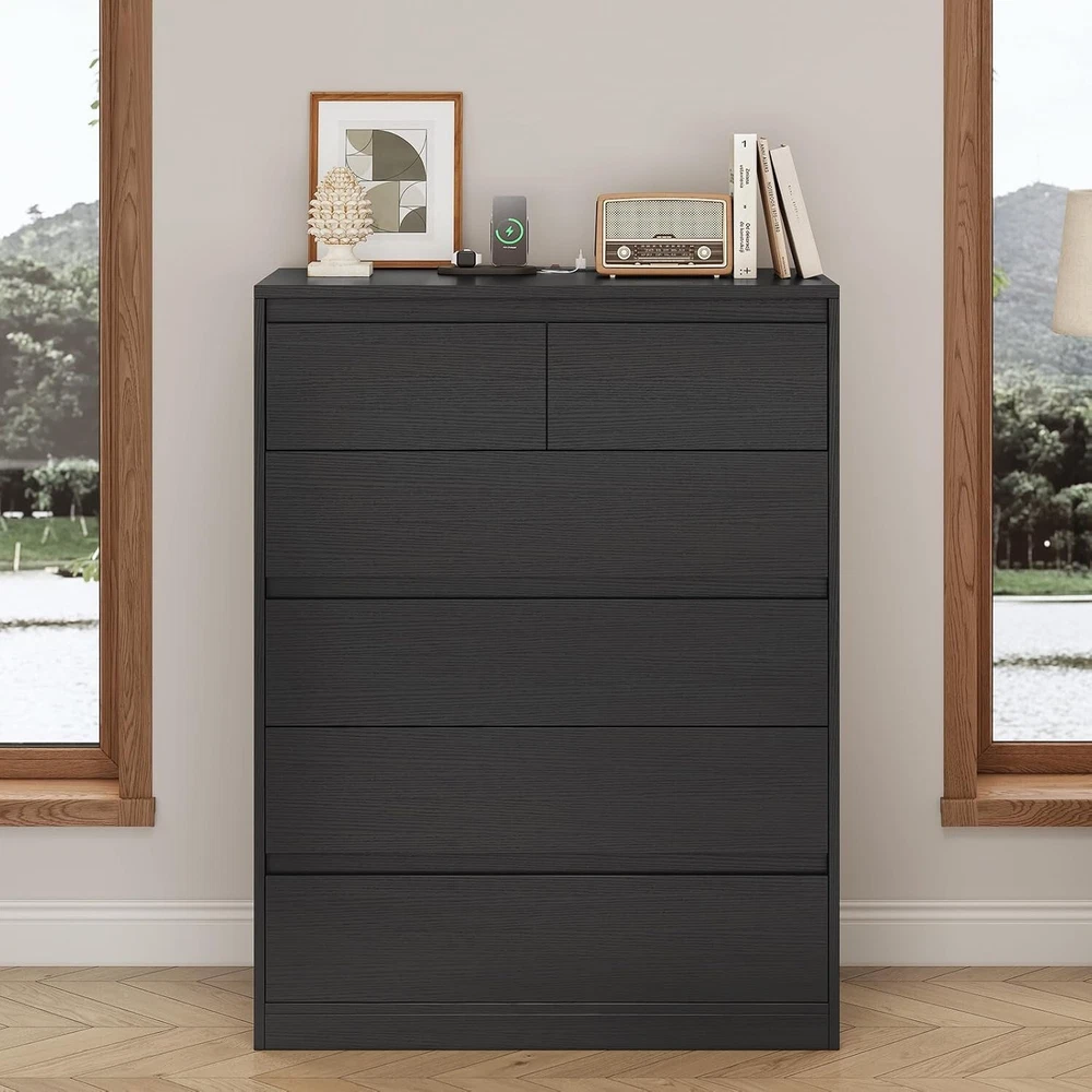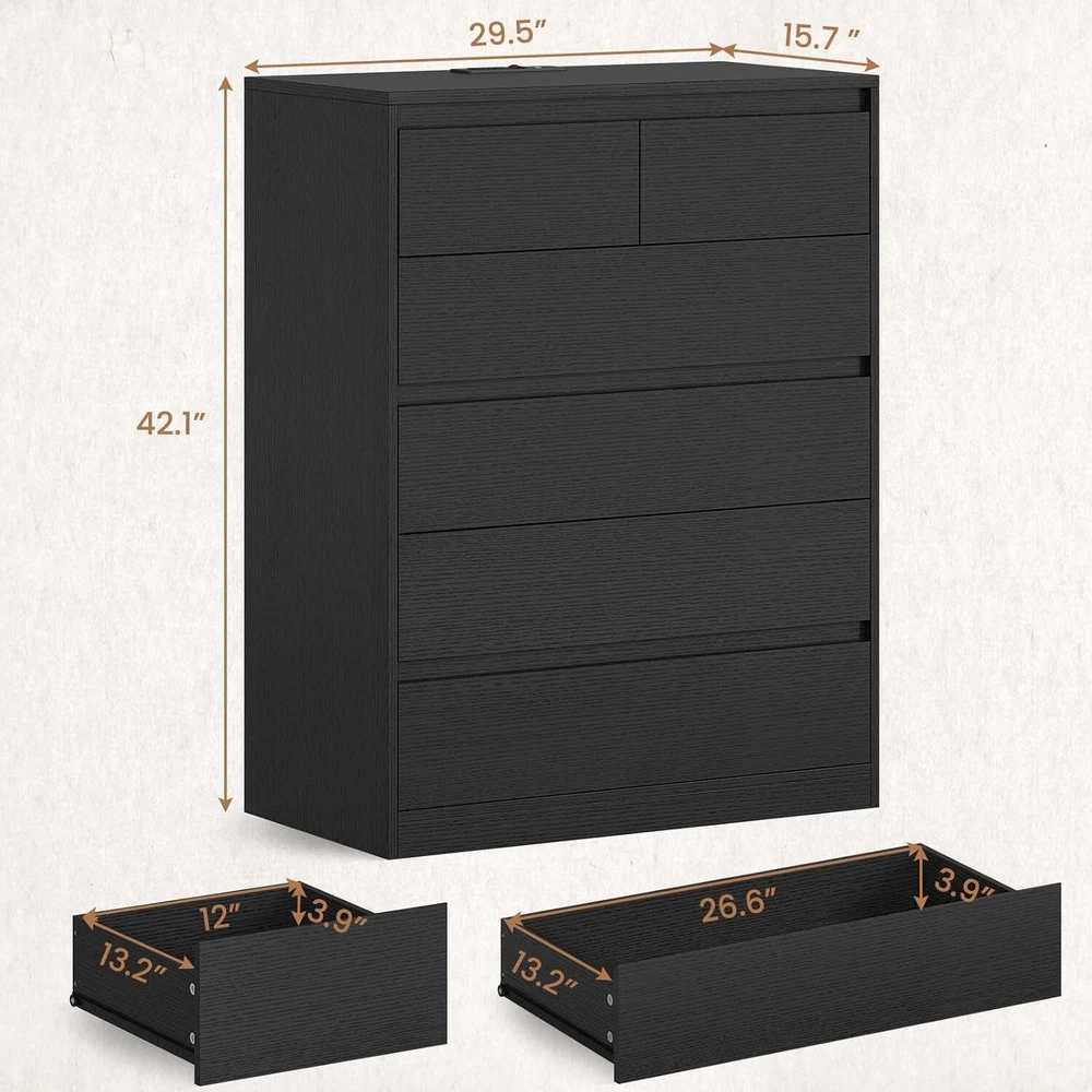 Product Description The black dresser is simple and modern in design. The simple modern style dresser is suitable for any room decor,making your bedroom or office looks more tidy and brighter.Besides, the chest of drawers comes with handle free design and a fashionable base that is both beauty and durable. The 6 drawer dresser is made of MDF to ensure stability and durability. The thickened table top and the dresser bottom can load up heavier weight. The carefully crafted design ensures long service time. The chest of drawers comes with an anti-tipping device to ensure stability and safety. The tall dressers for bedroom with 4 big drawers and 2 small drawers, providing powerful storage space to meet your organize needs. You can sort and organize your underwear, clothes, socks, toys, books, etc. You can use it to place books in the living room, or store office documents in the office. The tall dressers for bedroom with 4 big drawers and 2 small drawers, providing powerful storage space to meet your organize needs. You can sort and organize your underwear, clothes, socks, toys, books, etc. The dresser is both pretty and practical makes your room more clean and tidy. AOGLLATI black dresser for dresser includes 2 AC outlets and 2 USB ports for conveniently charging your phone, earphone, laptop ,desk lamp. if you don't have a lot of outlets in your room ,The charging station will make your charging more convenient.
