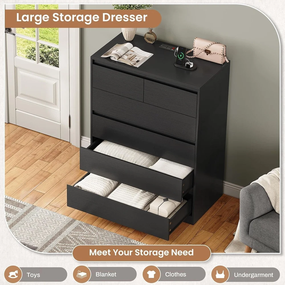 Black Dresser for Bedroom, Modern Tall Dresser with 6 Drawers & Charging Station