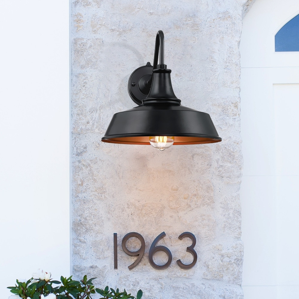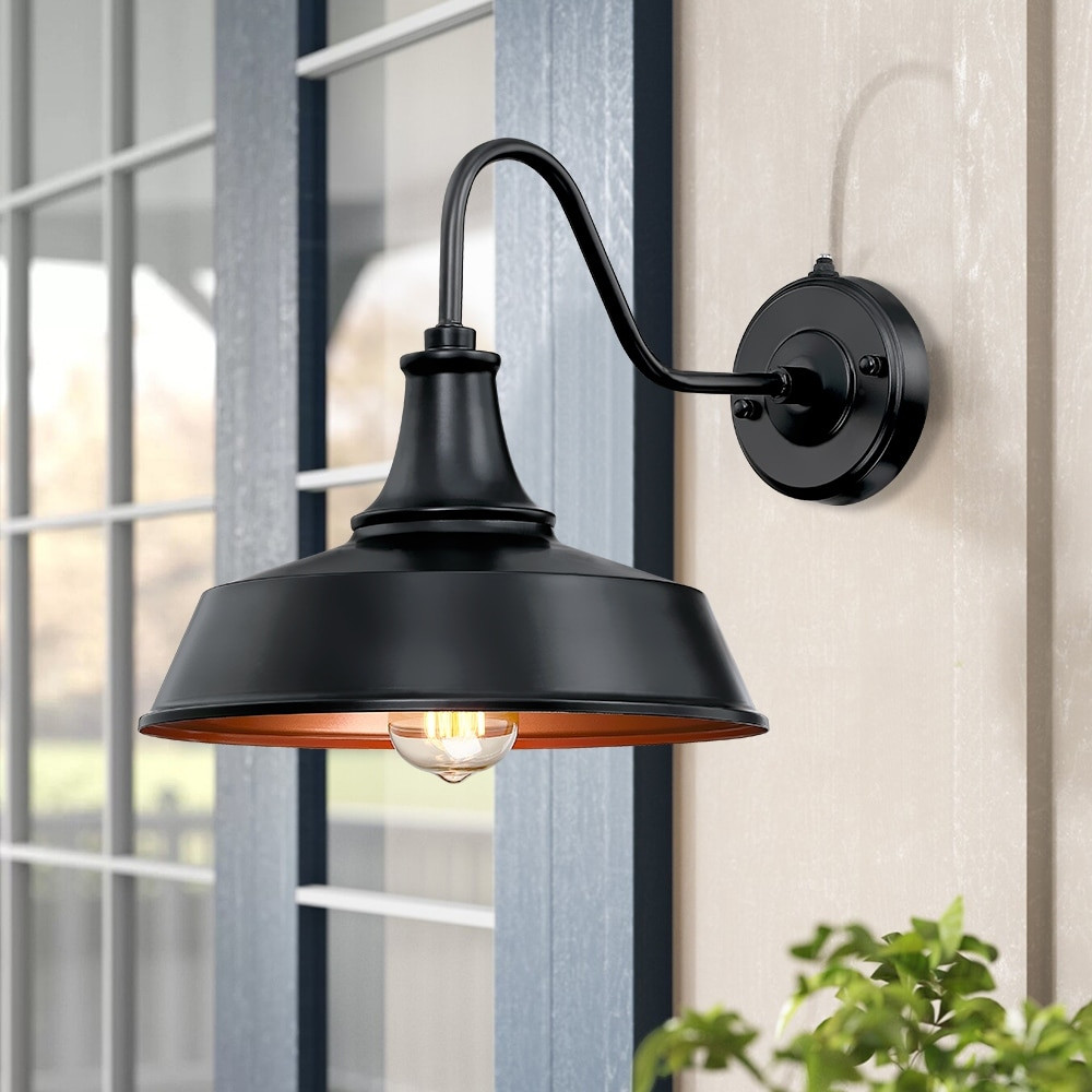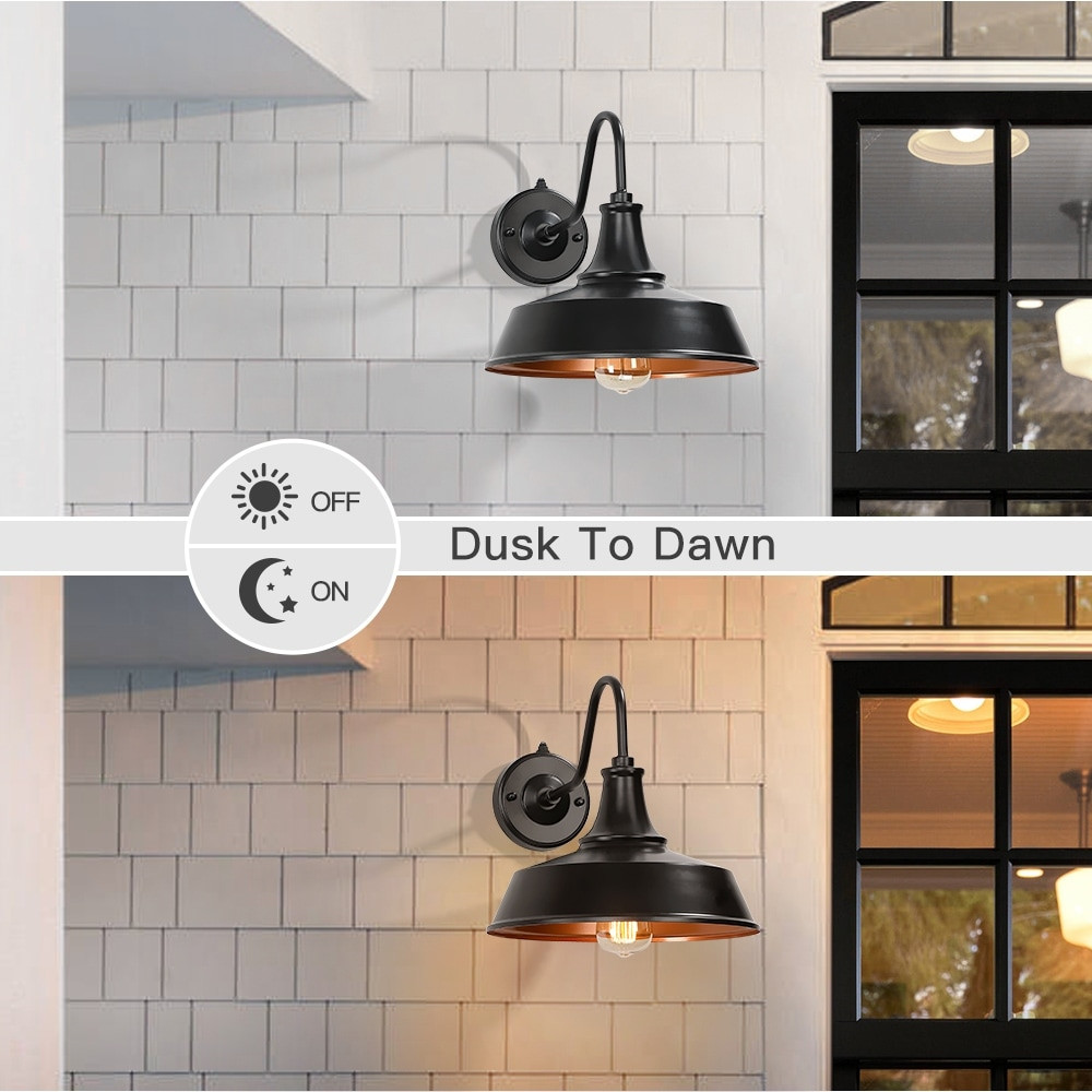 This farmhouse barn style outdoor wall mounted sconce light features a gooseneck and dark sky metal shade, finished in matte black and copper inside, weather-resistant and rust proof. It is an ideal outdoor wall light selection for front doorway, porch, driveway, backyard or garage to enhance vintage, farmhouse, rustic, or even coastal looks. It features a built-in dusk to dawn auto sensor which enables the fixture to automatically light on at dusk and off at dawn ETL listed for wet location. Weather-resistant & Anti-rust. Built-in dusk-to-dawn photocell controller provides nighttime-on, daytime-off for energy saving and convenience. E26 medium base socket, (1) 60-Watt MAX incandescent bulb or DIMMABLE LED bulb(not included) Hardware included for an easy setup Fixture is Free Shipping Over $49.99* Details 1-Light Black Dusk to Dawn Outdoor Wall Sconce Barn Light - 12"W Product Description: This farmhouse barn style outdoor wall mounted sconce light features a gooseneck and dark sky metal shade, finished in matte black and copper inside, weather-resistant and rust proof. It is an ideal outdoor wall light selection for front doorway, porch, driveway, backyard or garage to enhance vintage, farmhouse, rustic, or even coastal looks. It features a built-in dusk to dawn auto sensor which enables the fixture to automatically light on at dusk and off at dawn ETL listed for wet location. Weather-resistant & Anti-rust. Built-in dusk-to-dawn photocell controller provides nighttime-on, daytime-off for energy saving and convenience. E26 medium base socket, (1) 60-Watt MAX incandescent bulb or DIMMABLE LED bulb(not included) Hardware included for an easy setup Fixture is constructed from metal to ensure a long product lifespan Fixture dimensions11.5"H x 12"W x 18"E. Round backplate4.7 in. W Clear glass shade allows for maximum illumination Lantern style offers a transitional look, Ideal for Decks, Porch, Patio and Garage Before cleaning any lamp shade or fixture, disconnect the power source, wipe with a soft, dry cloth, avoid the use of chemicals and household cleaners as they may damage the finish Warranty1-Year limited warranty. Write to us if you need product support or product received defective, we'll response within 24hrs to help troubleshoot and/or provide replacement & satisfying solutions.