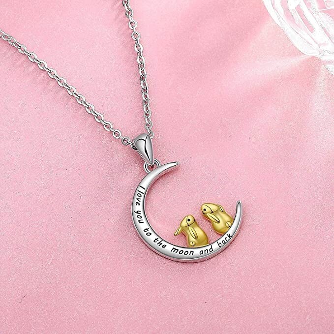 GIFT BOXED Includes a Quote card, Necklace, Velvet Gift pouch and a polishing cloth. Fantastic High Quality Gorgeous Necklace with gold bunnies on a moon with inscribed 'Love you to the moon and back' Pendant Size : Approx 2.5cm Chain :18 inches Totally unique *it's a costume jewellery. Crazy promotional price for limited period!