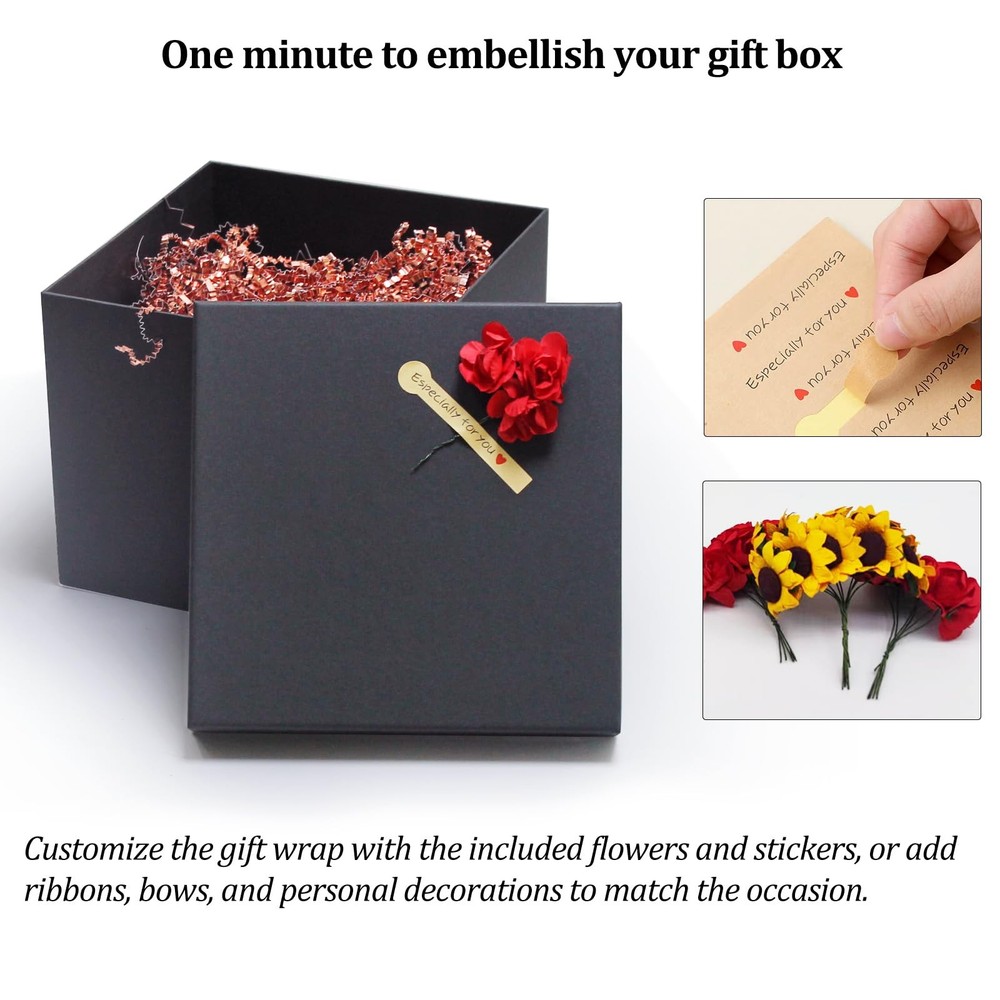 Enhance your gift-giving experience with our Premium Nested Black Gift Boxes with Lids. This set of 5 square gift wrap boxes offers a range of sizes to accommodate various presents, from small trinkets to larger items. The sizes included are: 9 x 9 x 7.2 inches, 8 x 8 x 6.5 inches, 6 x 6 x 5.5 inches, 4.7 x 4.7 x 4.7 inches, and 4.3 x 4.3 x 4.1 inches. Crafted from high-quality, sturdy cardboard, these black gift boxes ensure your gifts are securely and elegantly wrapped. Each set includes decorative paper flowers and stickers, allowing you to add a personal touch to your presents. Durable and reusable, these gift boxes are an eco-friendly choice for any occasion, whether it’s a birthday, wedding, anniversary, or holiday. Make your gifts stand out with our stylish and versatile gift boxes. Assorted Sizes Boxes for gifts: This set includes 5 nested gift boxes in sizes: 9x9x7.2, 8x8x6.5, 6x6x5.5, 4.7x4.7x4.7, and 4.3x4.3x4.1 inches; whether large or small present, these gift boxes with lids have you covered Elegant Presentation: These black gift boxes for presents are well made and beautiful; our square gift boxes come with decorative paper flowers and stickers, adding a personal touch to your gift presentation Sturdiness and Protection: Our square gift boxes for presents are made of durable cardboard; these gift wrap boxes are designed to be durable and reusable, making them a practical choice for gift wrapping Pre-Wrapped Gift Boxes with Lids for Presents: These pre-wrapped boxes are ready to use right out of the package, eliminating the need for assembly; each set includes decorative paper flowers and stickers, allowing you to customize your gift boxes for presents Perfect for All Occasions: These square gift boxes can be used for gift giving, giveaways, and packaging boxes for gifts, they are ideal for Birthday, Party, Wedding and holidays such as Halloween, Christmas, New Year, Valentine's Day, etc