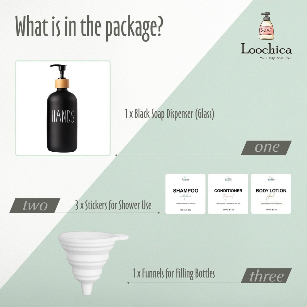 Black Glass Kitchen Soap Dispenser, Detergent Dispenser or Hands Soap Dispenser for Kitchen Sink, Black Soap Dispenser, Modern Farmhouse Decor Dish Soap Pump for Kitchen Organization - Buy Now with Fast Shipping! Black Glass Kitchen Soap Dispenser, Detergent Dispenser or Hands Soap Dispenser for Kitchen Sink, Black Soap Dispenser, Modern Farmhouse Decor Dish Soap Pump for Kitchen Organization Product Details Color: C03-black-hands Material: Without Tray Brand: Loochica Product Dimensions: 3.94"L x 7.48"W x 7.8"H Shape: Round Color: C03-black-hands Material: Without Tray Brand: Loochica Product Dimensions: 3.94"L x 7.48"W x 7.8"H Shape: Round Number of Sets: 2 Number of Items: 2 Item Weight: 11.3 ounces Manufacturer: Loochica Direct Country of Origin: China Item model number: LLCSD Date First Available: November 1, 2022 Key Features ✅ HANDS Black Dispenser For Kitchen Use - Bottle contain Hands mark on the bottle. If you are having problems mix up or get asked Which Soap is Which?", this would solve this problem well. The label is not only good for distinction glass soap dispenser with pump but also looks elegant. ✅ VERSATILE & REUSABLE for BATHROOM USE - Each package comes with 3 stickers-"Shampoo", "Conditioner" and "Body Lotion". Our soap dispensers can be changed to Bathroom/Shower use by covering marks with our srickers. ✅ PREMIUM QUALITY & DURABLE- This soap dispenser set is made of thick quality glass, matched with a bamboo soap dispenser pump. Our soap dispensers are durable for years. Premium 2CC pump provides more liquids per press. ✅ FARMHOUSE STYLE For Special Decoration- These dish soap dispensers for kitchen/bathroom are both decorative and practical. Whether you're looking for any farmhouse decor for the kitchen or farmhouse soap dispenser, this hand and dish soap dispenser set adds that special touch to everyone's kitchen. ✅ Extra Funnels to Filling the Bottle - Having problems filling soap dispenser bottles? Each package come with one extra funnels, which would help filling or refilling bottle with different liquids. Get our products and find it out! Product Description