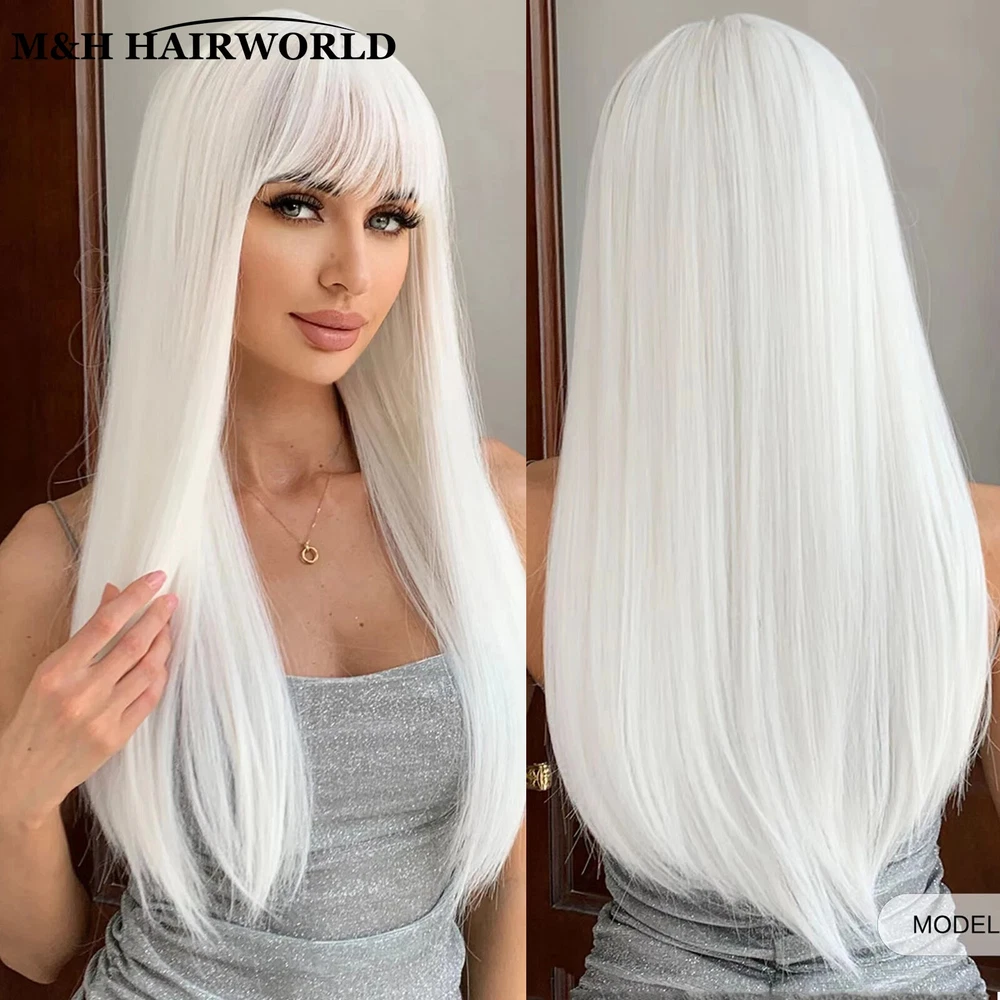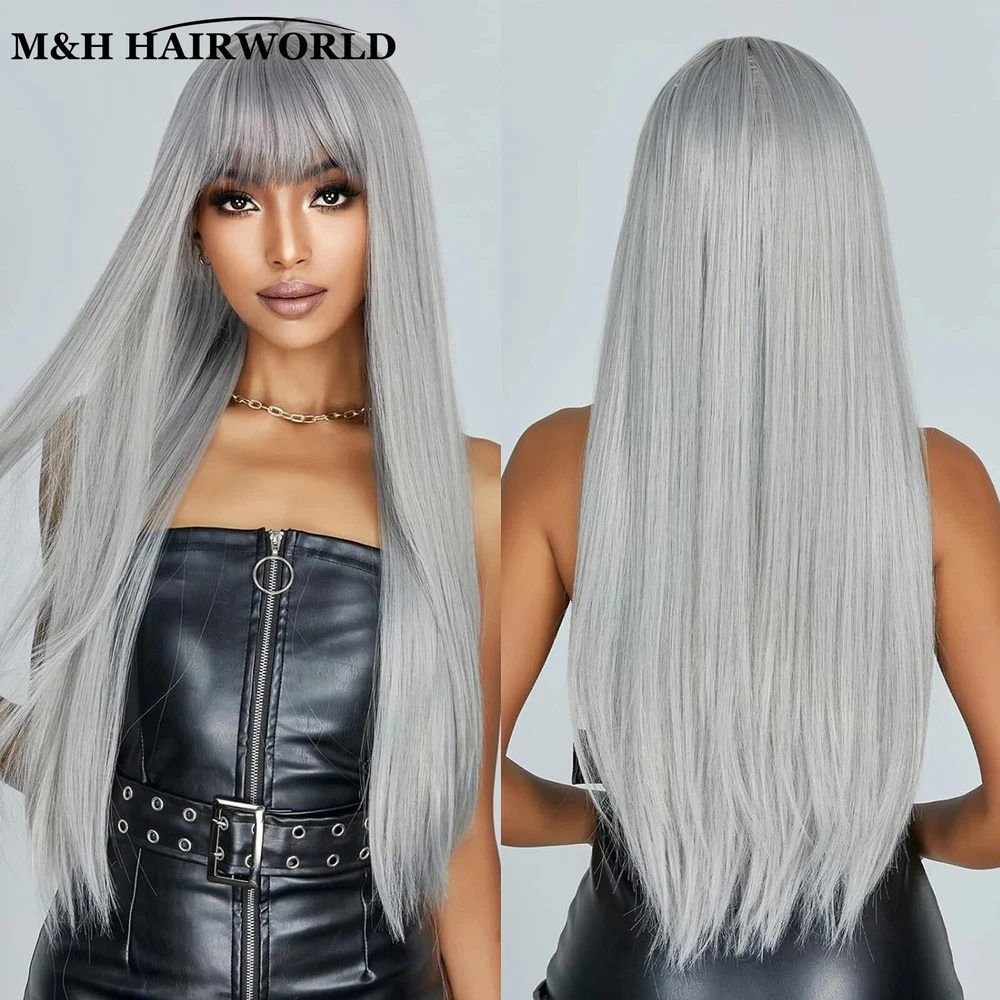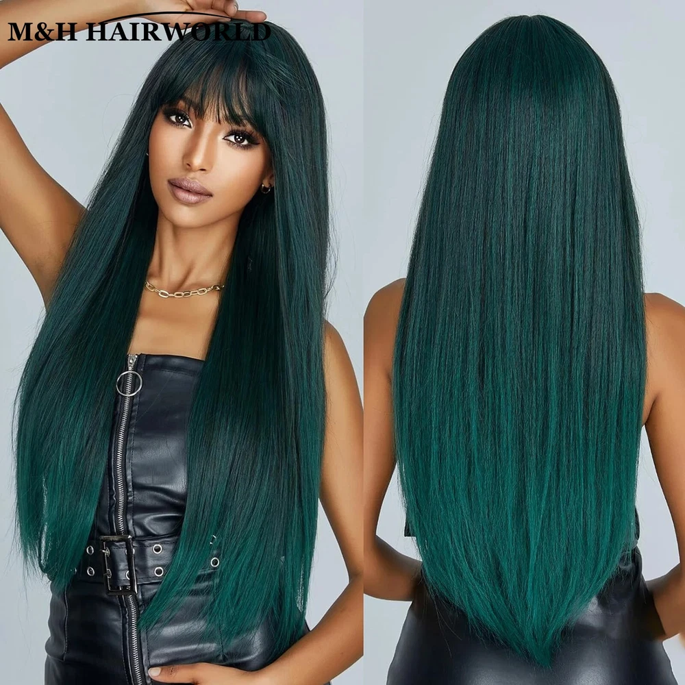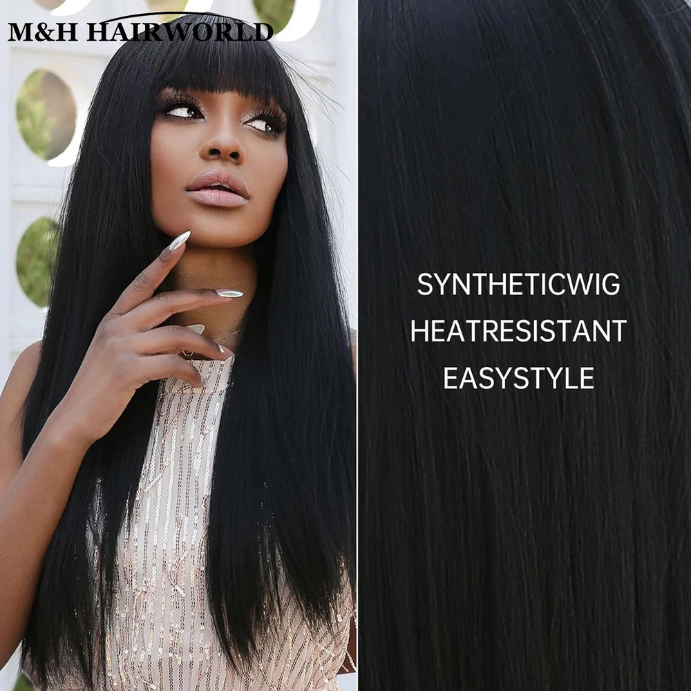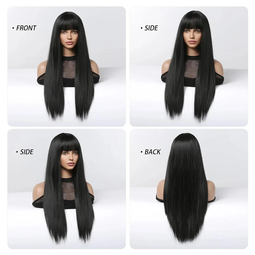 Black Colored Synthetic Hair Wigs For Women Long Silky Straight Hair Wig With Bangs Glueless Wigs For Daily Party Cosplay Wear